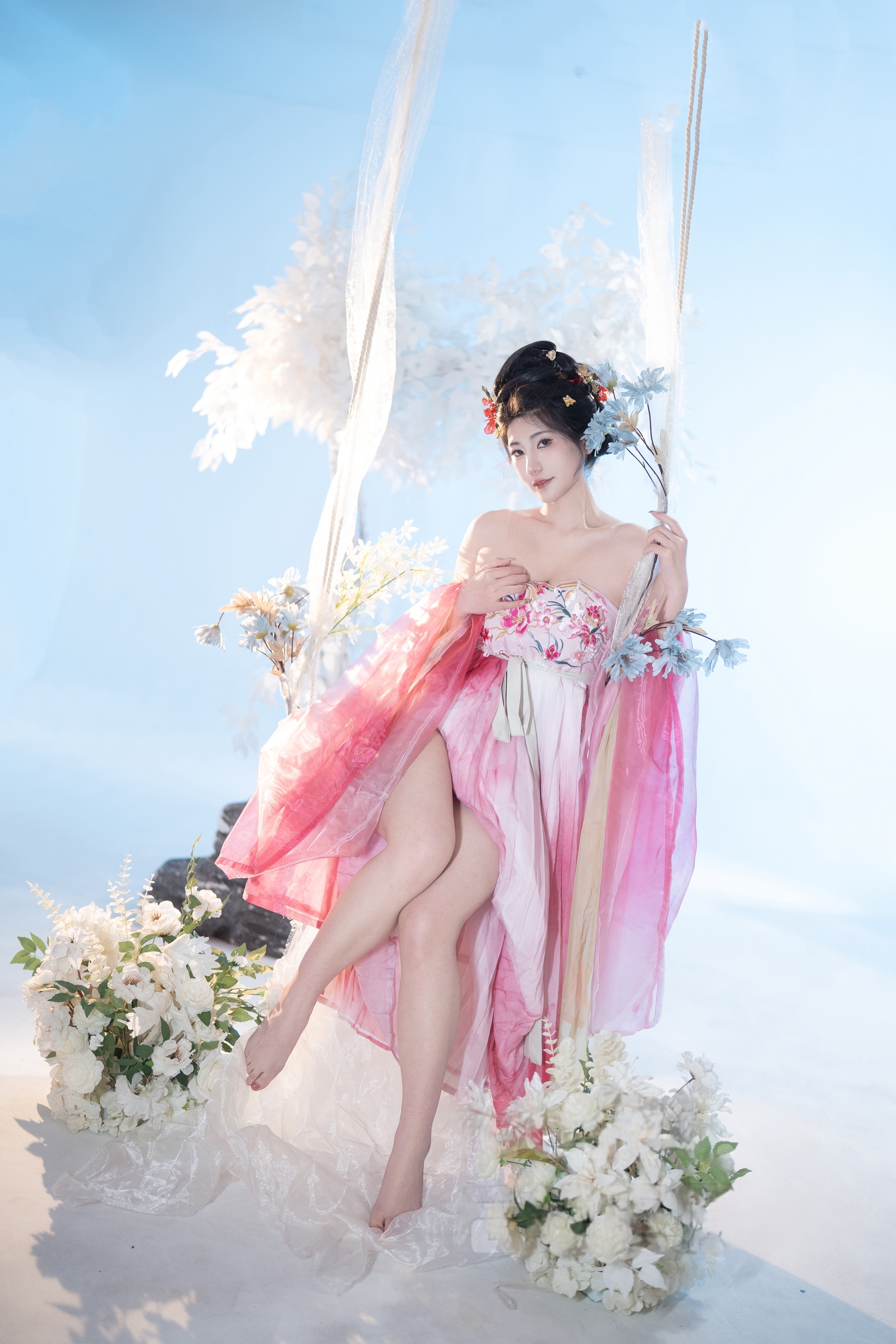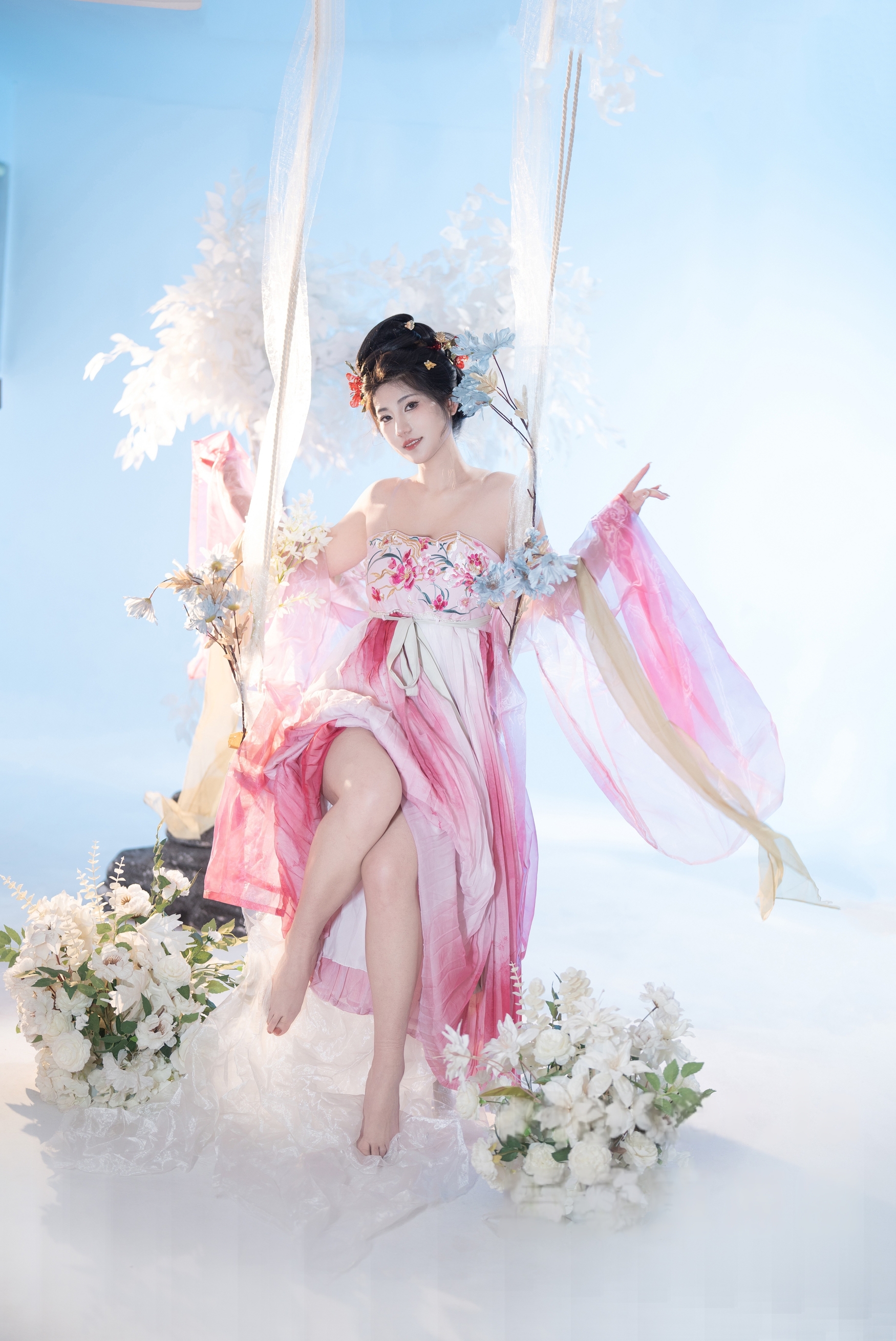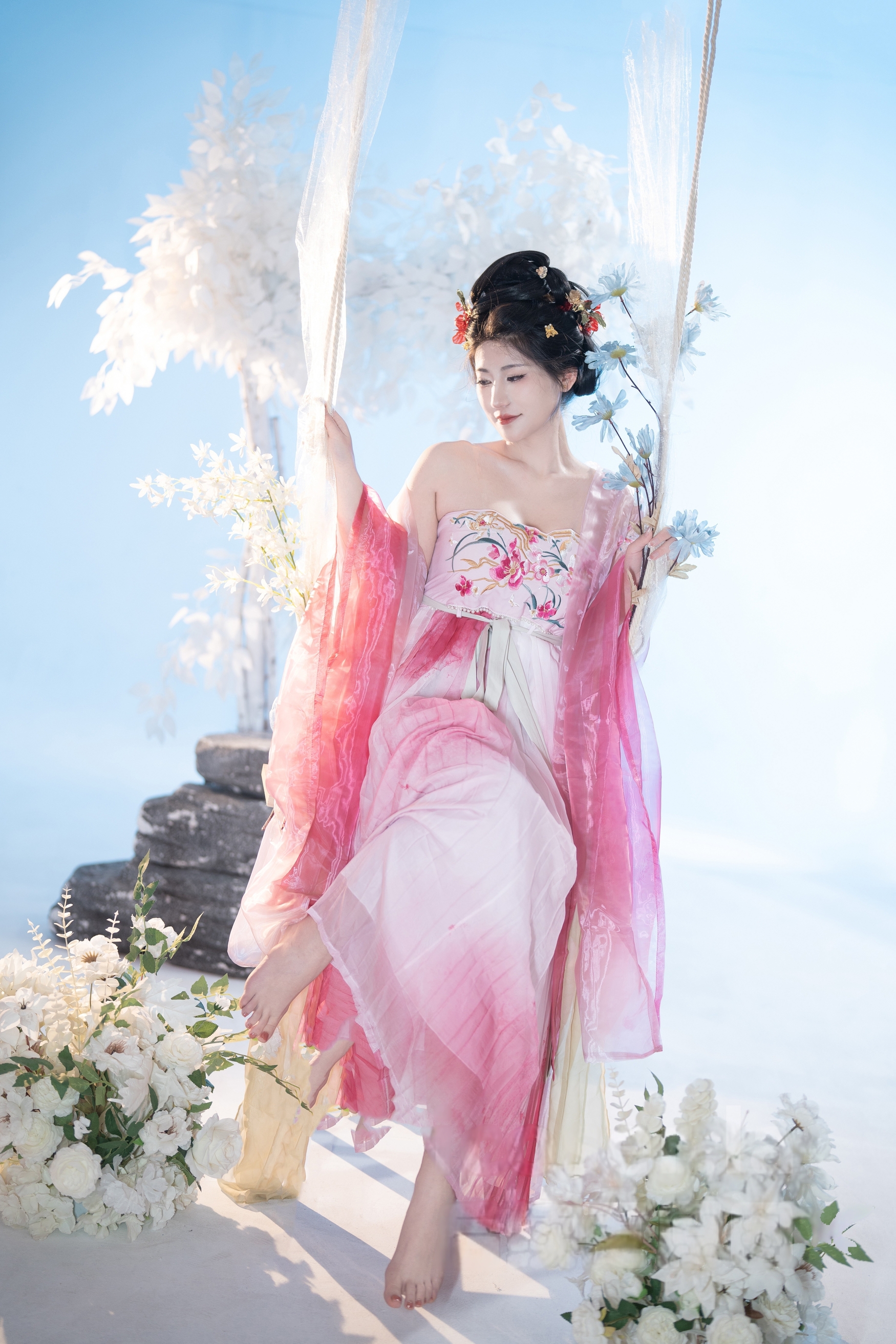 背景是纯净无垠的天空与朦胧的白色花枝,营造出一种“人在画中游”的诗意氛围。阳光洒落,透过薄纱映照出斑驳光影,使整幅画面充满梦幻般的质感。秋千微微晃动,裙裾随之起伏,宛如一幅流动的工笔画,将东方美学的柔美与韵律展现得淋漓尽致。