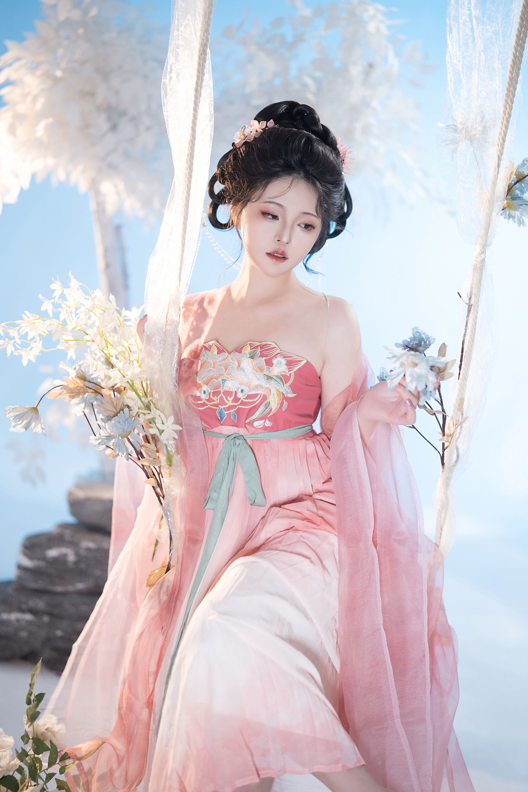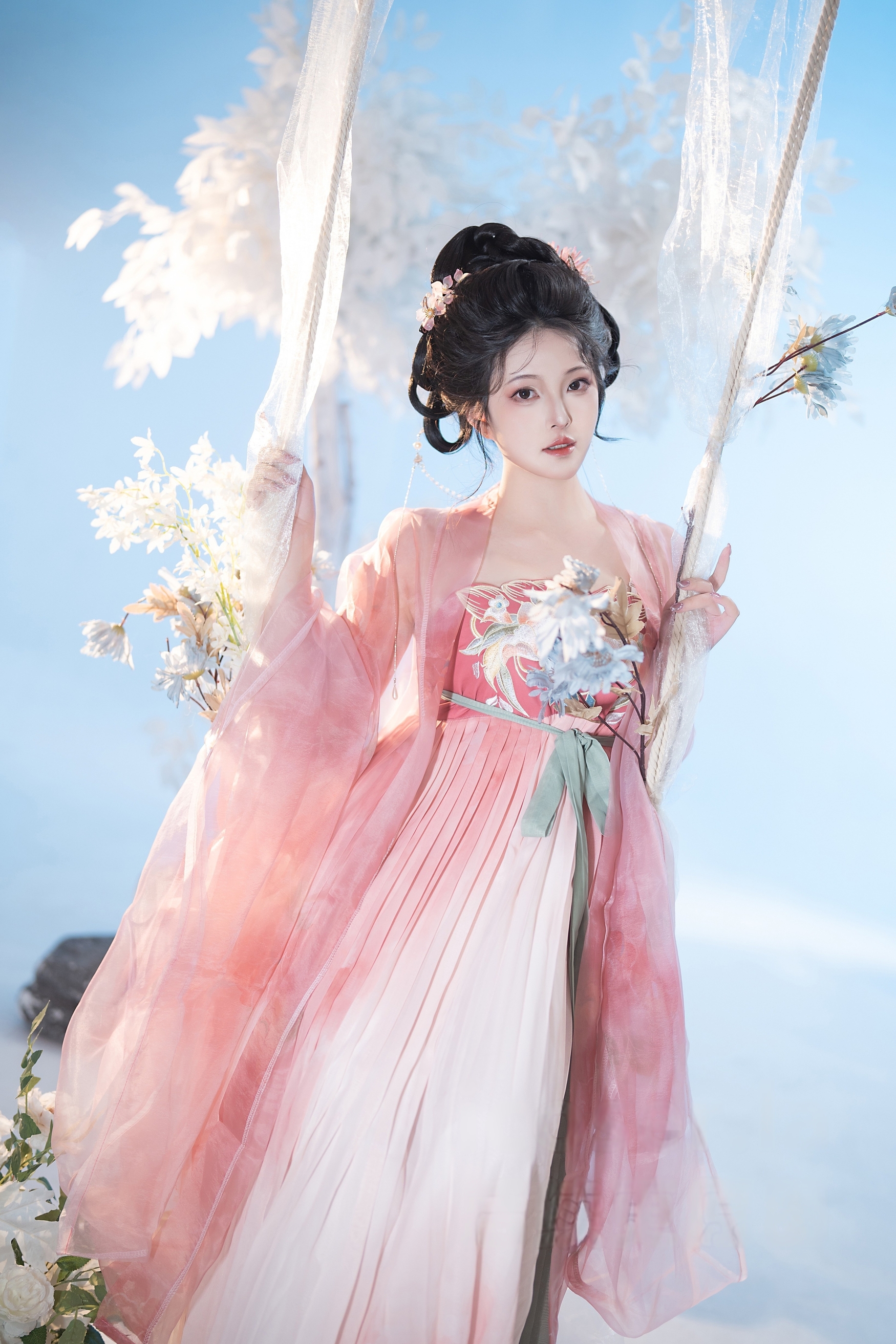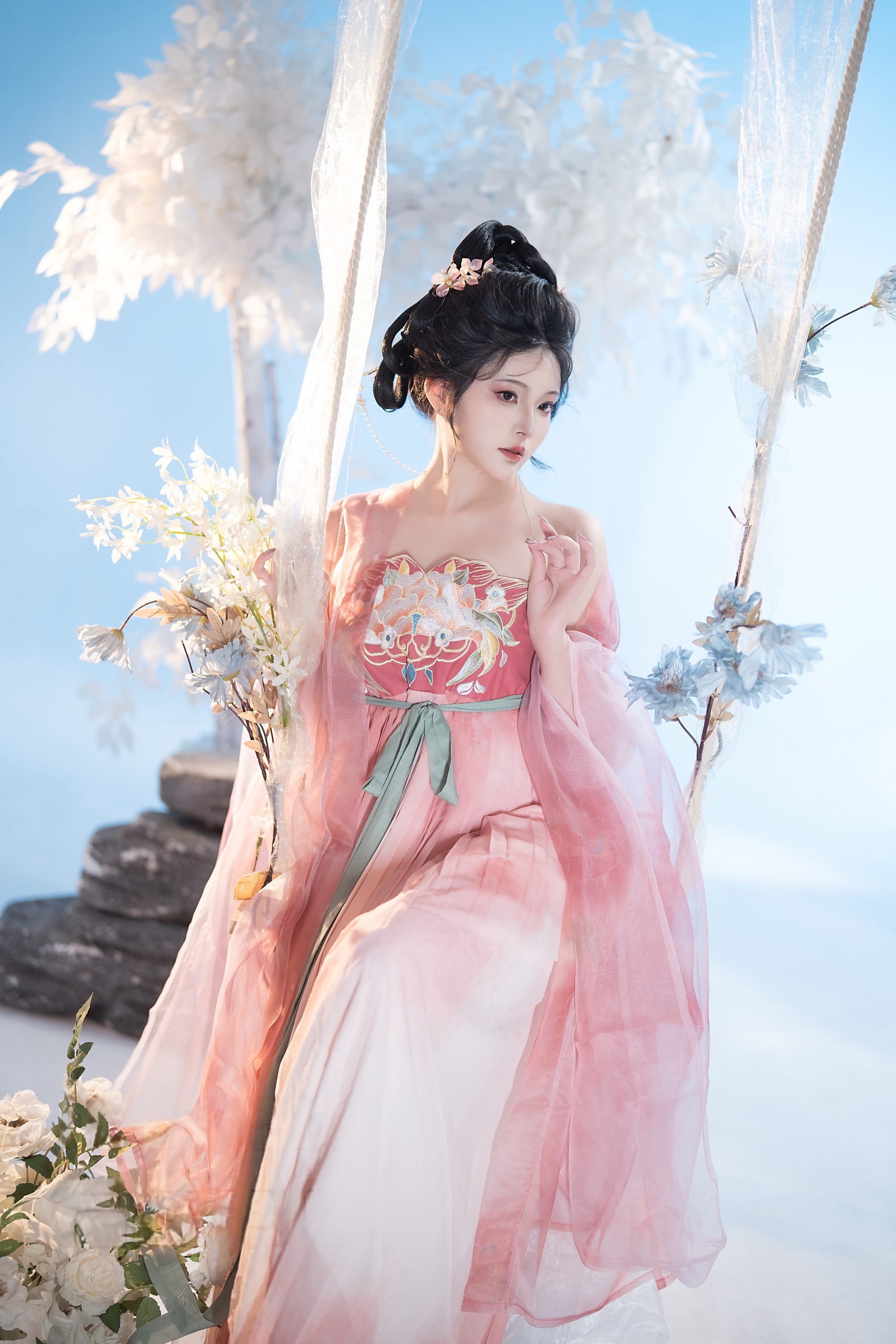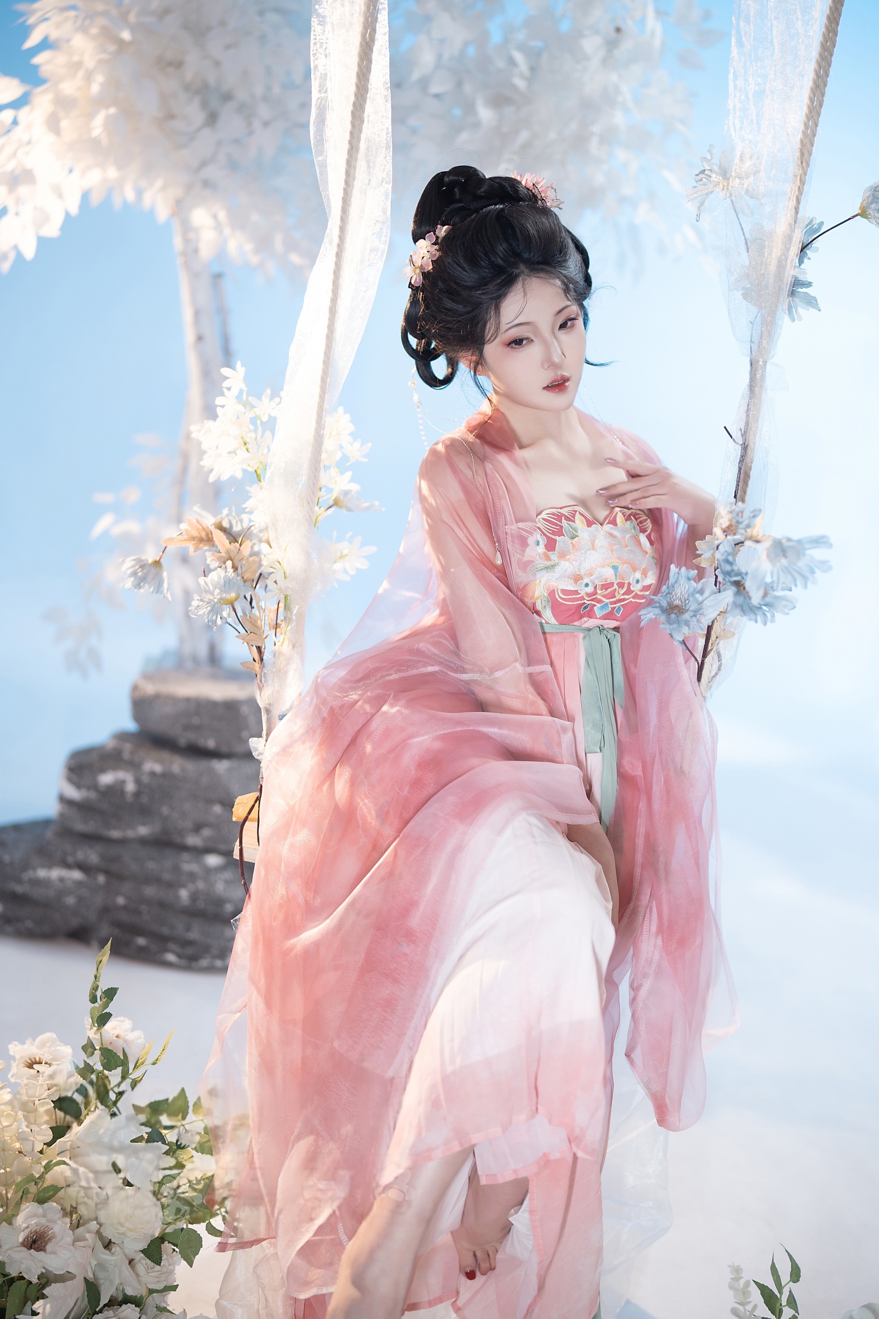 背景是纯净无垠的天空与朦胧的白色花枝,营造出一种“人在画中游”的诗意氛围。阳光洒落,透过薄纱映照出斑驳光影,使整幅画面充满梦幻般的质感。秋千微微晃动,裙裾随之起伏,宛如一幅流动的工笔画,将东方美学的柔美与韵律展现得淋漓尽致。