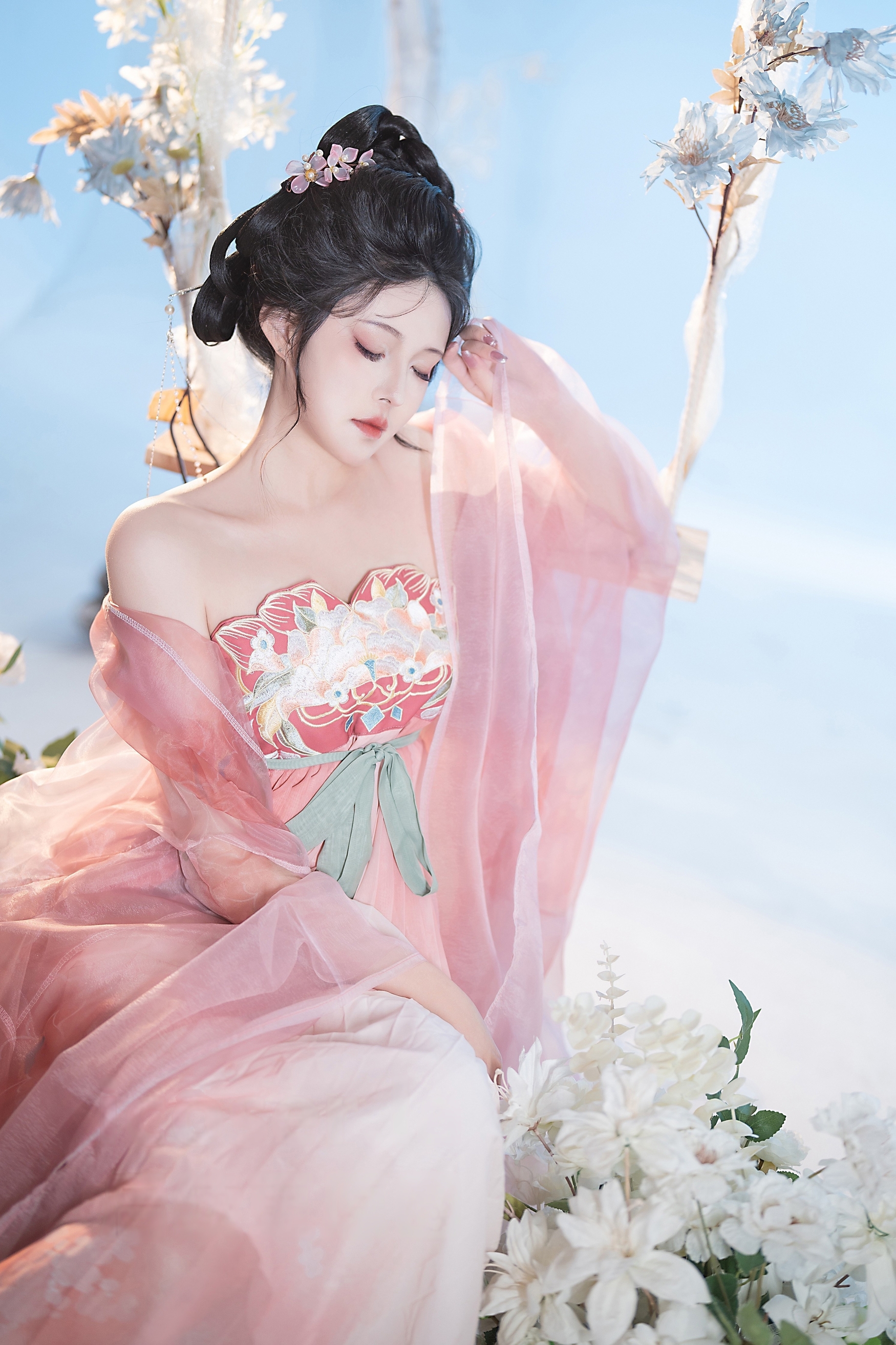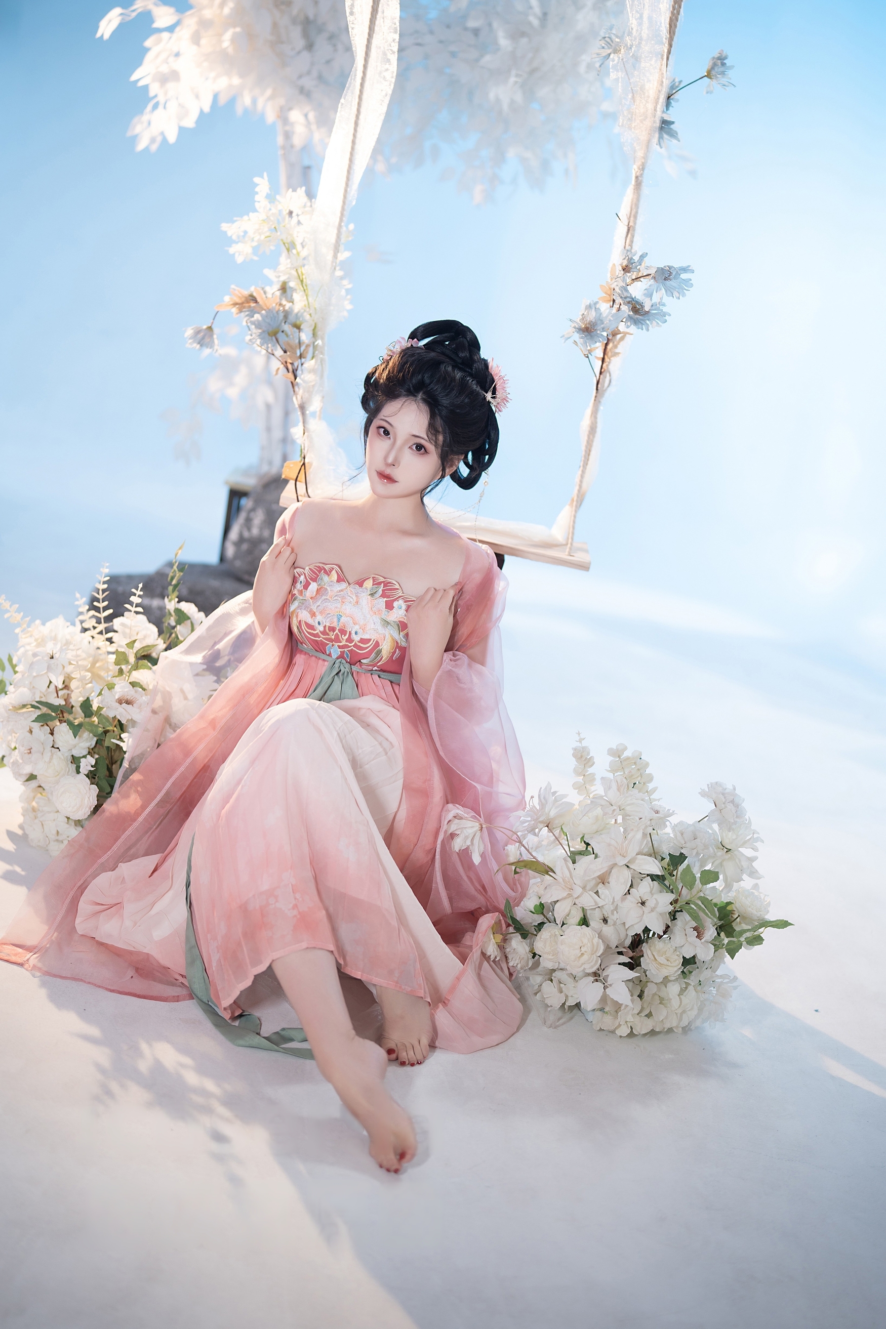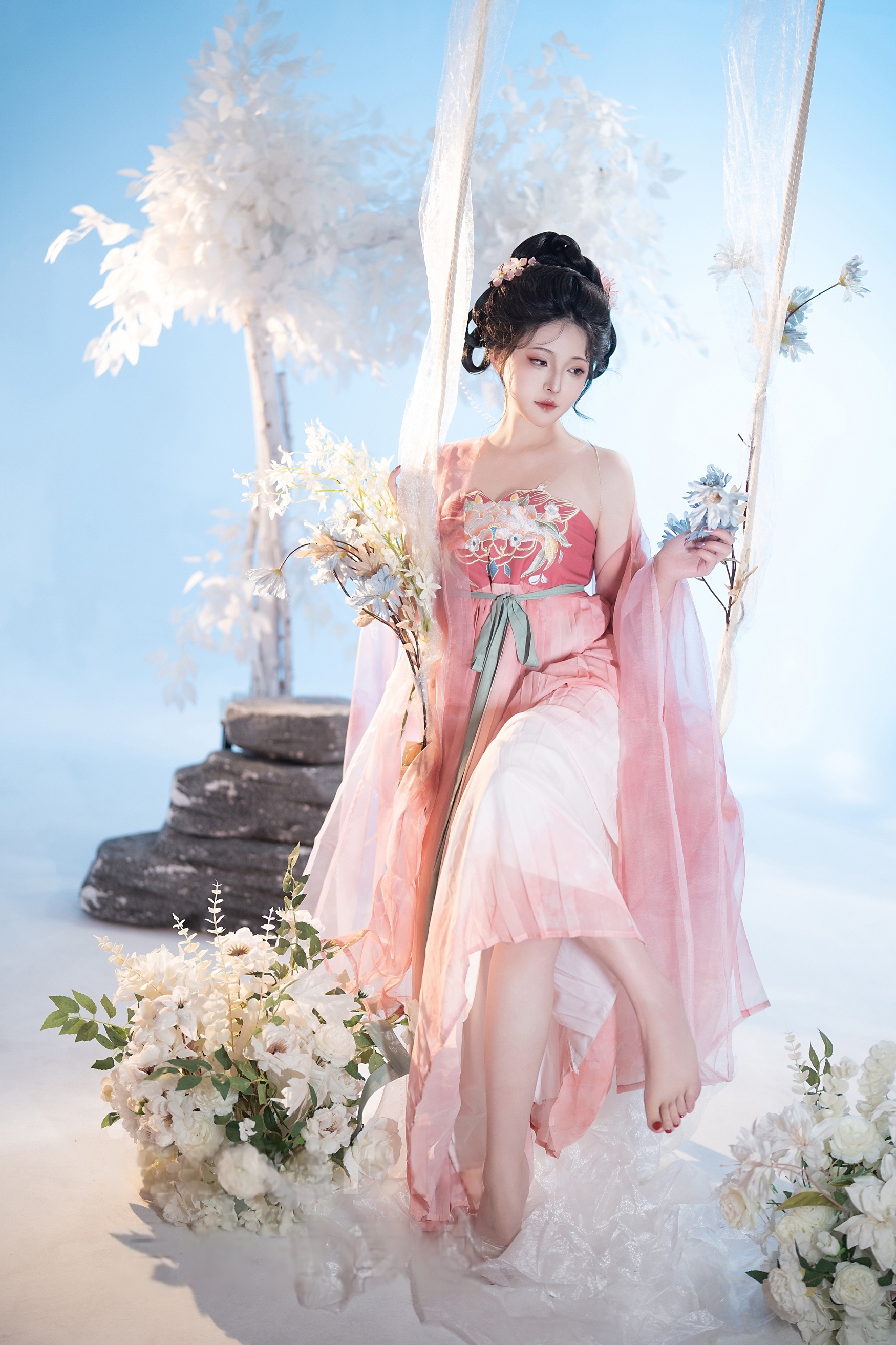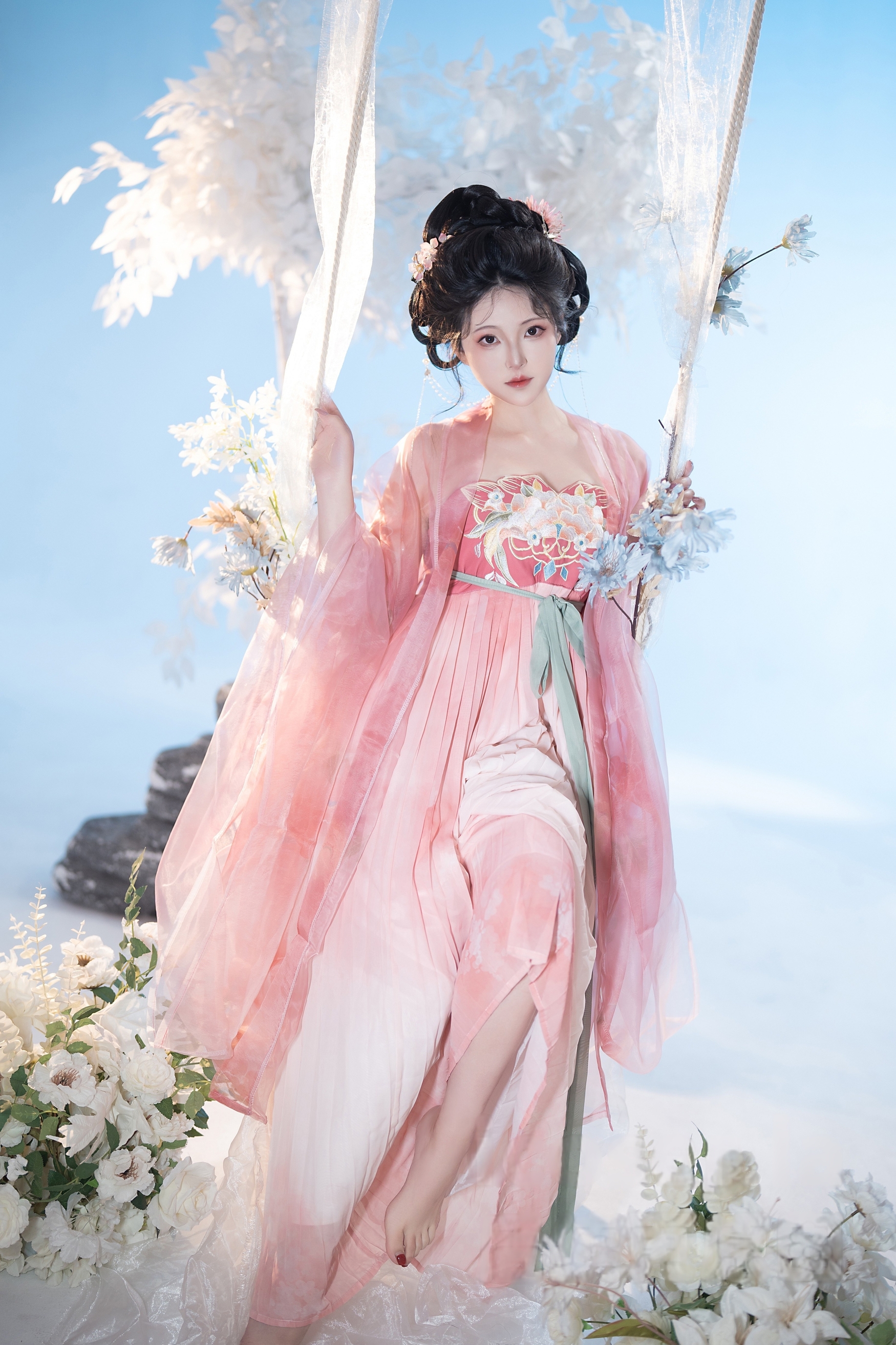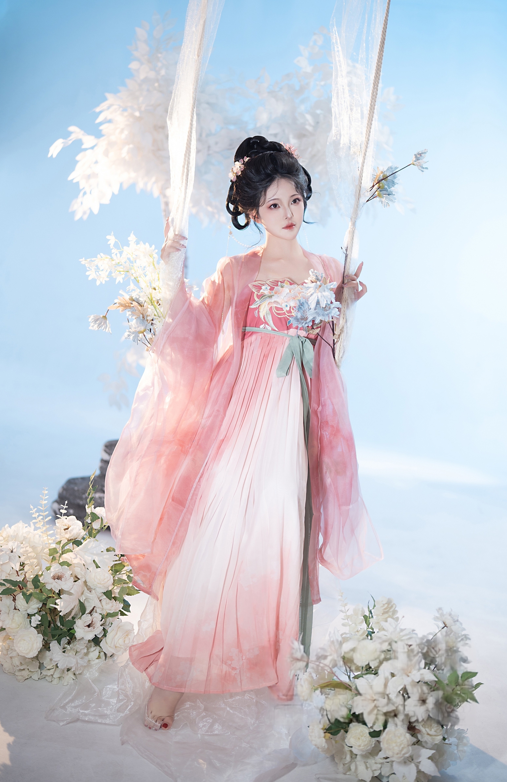背景是纯净无垠的天空与朦胧的白色花枝,营造出一种“人在画中游”的诗意氛围。阳光洒落,透过薄纱映照出斑驳光影,使整幅画面充满梦幻般的质感。秋千微微晃动,裙裾随之起伏,宛如一幅流动的工笔画,将东方美学的柔美与韵律展现得淋漓尽致。