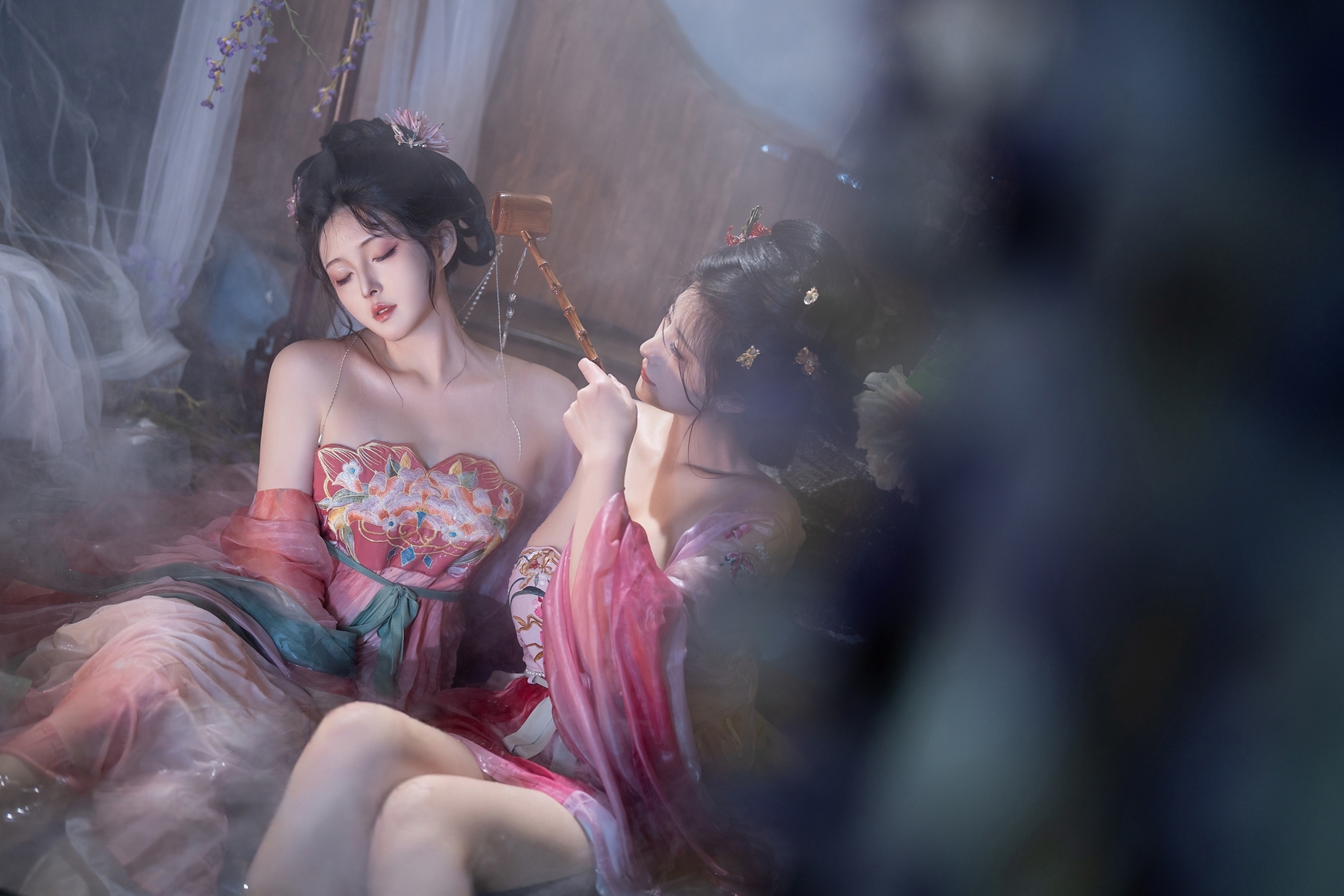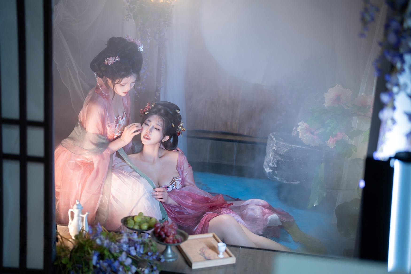 在氤氲的雾气中,两位身着华美汉服的女子,仿佛从古画中走出的仙子。一位端坐池畔,手持玉壶,倾注清泉;另一位则悠然躺卧,享受着这温柔的洗礼。粉色的衣袂在水中轻柔飘荡,如同盛开的莲花,映衬着她们如玉般温润的肌肤和宁静的神情。
