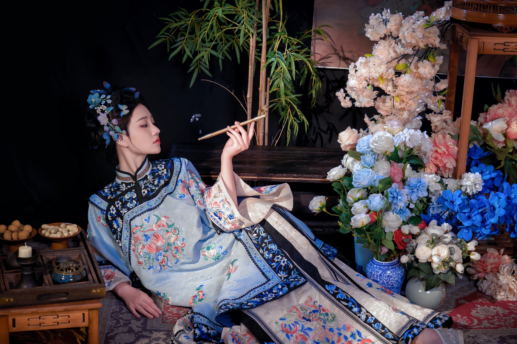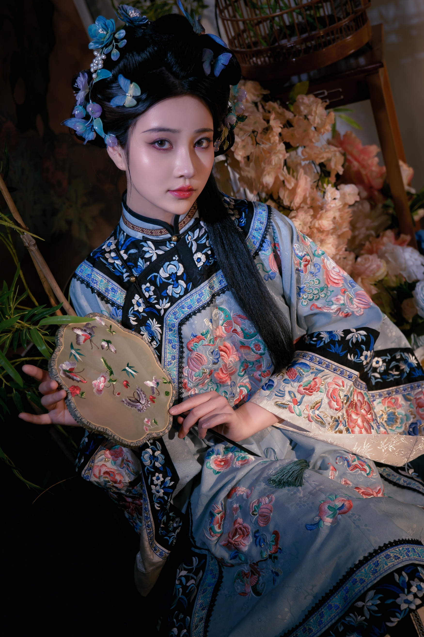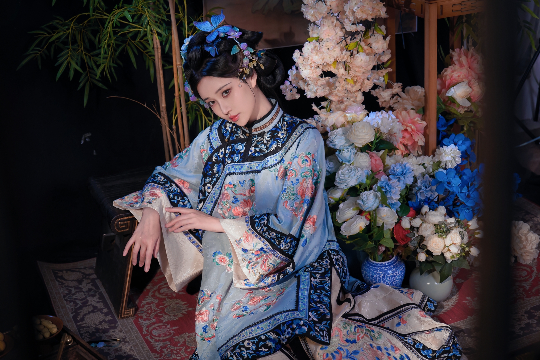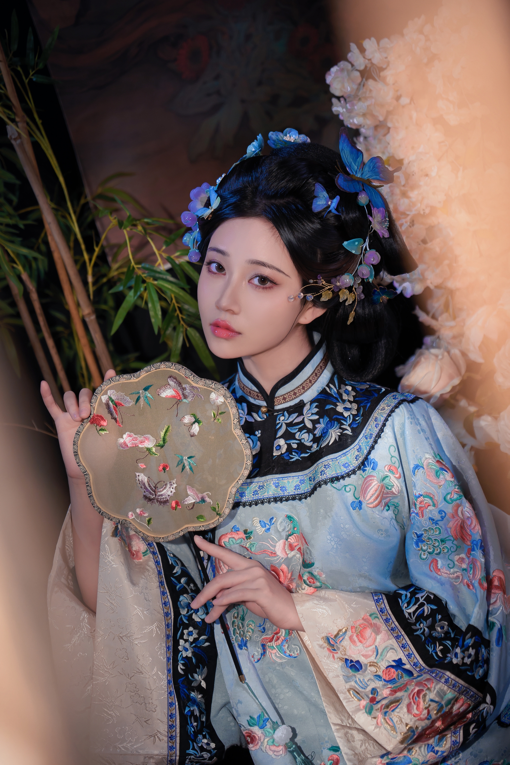 她身披一件如青花瓷般雅致的浅蓝色旗装,衣料光滑细腻,泛着丝绸特有的光泽。整件衣服上,密密麻麻地绣满了盛开的牡丹和翩跹的彩蝶,红、粉、蓝、绿诸色交织,绚烂而不失庄重,每一针每一线都诉说着昔日宫廷的奢靡与匠心。领口与袖口处,以深蓝色为底,绣上精美的缠枝莲纹,更添一份沉稳与贵气。她的发髻高耸,梳成经典的旗头样式,上面插满了蓝色的蝴蝶发簪和紫色的珠串,灵动而华美,与衣裳上的图案遥相呼应。