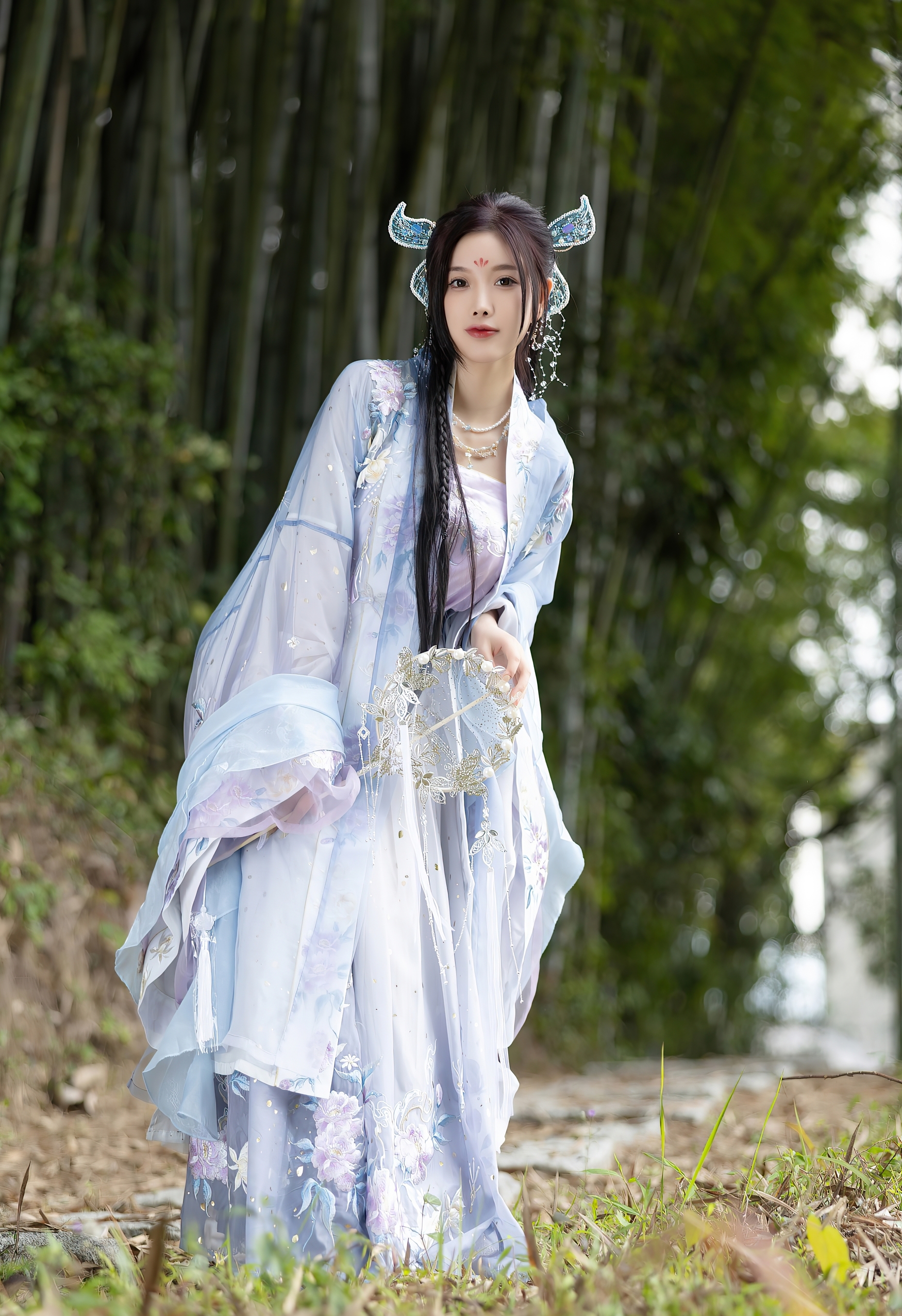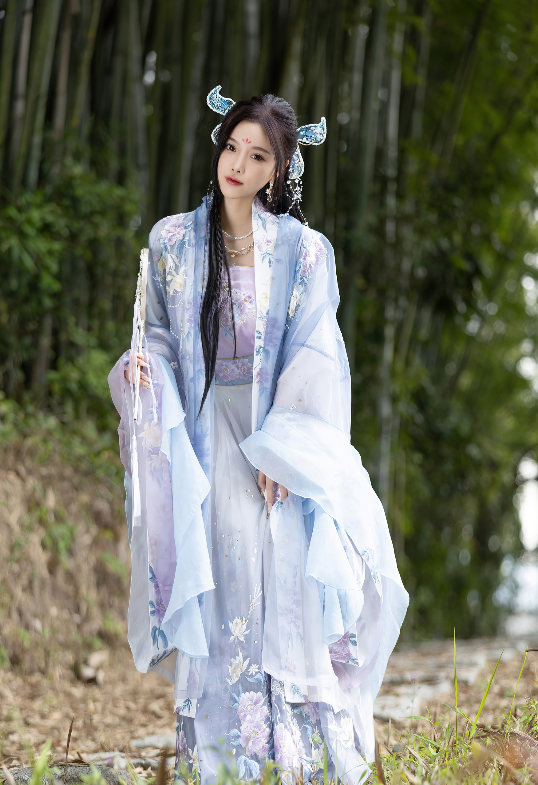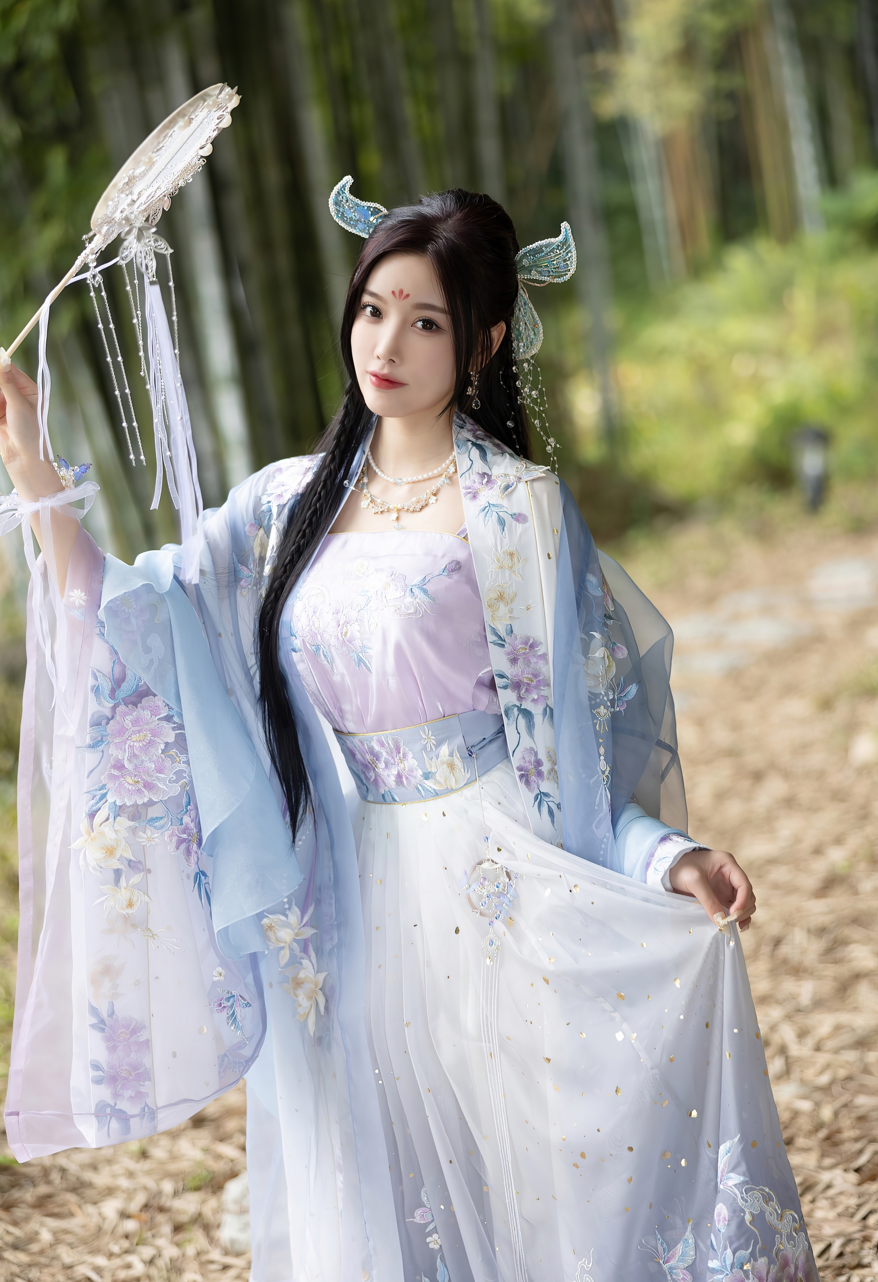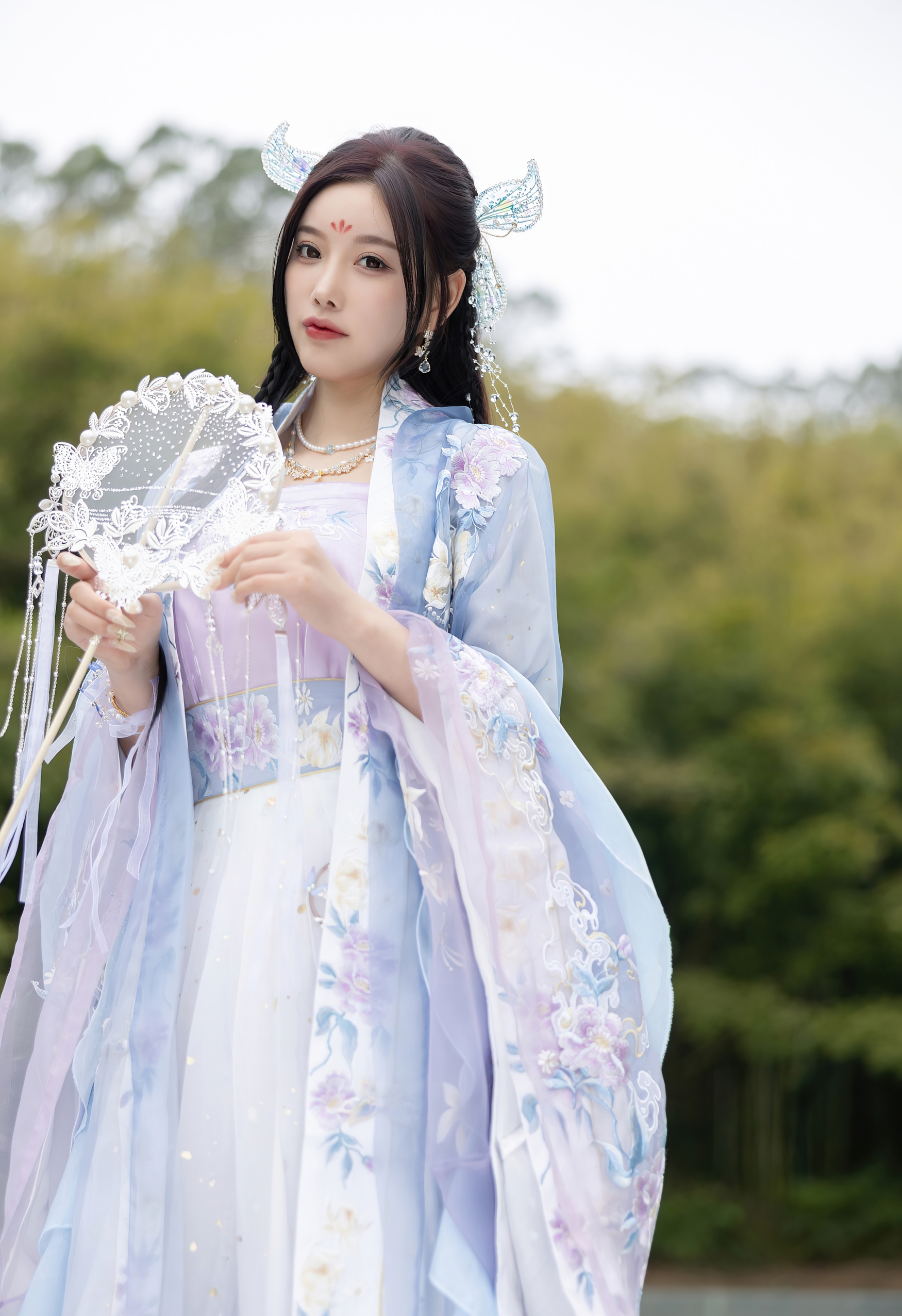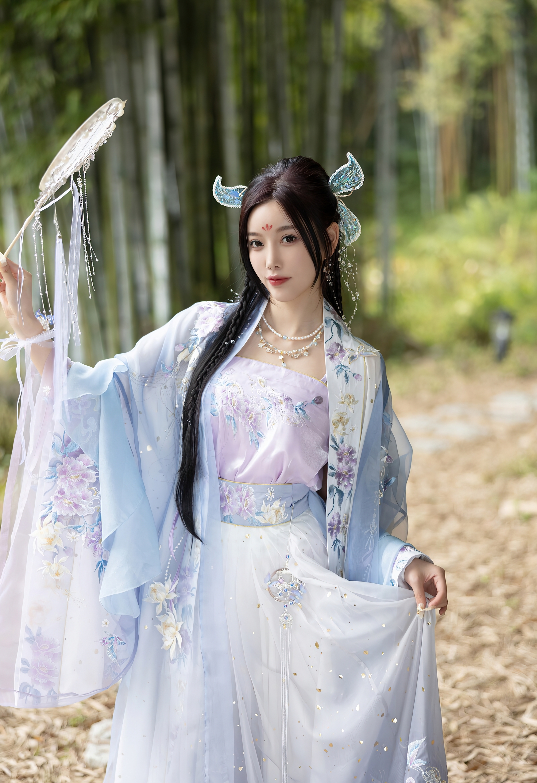 在一片静谧的竹林深处,她如一场不期而至的梦境,悄然降临。一袭淡紫与浅蓝交织的广袖流仙裙,在微风中轻轻舞动,仿佛将天边的云霞与湖水的倒影都织进了衣袂。那层层叠叠的薄纱,轻盈得如同晨雾,每一次转身,都漾开一圈圈温柔的涟漪。