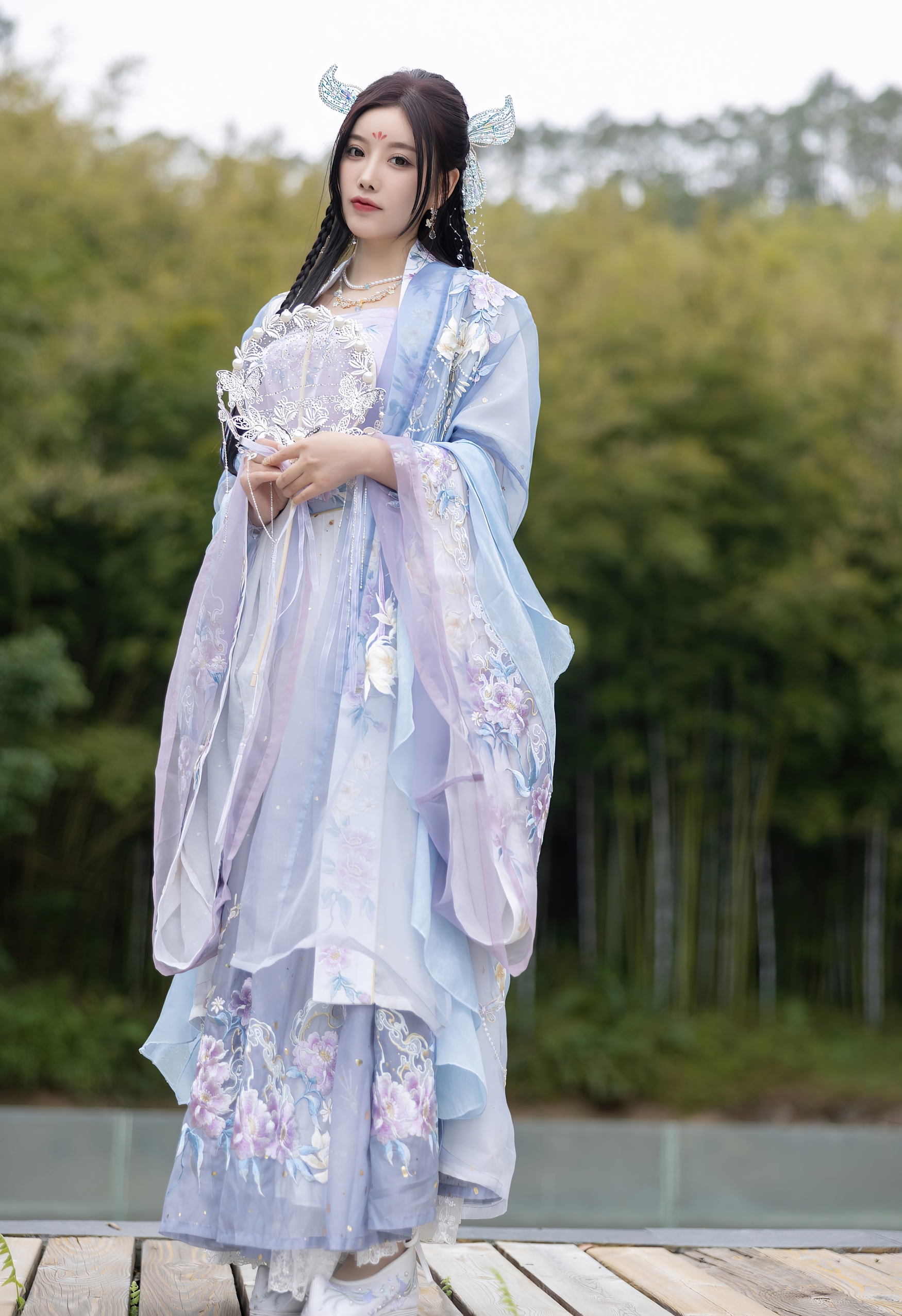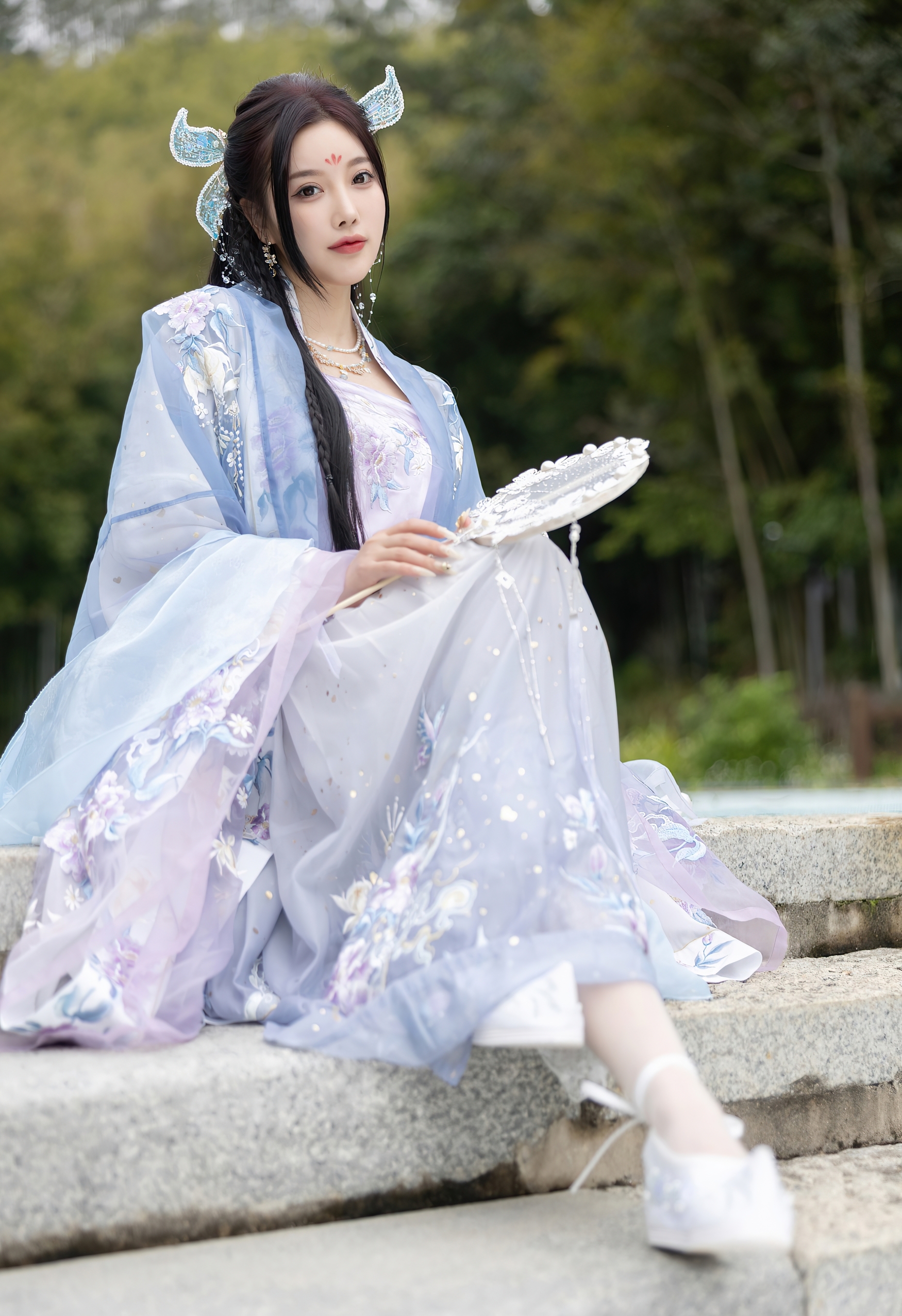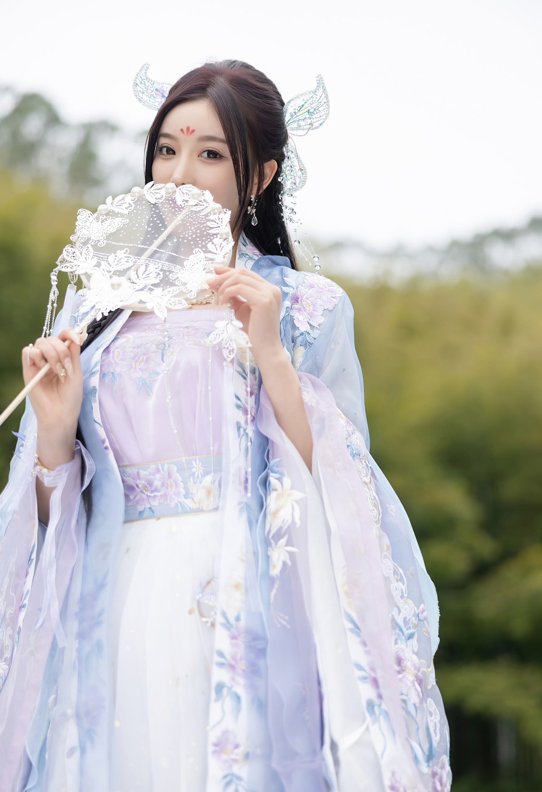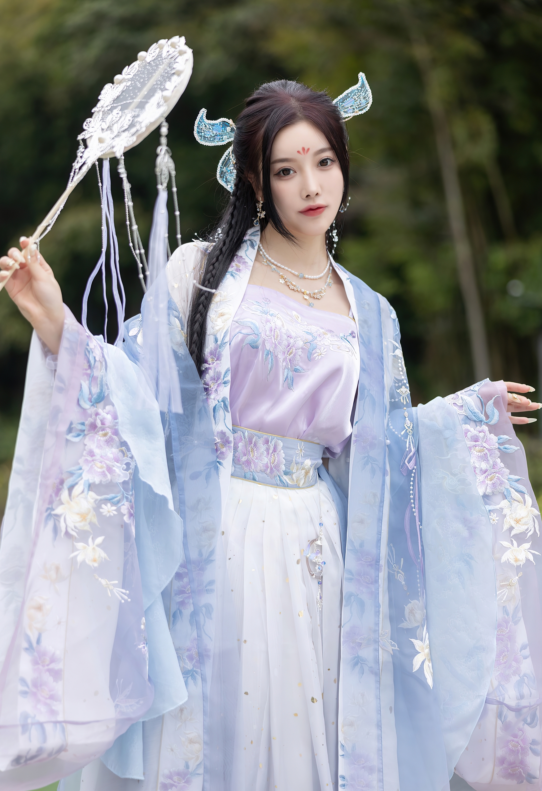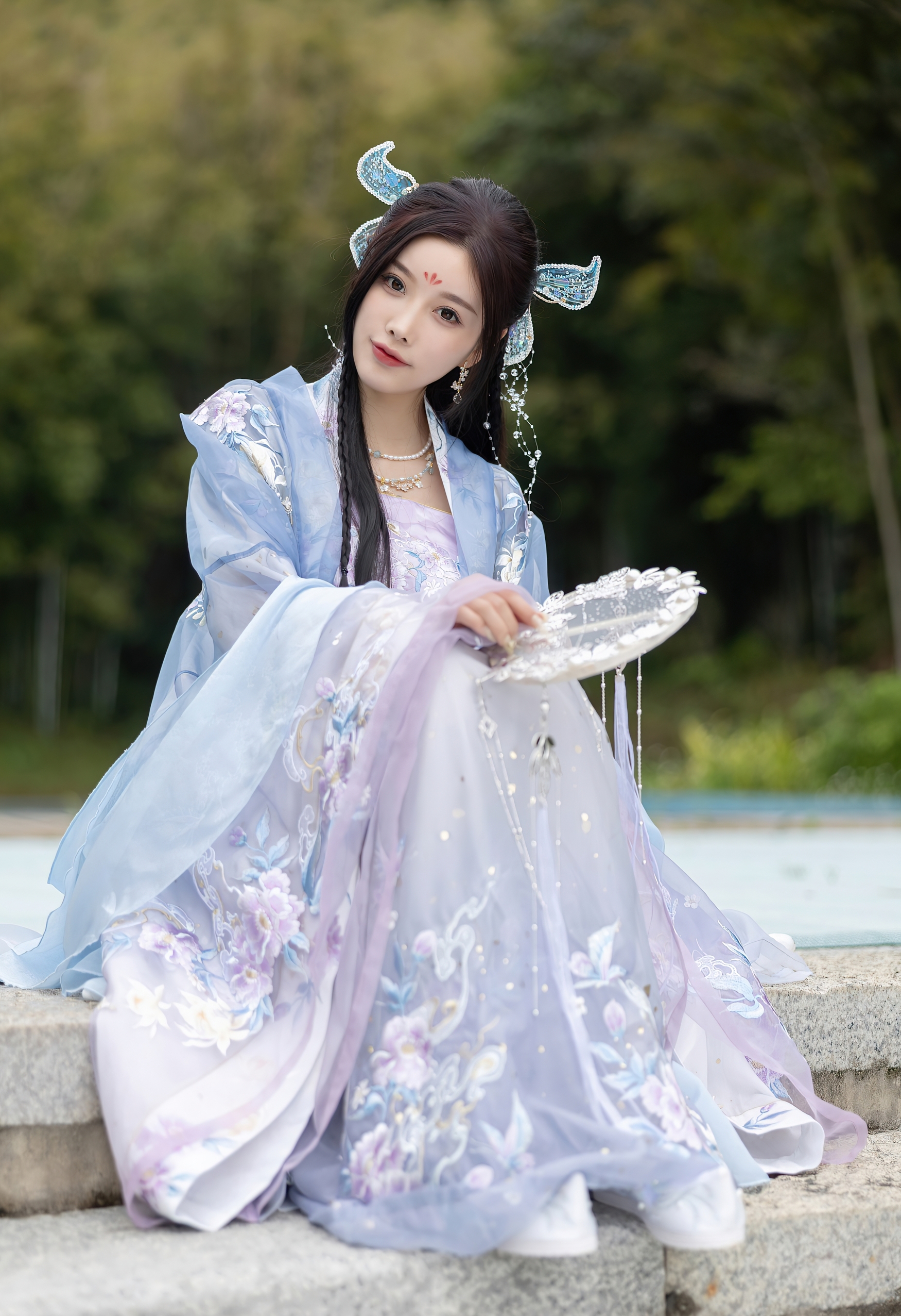 在一片静谧的竹林深处,她如一场不期而至的梦境,悄然降临。一袭淡紫与浅蓝交织的广袖流仙裙,在微风中轻轻舞动,仿佛将天边的云霞与湖水的倒影都织进了衣袂。那层层叠叠的薄纱,轻盈得如同晨雾,每一次转身,都漾开一圈圈温柔的涟漪。