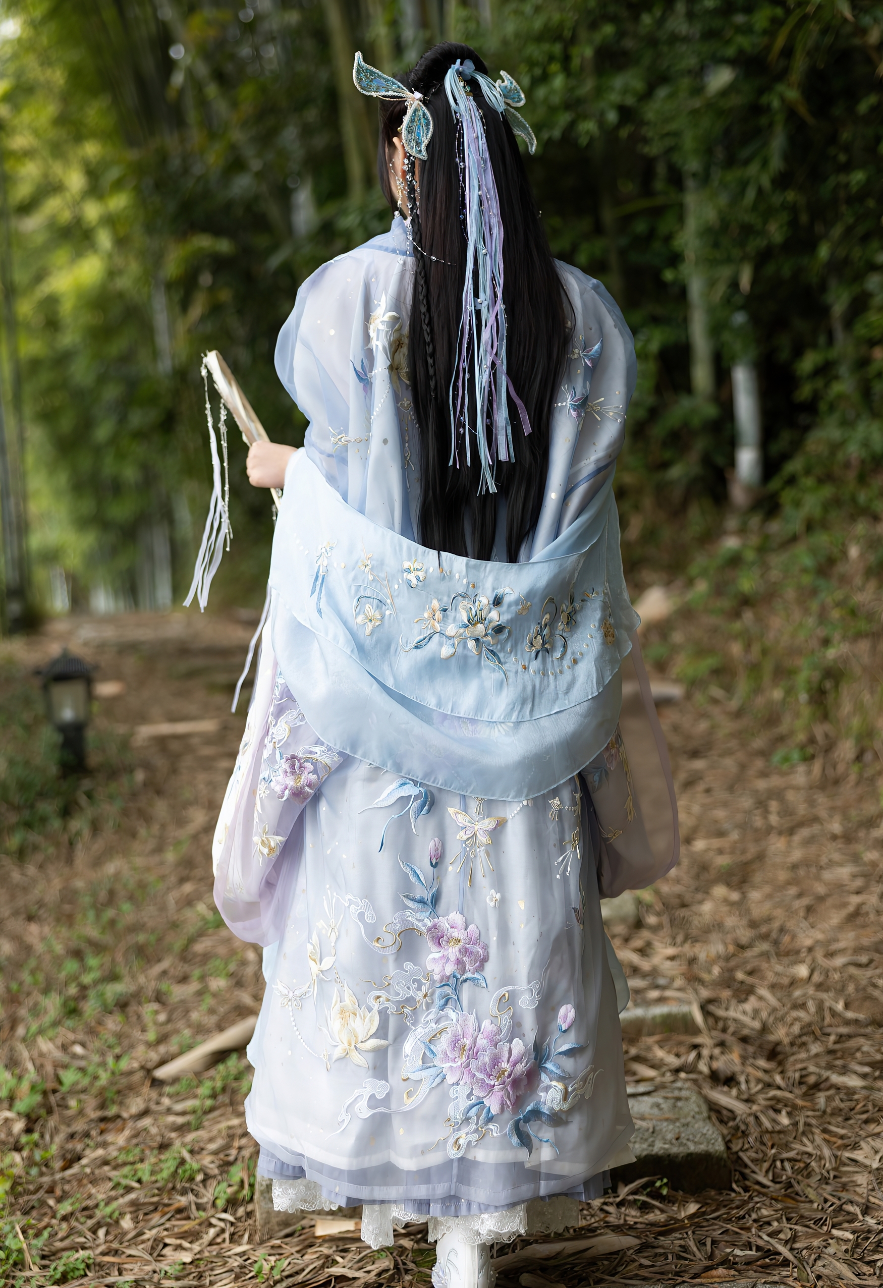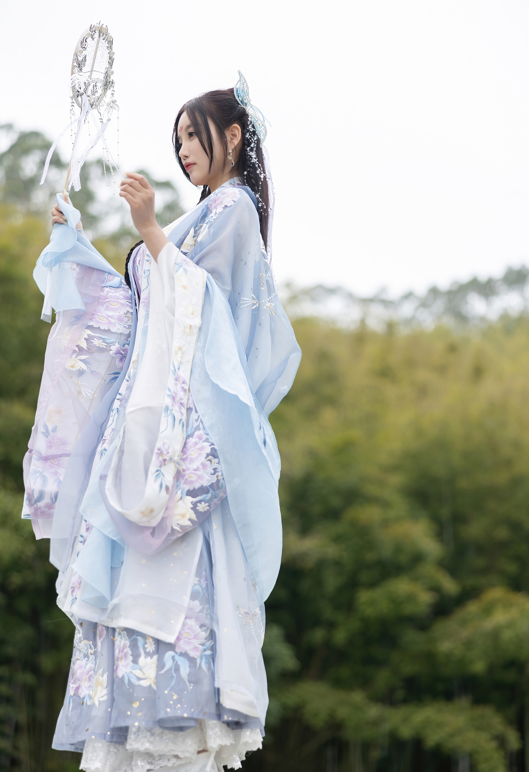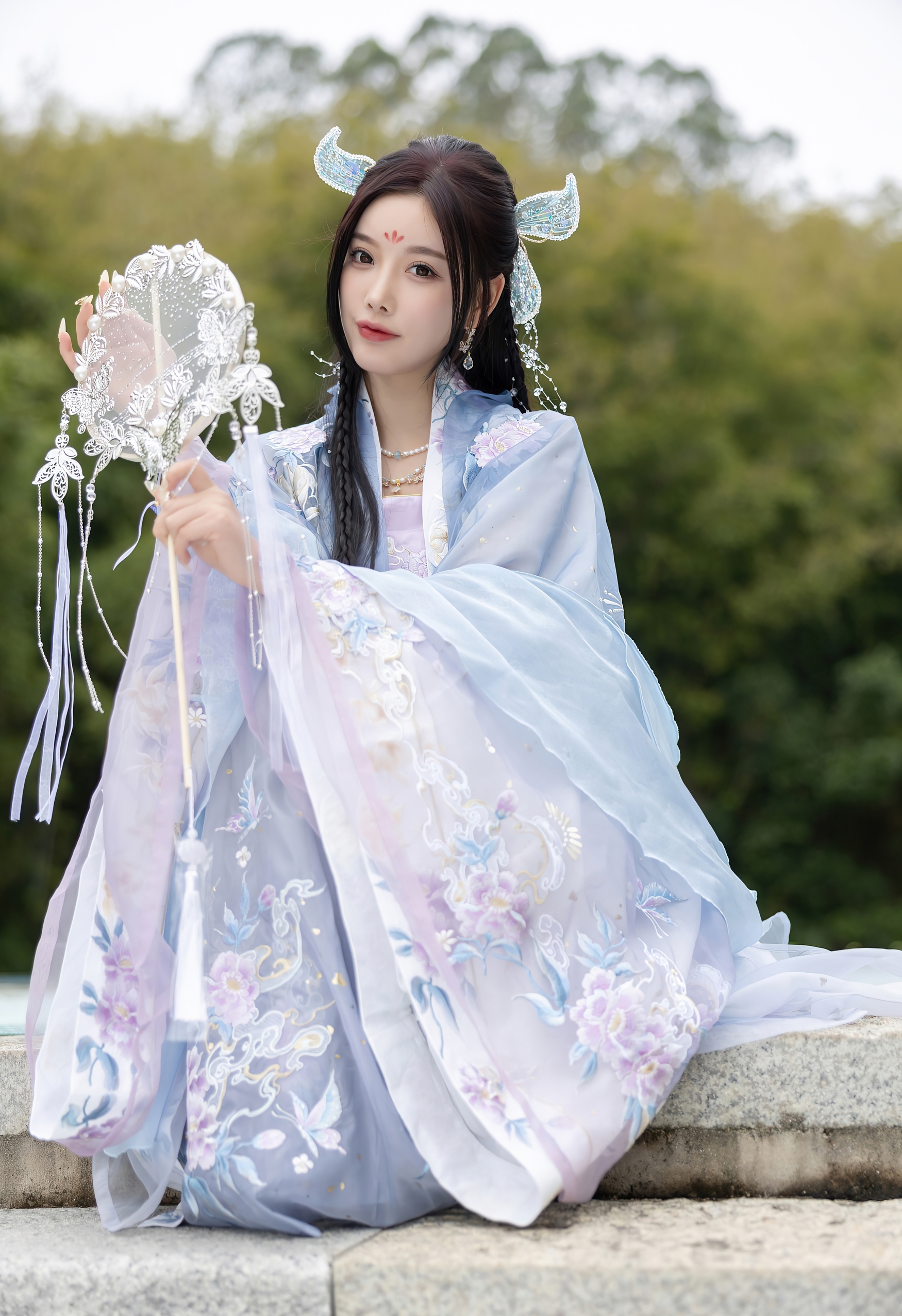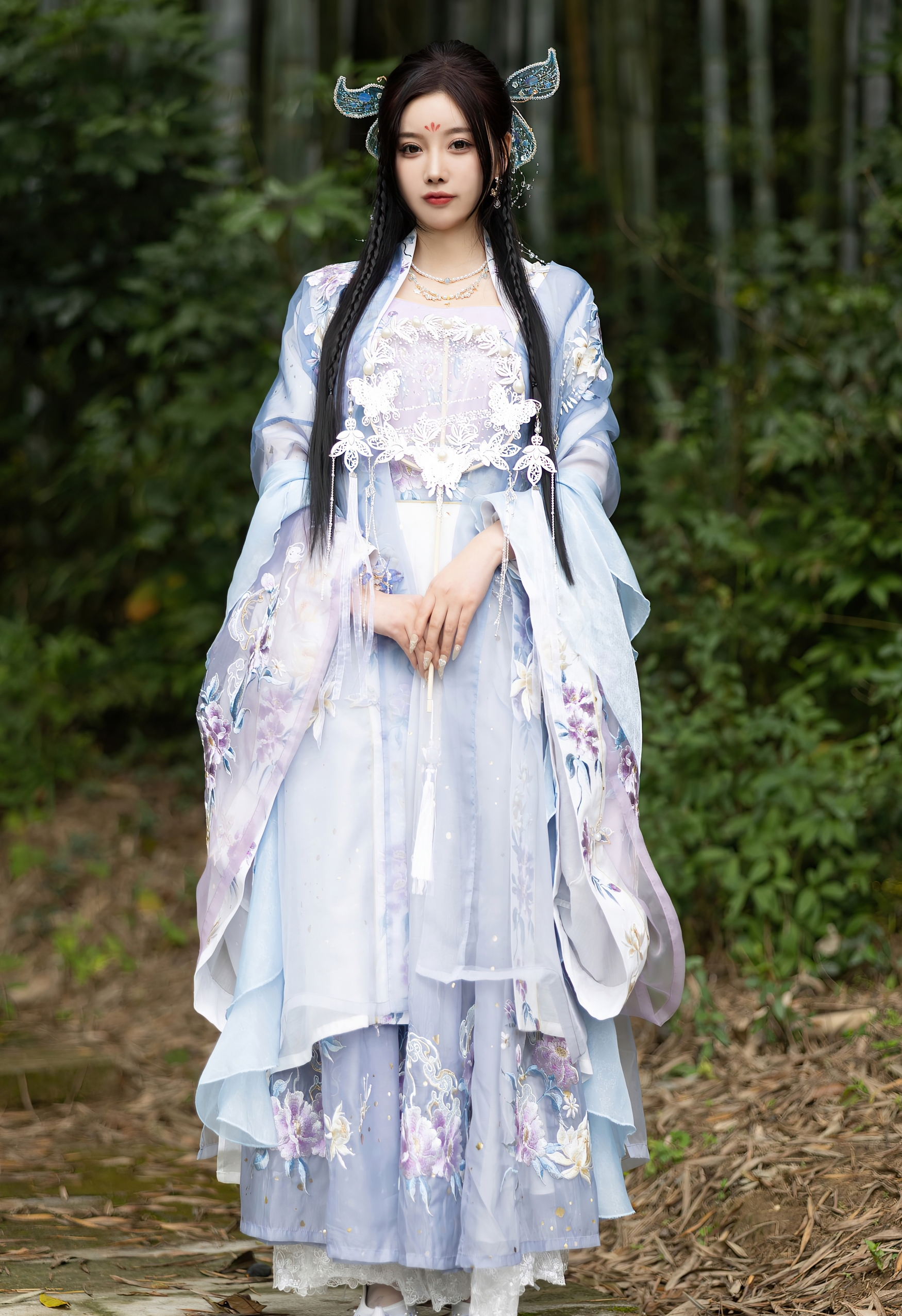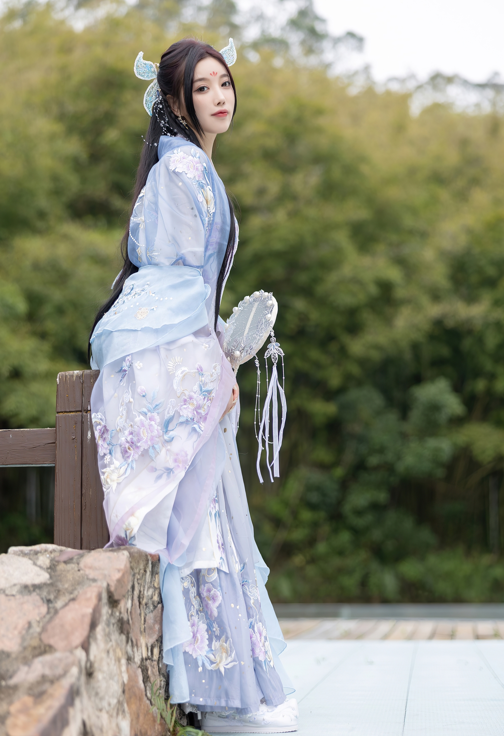 在一片静谧的竹林深处,她如一场不期而至的梦境,悄然降临。一袭淡紫与浅蓝交织的广袖流仙裙,在微风中轻轻舞动,仿佛将天边的云霞与湖水的倒影都织进了衣袂。那层层叠叠的薄纱,轻盈得如同晨雾,每一次转身,都漾开一圈圈温柔的涟漪。