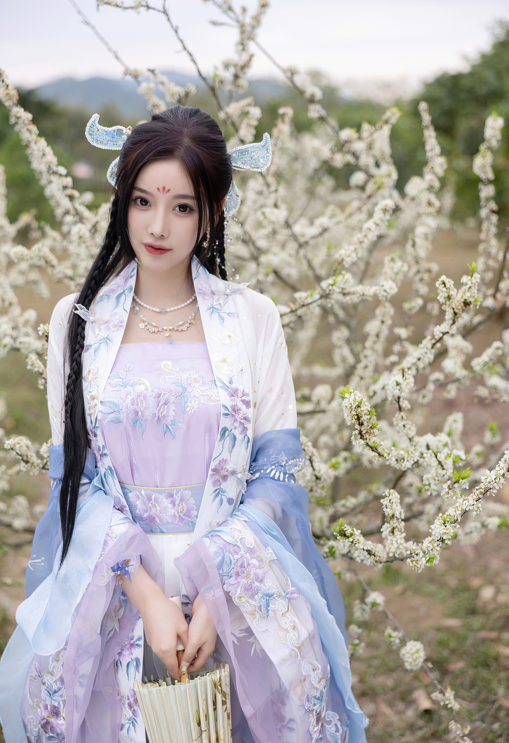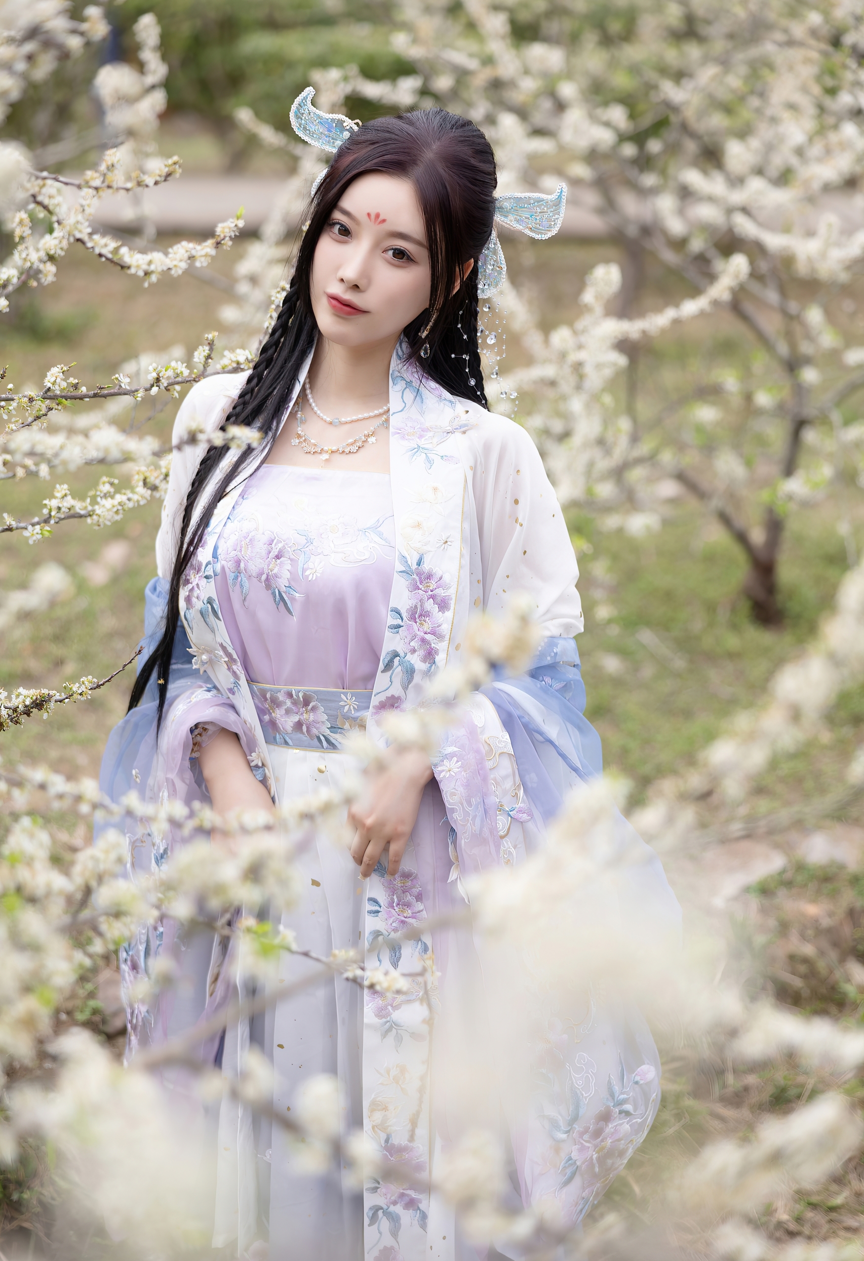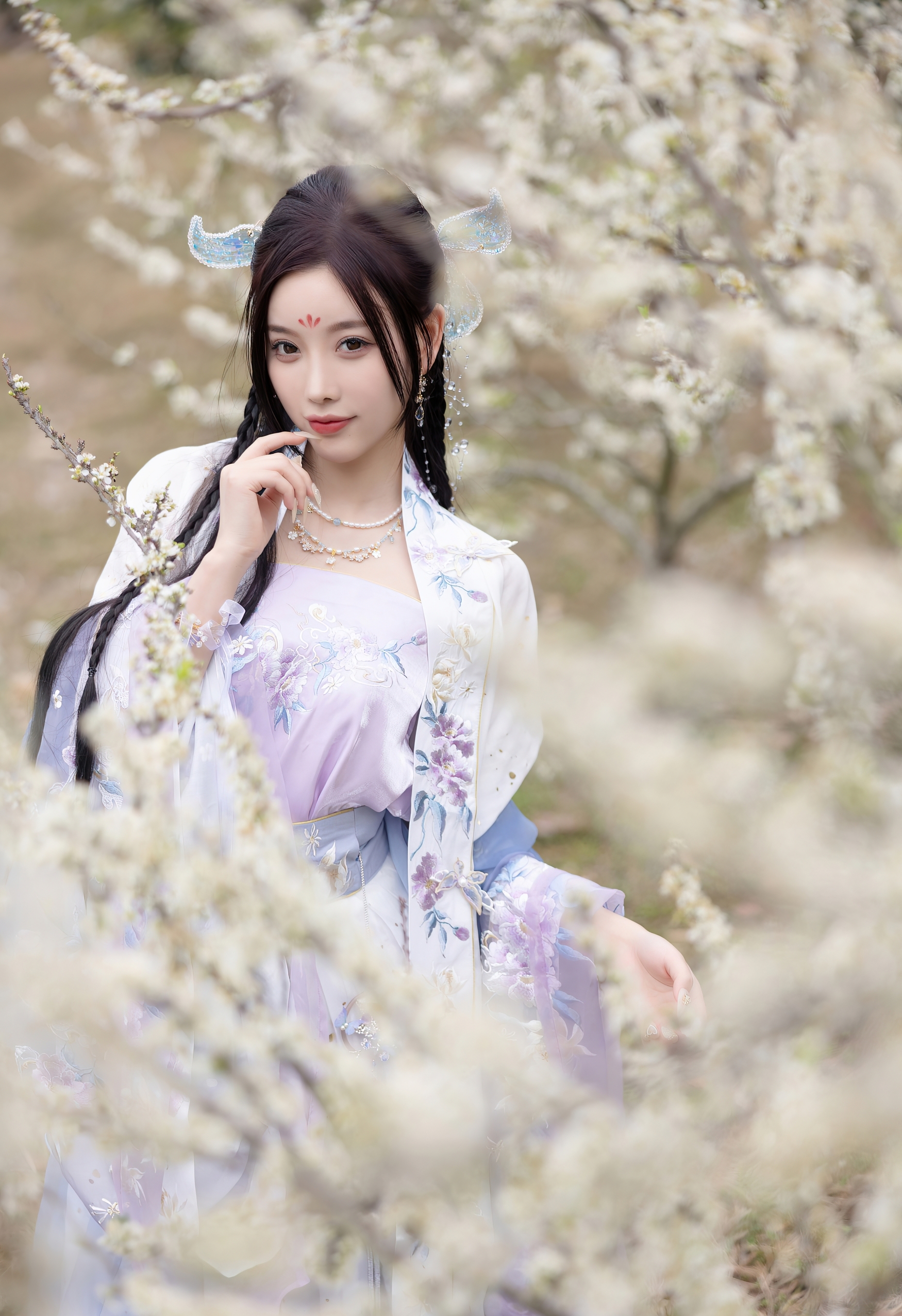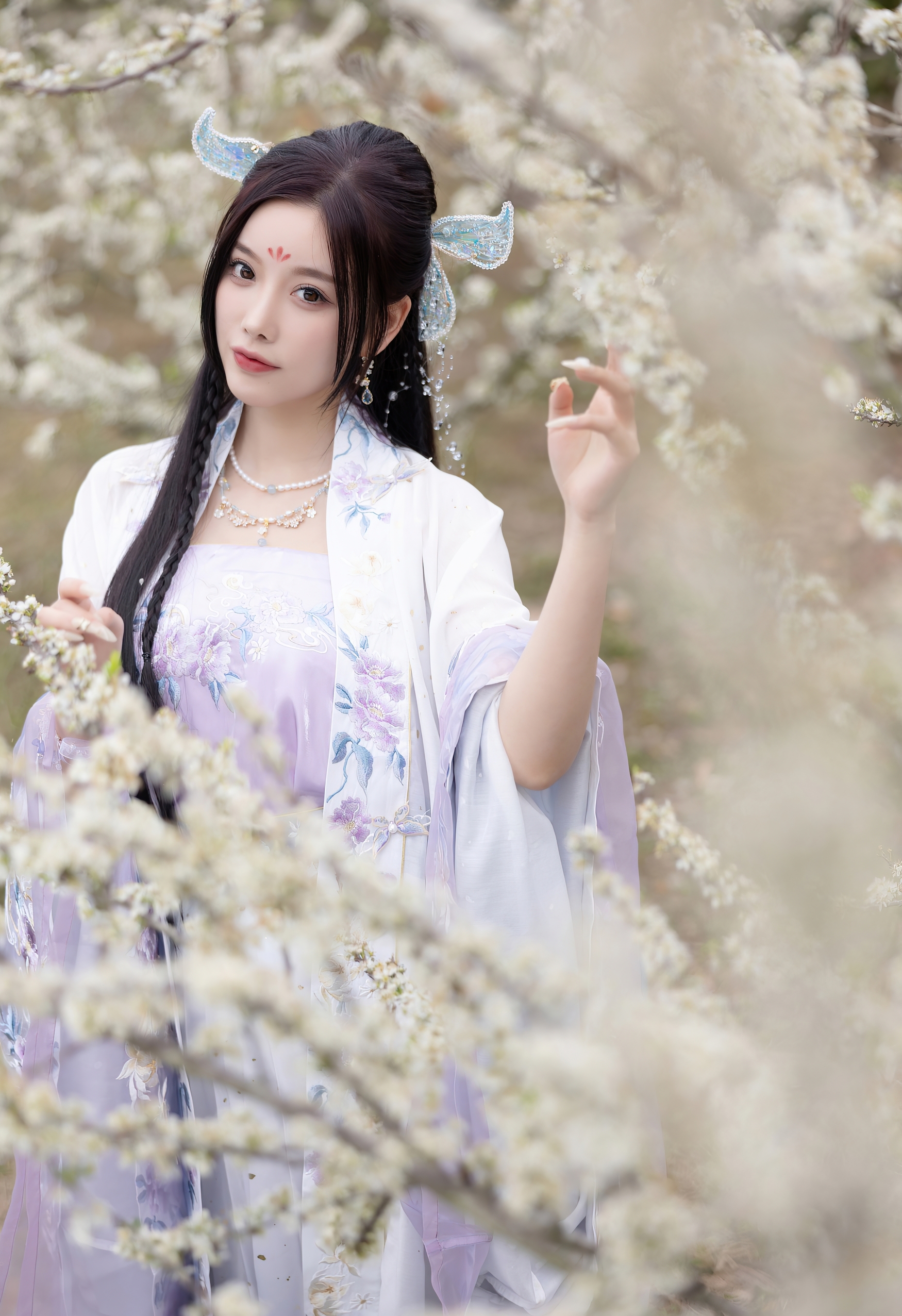 春风十里,不如她笑靥如花。在一片盛放的白色花海中,她宛如从神话中走出的精灵,静立于花枝之间,与这满园春色融为一体。一袭淡紫与浅蓝晕染的广袖长裙,层层叠叠的薄纱如云似雾,在微风中轻轻摇曳,仿佛将整个春天的柔情都裹挟其中。