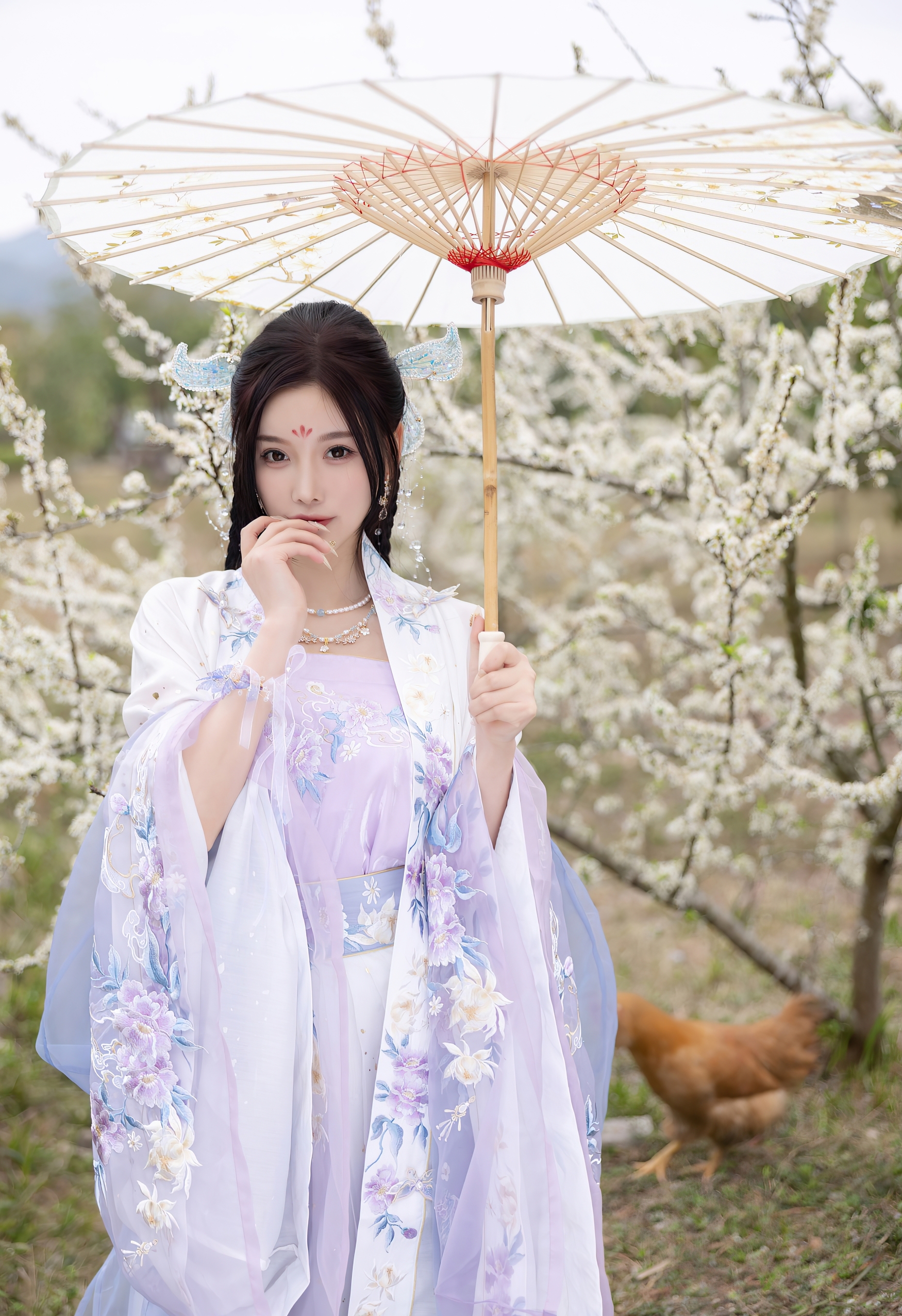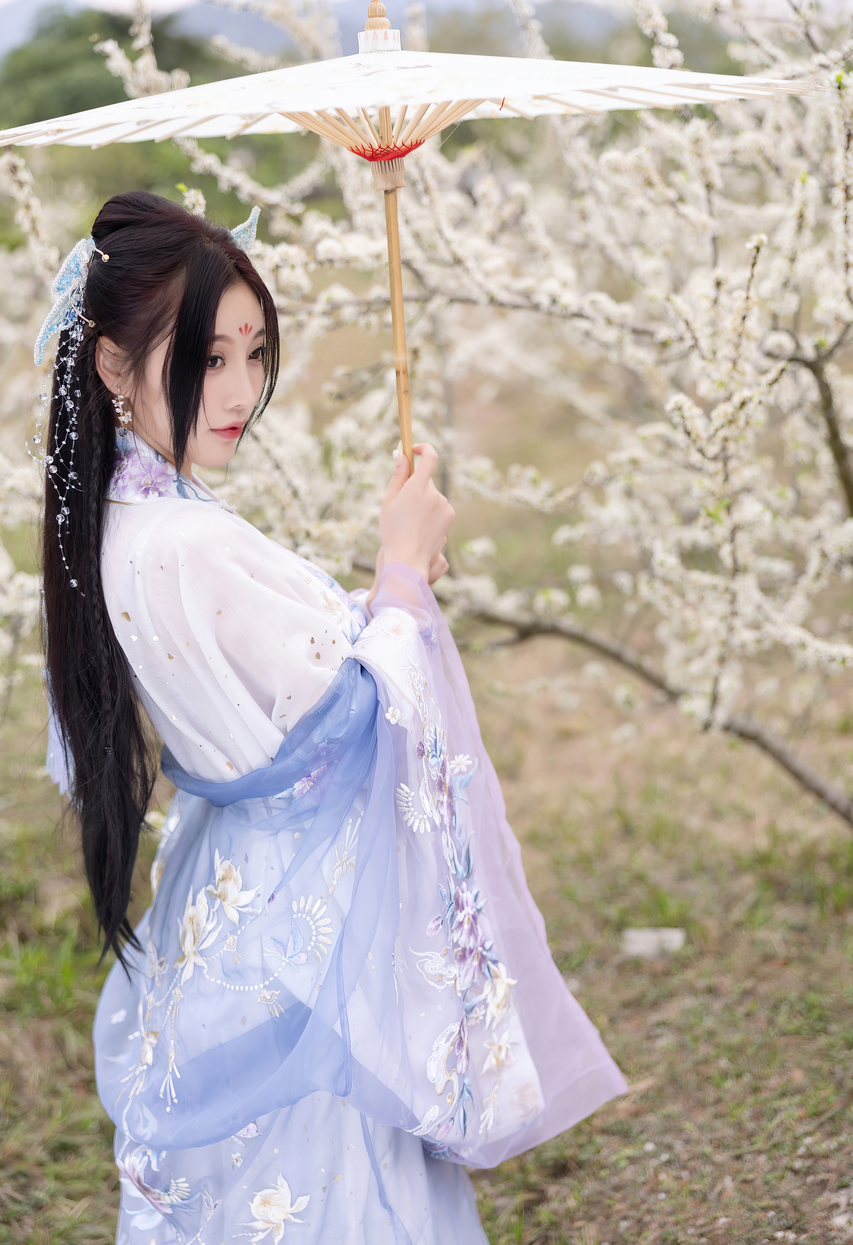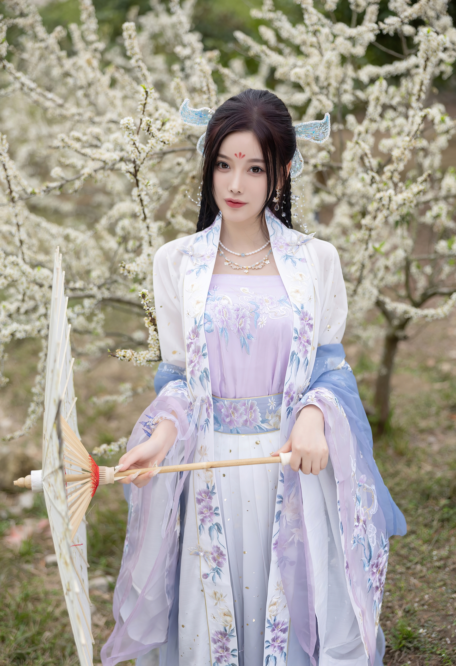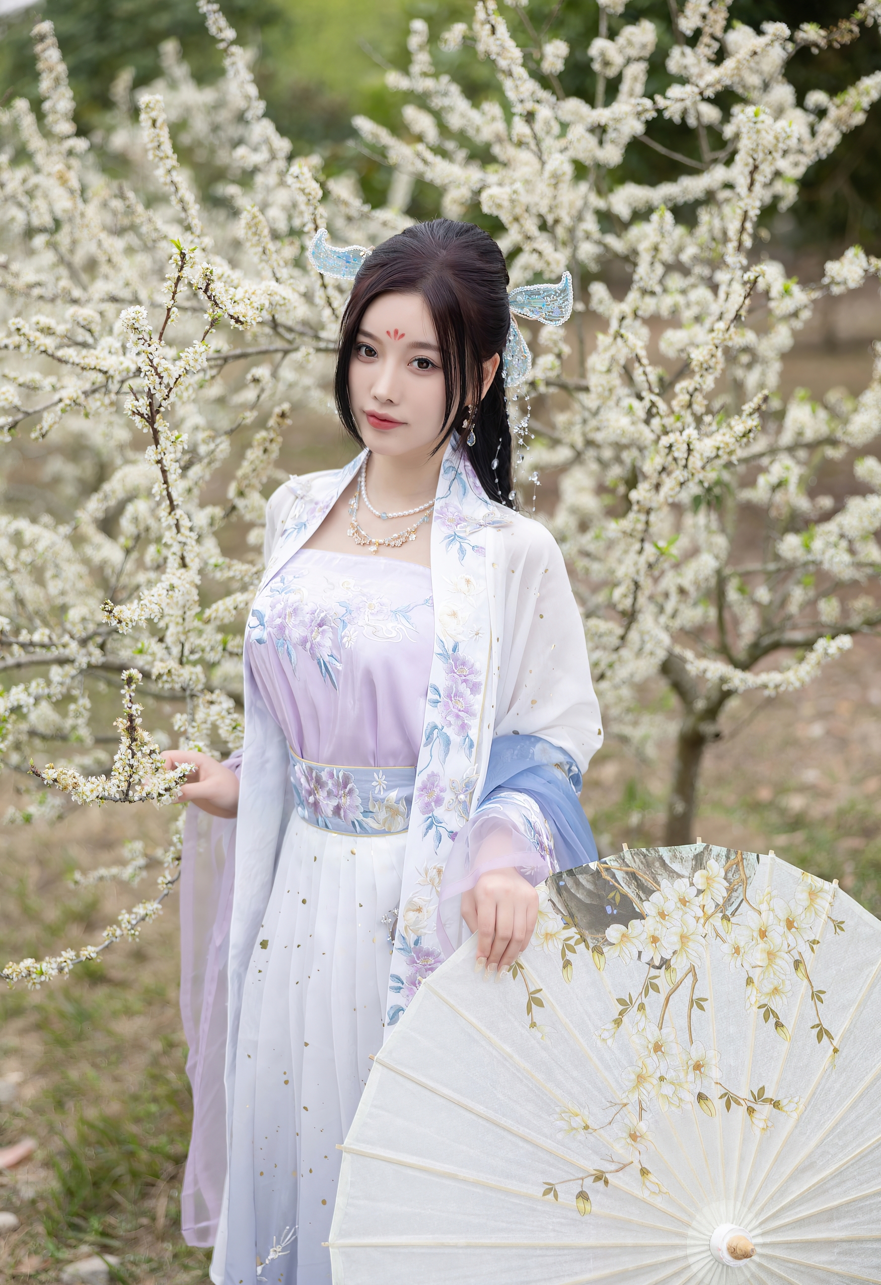 春风十里,不如她笑靥如花。在一片盛放的白色花海中,她宛如从神话中走出的精灵,静立于花枝之间,与这满园春色融为一体。一袭淡紫与浅蓝晕染的广袖长裙,层层叠叠的薄纱如云似雾,在微风中轻轻摇曳,仿佛将整个春天的柔情都裹挟其中。