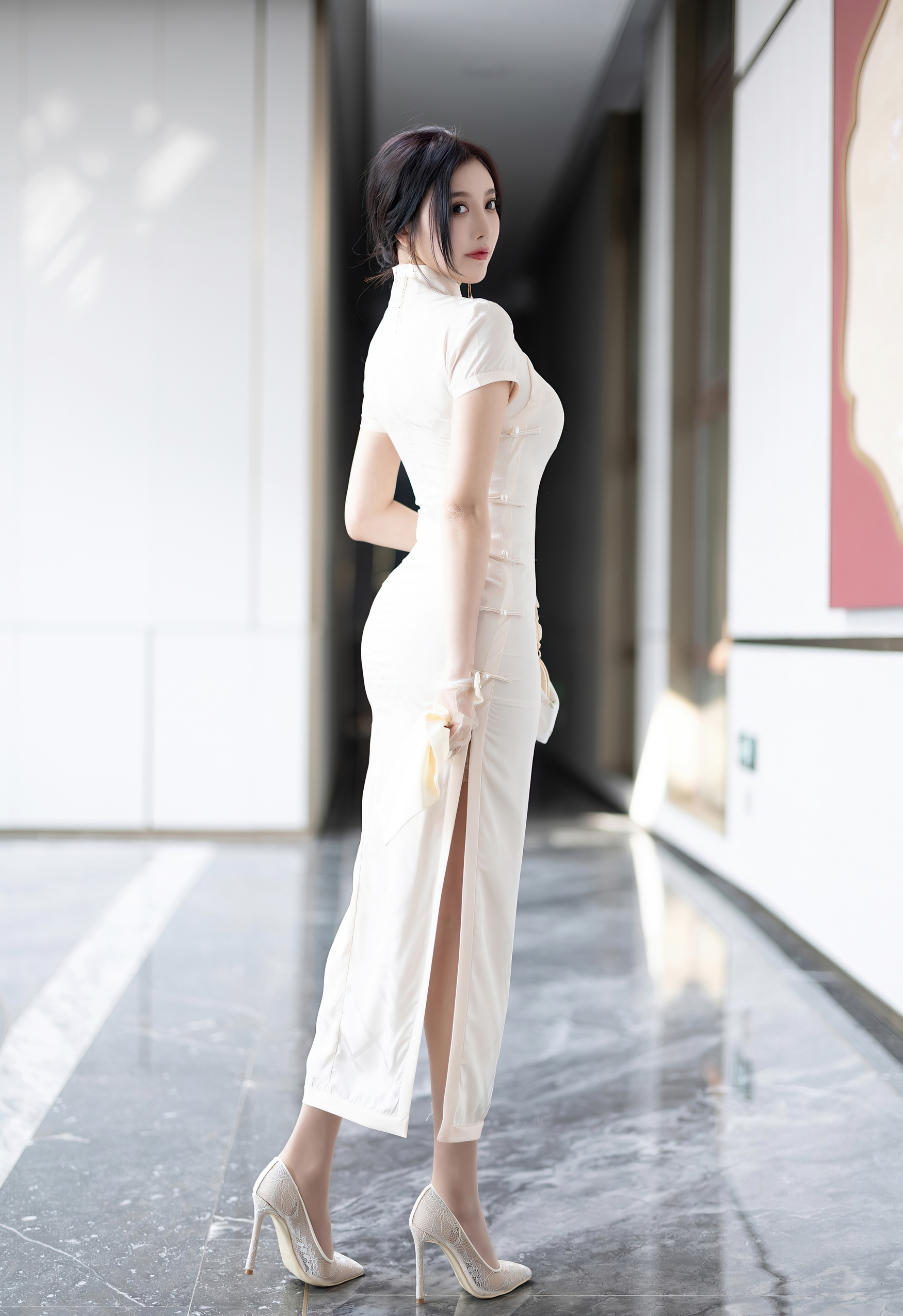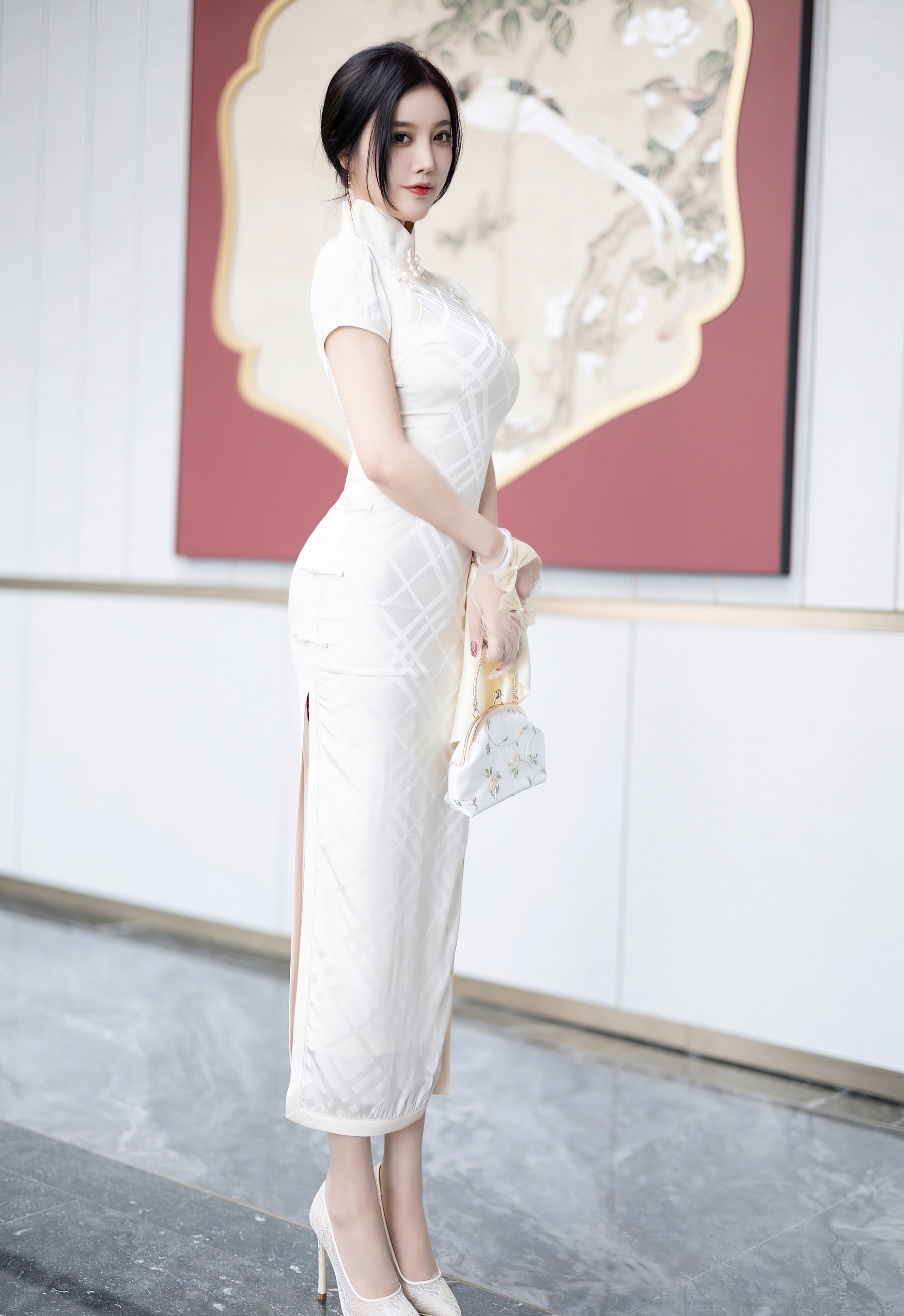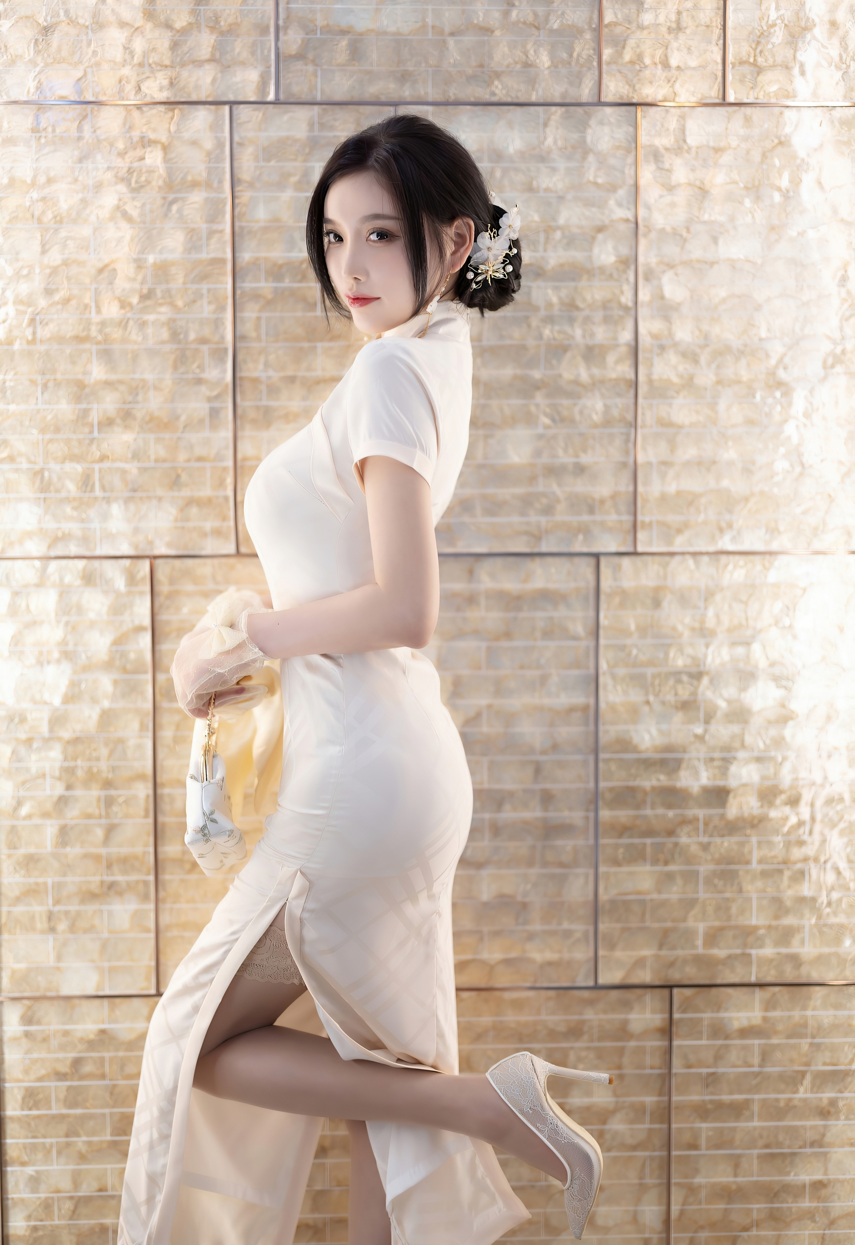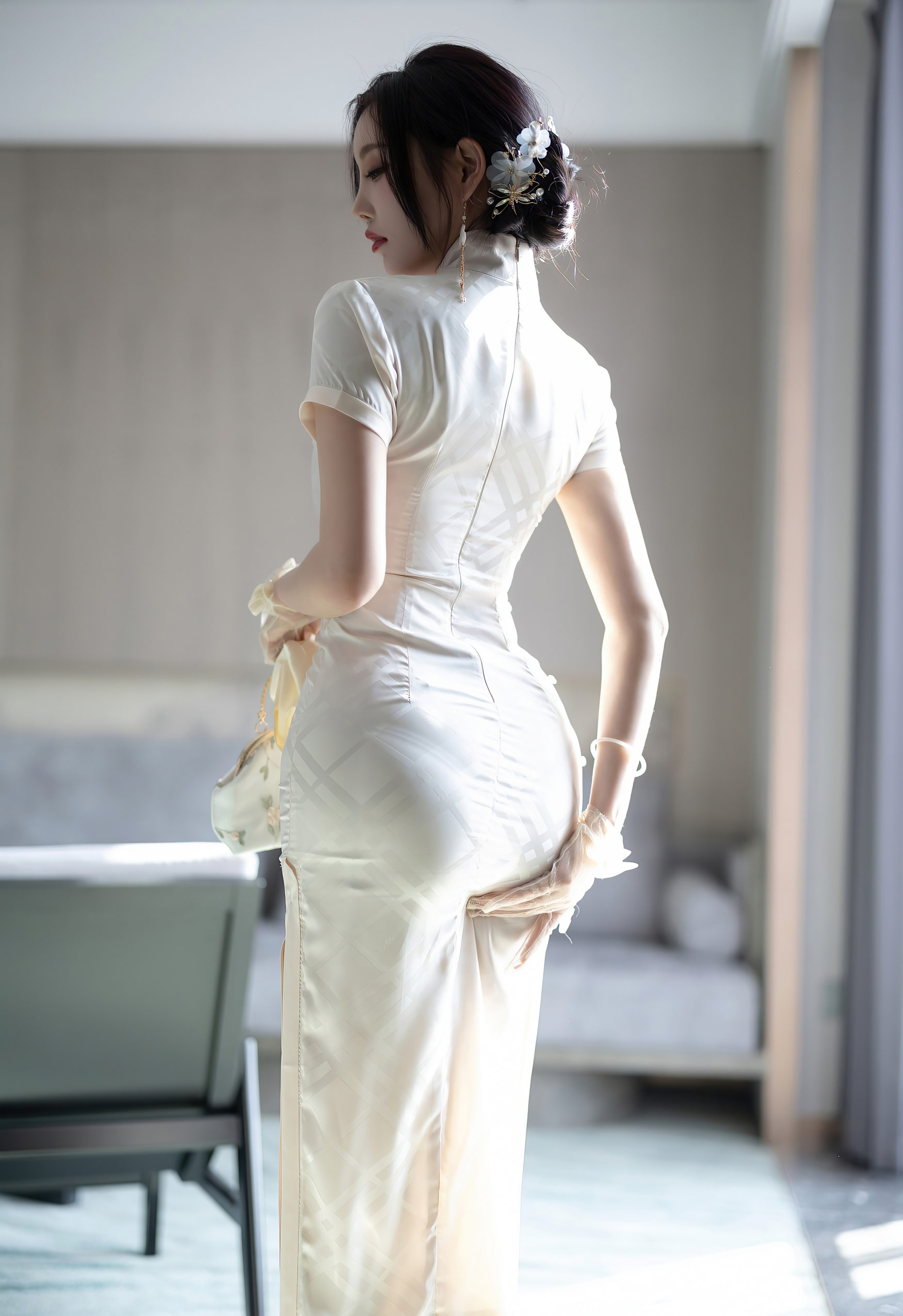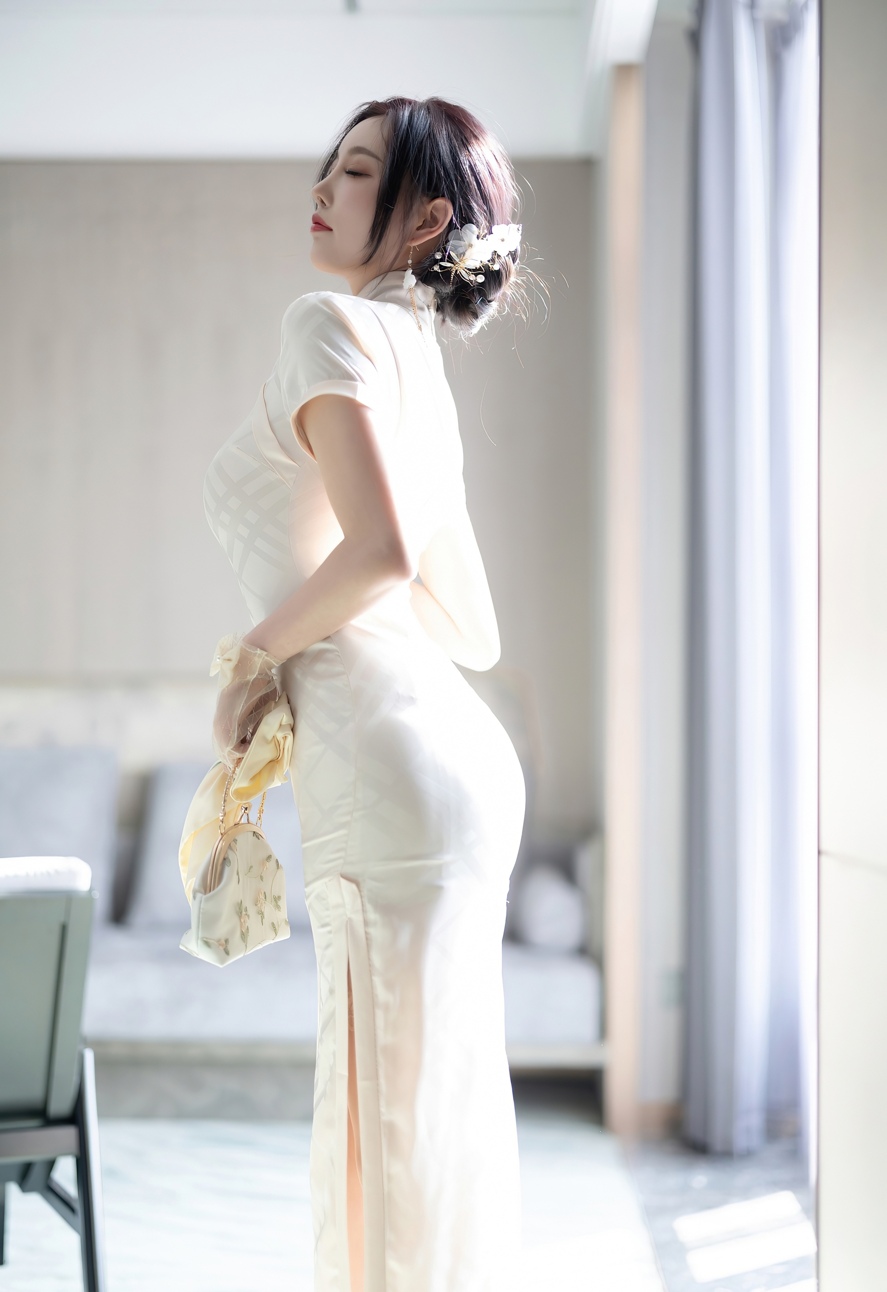 她的乌发如云,被精心挽成一个优雅的发髻,一支缀着玉兰与珍珠的发簪斜插其间,几缕碎发轻拂脸颊,更添几分慵懒与娇俏。纤细的手指上戴着薄纱手套,腕间系着小小的蝴蝶结,手中捧着一个同样素净的刺绣手包,每一个细节都透露着主人的品味与用心。