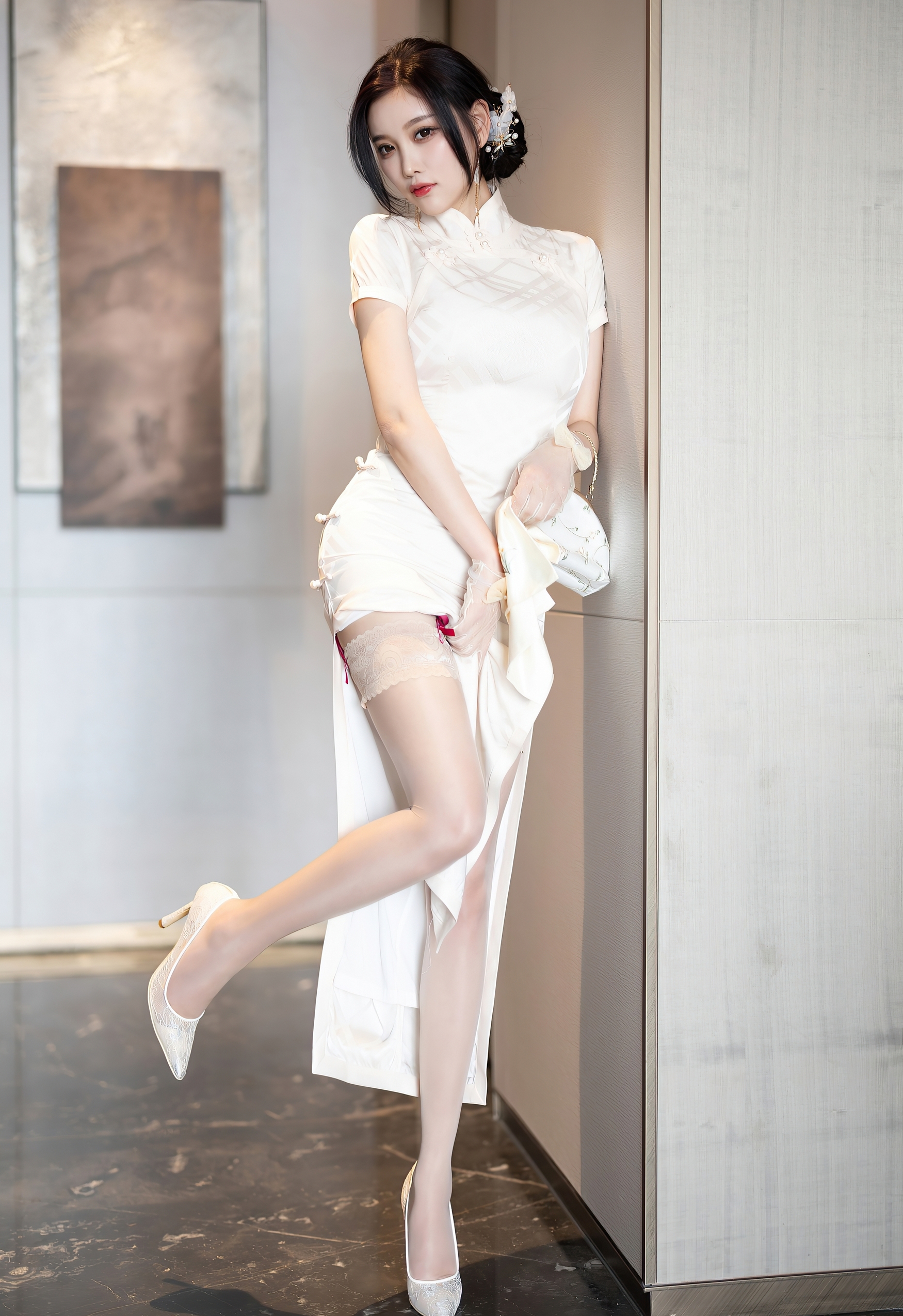 她或倚靠在床头,或坐于椅上,或立于门边,姿态万千,却无一不散发着从容与自信。高开叉的设计恰到好处地展露了腿部线条,搭配若隐若现的蕾丝吊带和透明丝袜,既保留了旗袍的端庄,又平添了一抹现代的性感与诱惑。背景中,简约的现代家居与墙上淡雅的水墨竹影相映成趣,营造出一种古今交融的独特氛围。