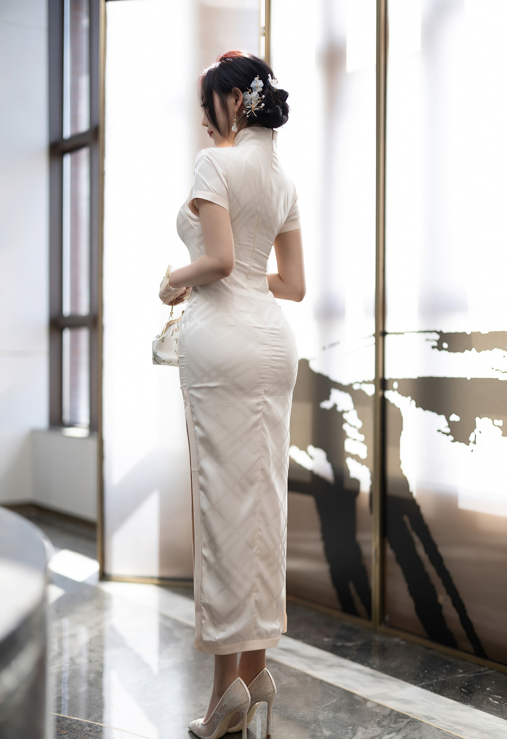 当第一缕晨光穿过洁白的纱帘,温柔地洒落在她的身上,时间仿佛在这一刻被按下了暂停键。她身着一袭素雅的月白色旗袍,立于窗前,宛如一幅从时光深处缓缓展开的画卷。那旗袍剪裁得体,完美勾勒出她玲珑有致的曲线,胸前的珍珠盘扣与领口的精致刺绣,在光线下熠熠生辉,无声地诉说着东方美学的含蓄与隽永。