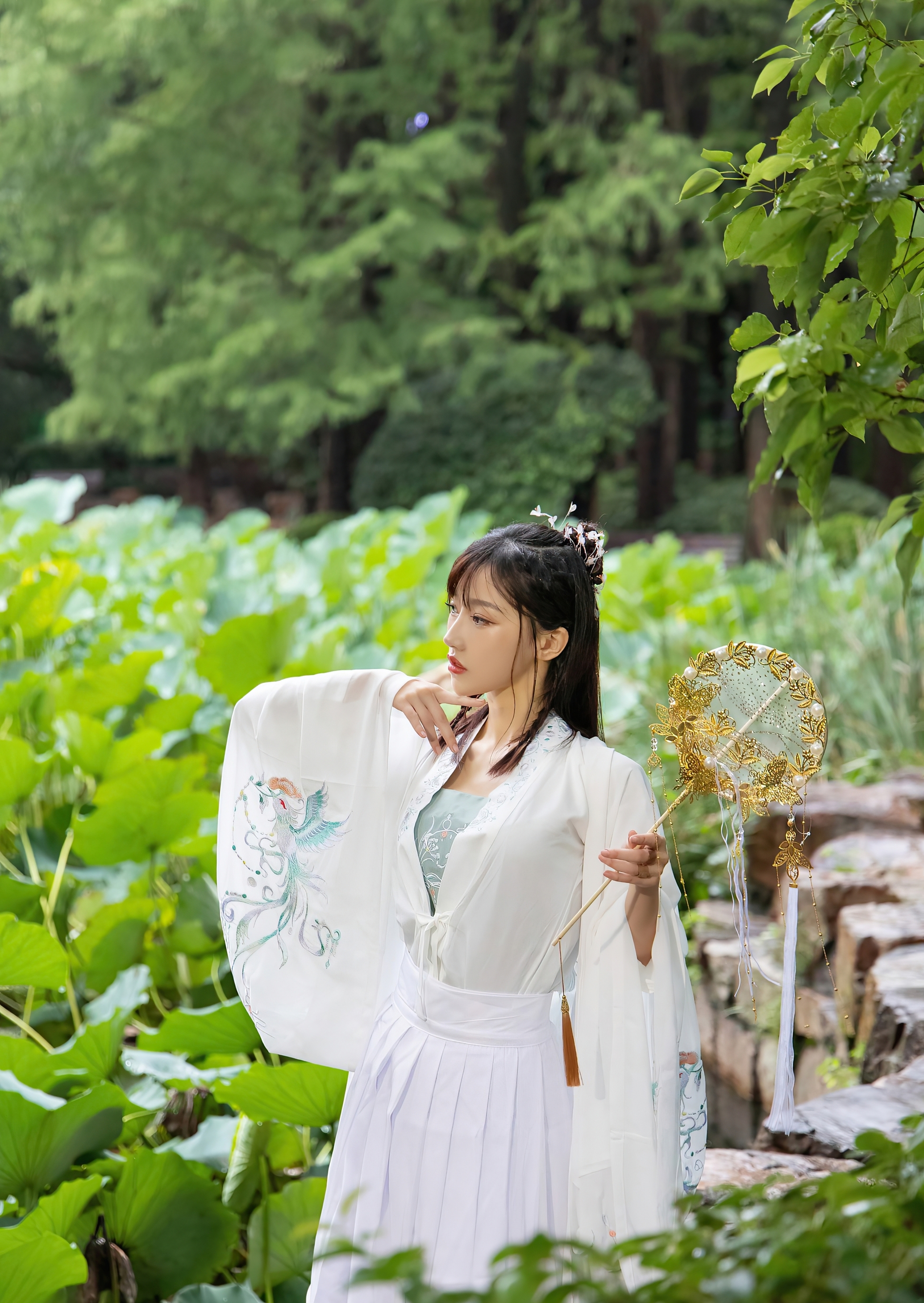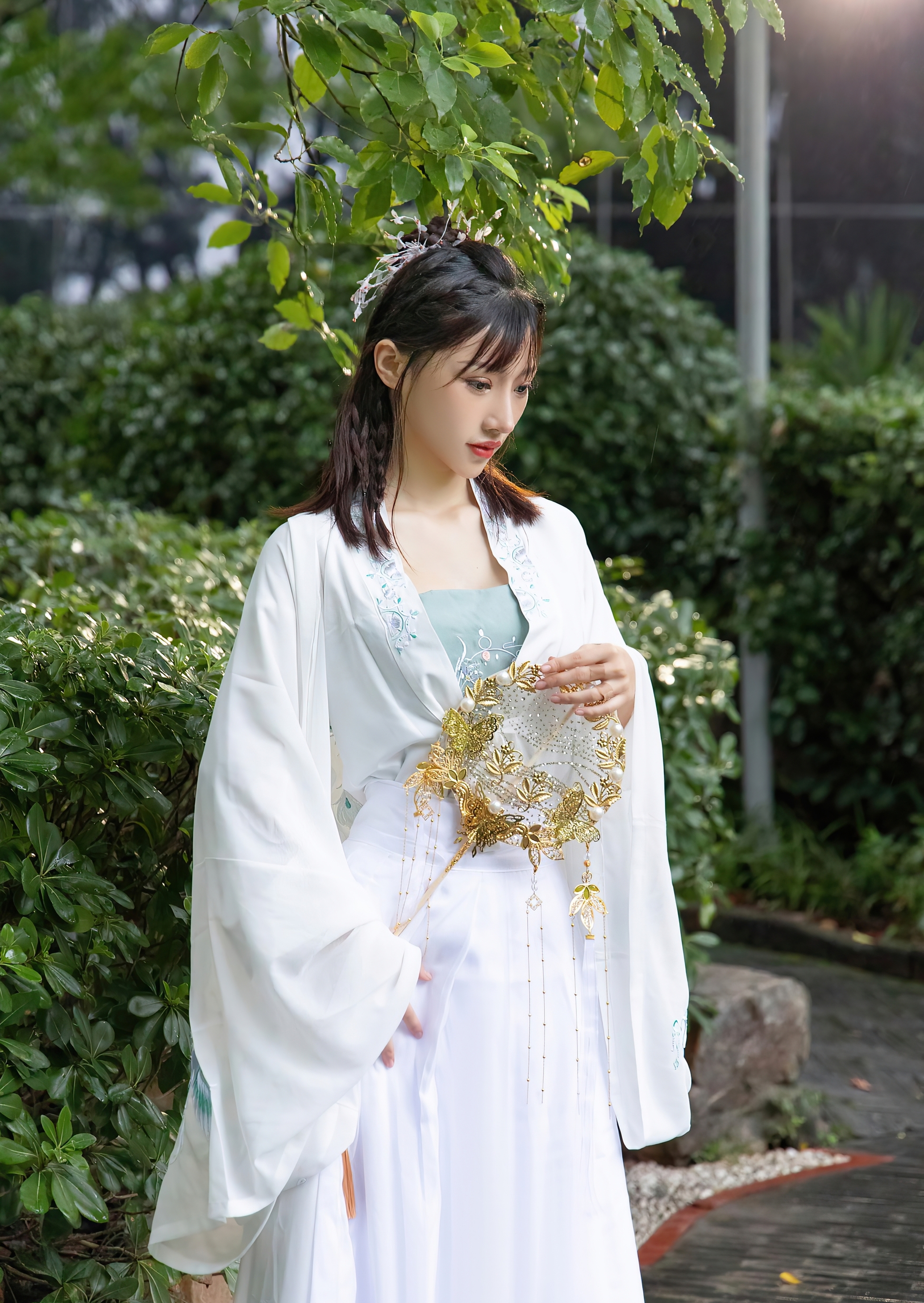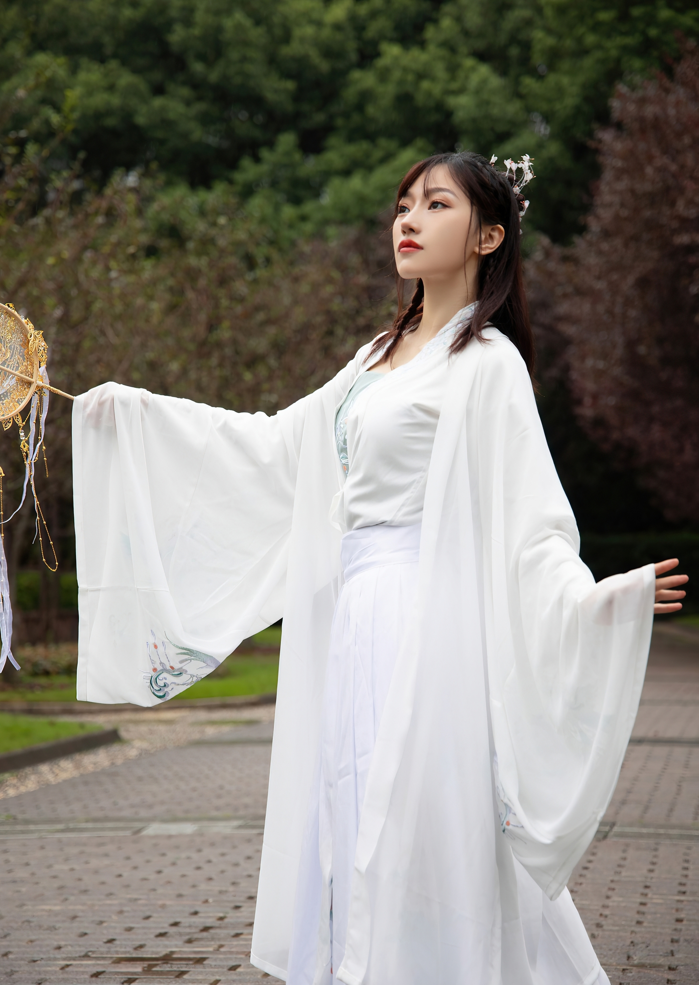 她独自伫立在幽深的庭院里,身着一袭素白的广袖流仙裙,衣袂如云,在微风中轻轻摇曳。那层叠的薄纱,仿佛承载着满腹的心事,每一次飘动,都像是无声的叹息。她手中紧握着一把精致的团扇,扇面金线勾勒,却无心轻摇,只是将它当作一个寄托,一个可以握住的、关于远方的念想。