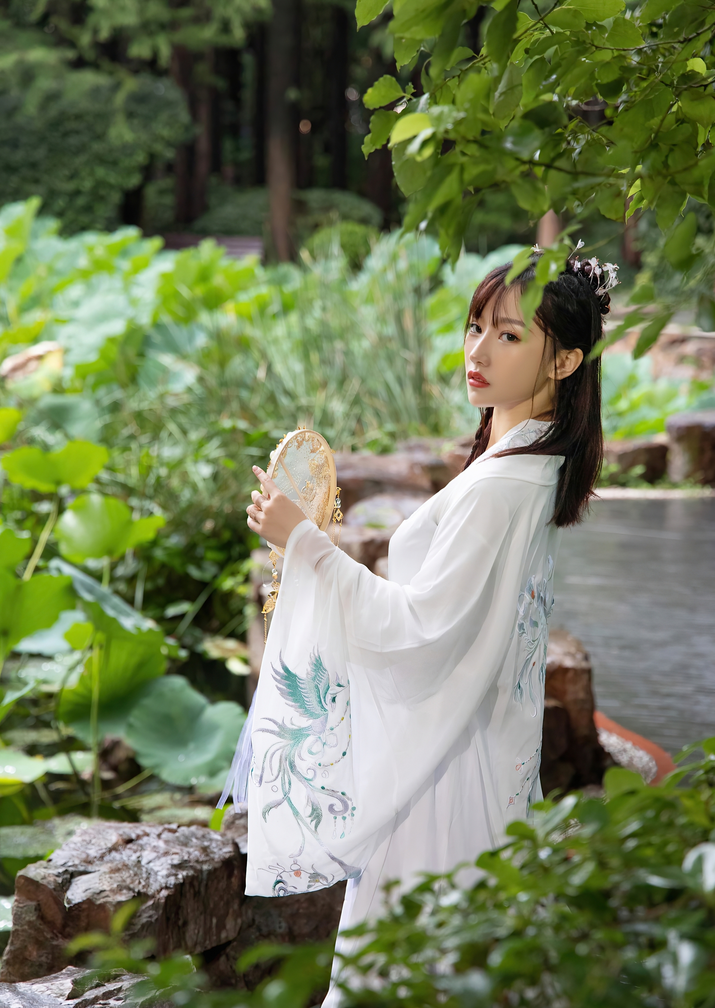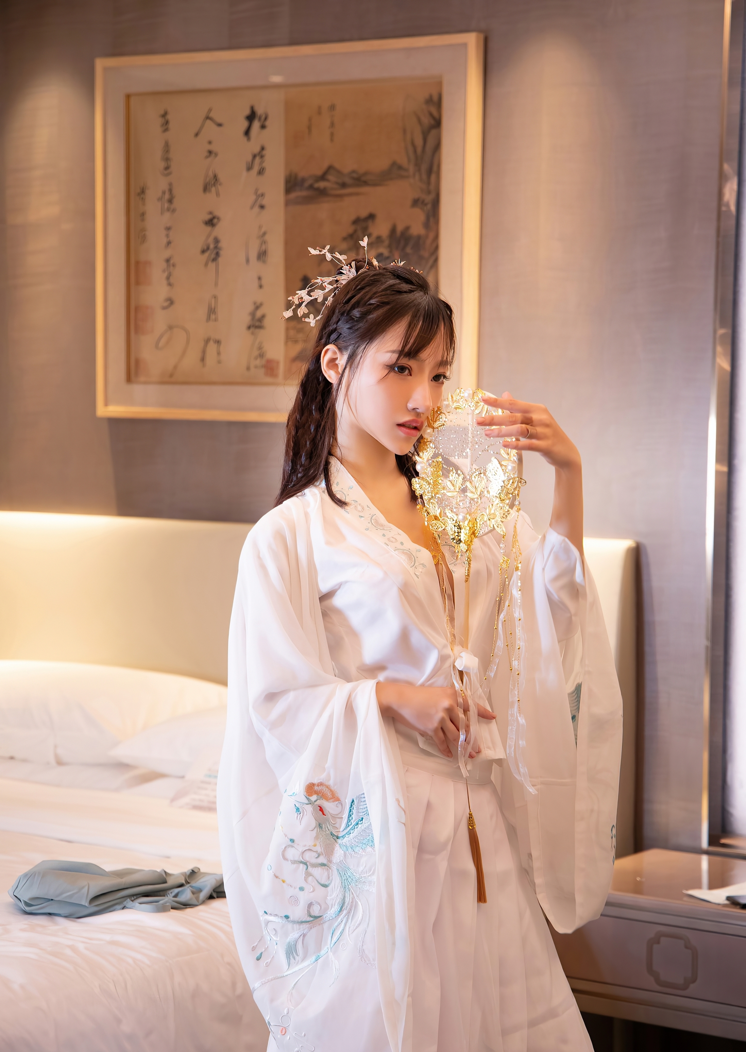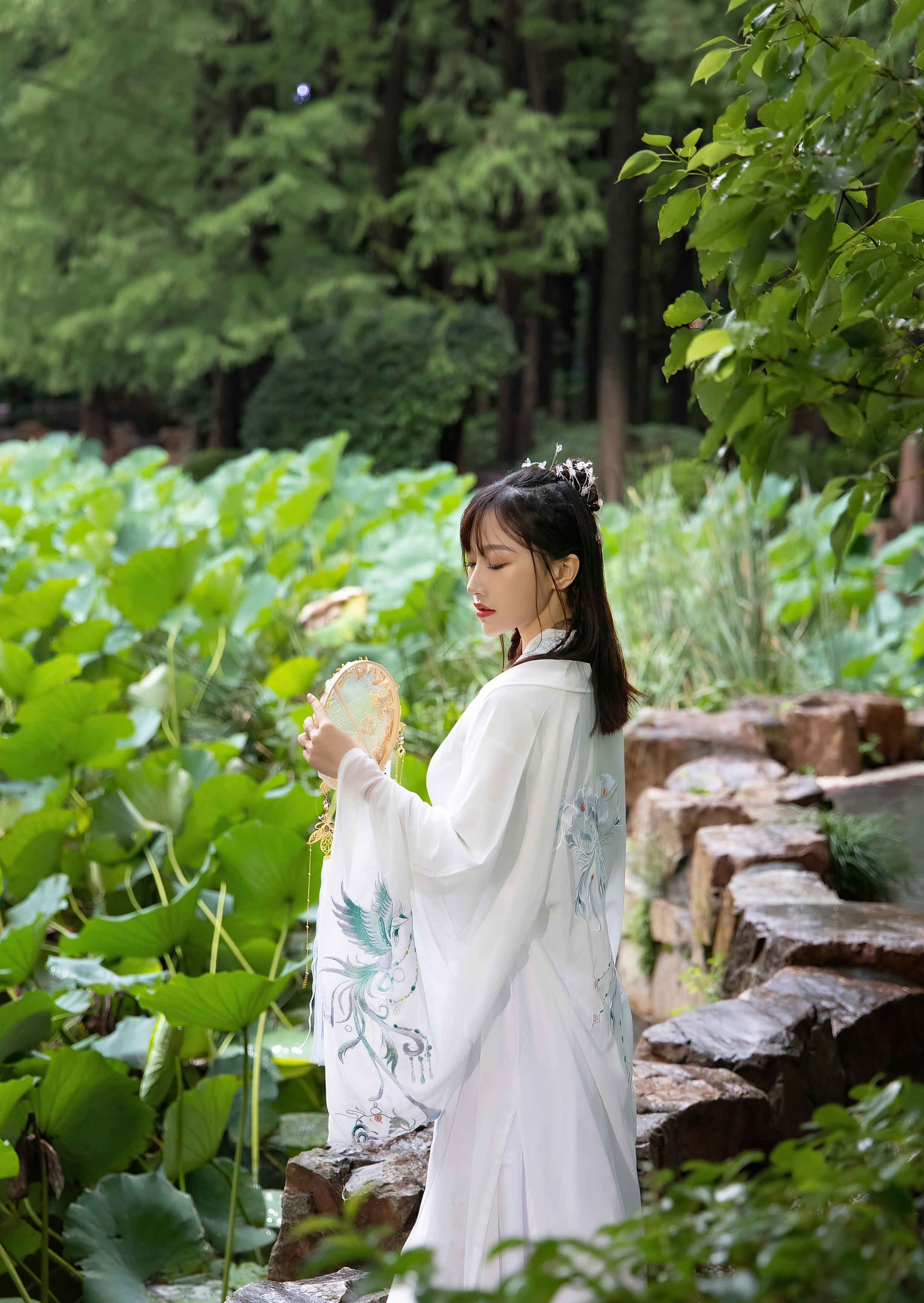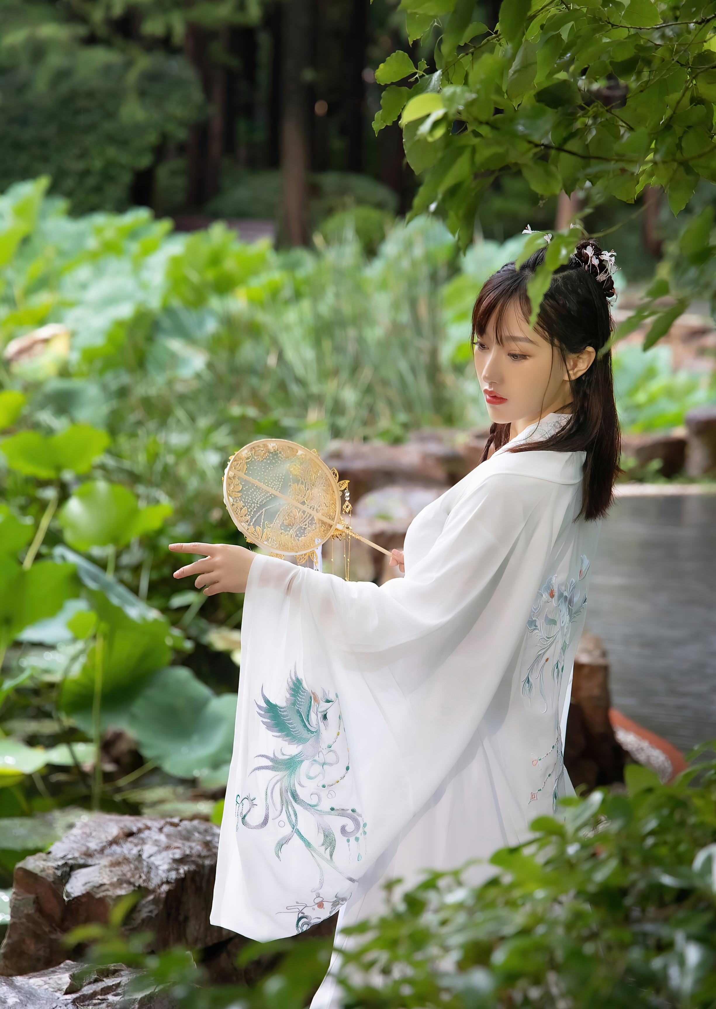 她独自伫立在幽深的庭院里,身着一袭素白的广袖流仙裙,衣袂如云,在微风中轻轻摇曳。那层叠的薄纱,仿佛承载着满腹的心事,每一次飘动,都像是无声的叹息。她手中紧握着一把精致的团扇,扇面金线勾勒,却无心轻摇,只是将它当作一个寄托,一个可以握住的、关于远方的念想。