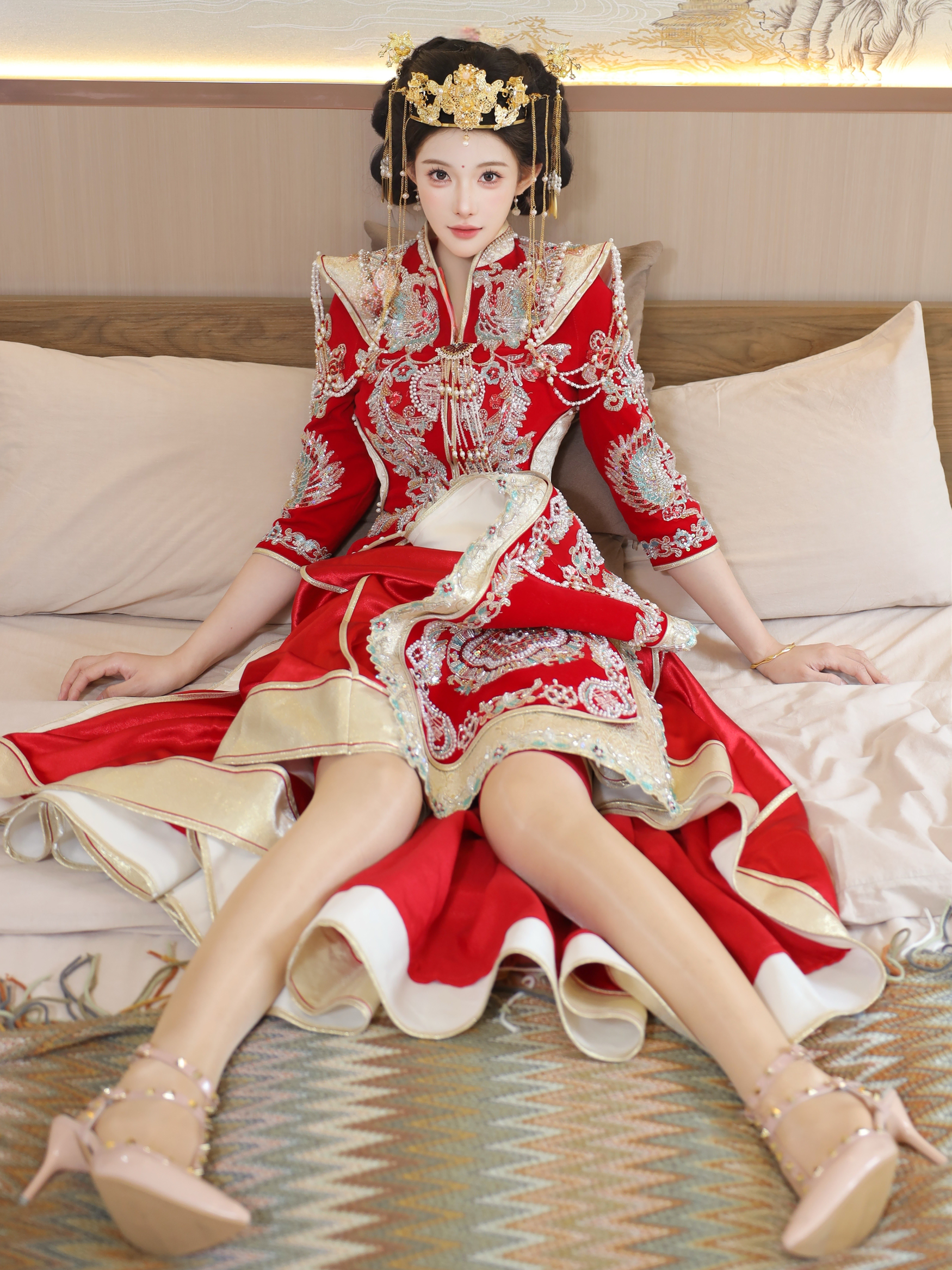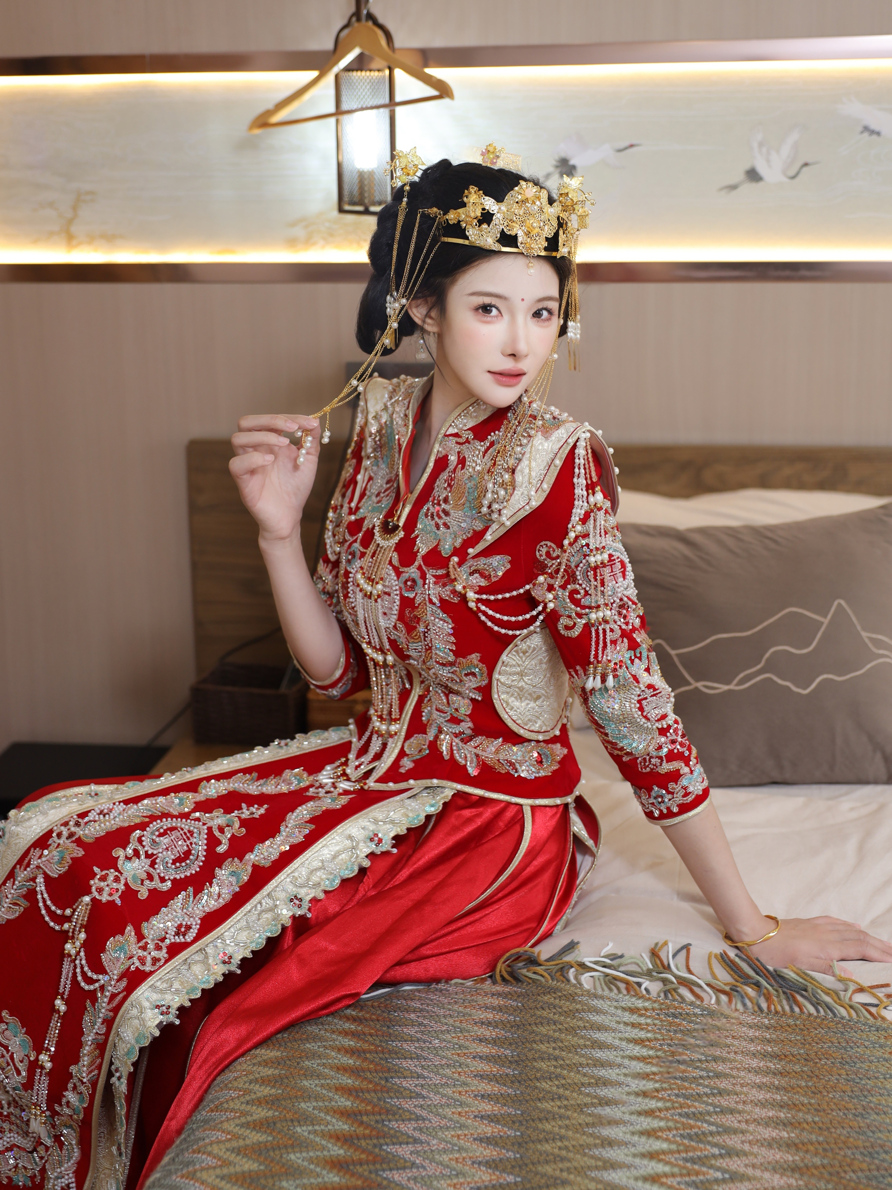 她慵懒地倚在柔软的床榻之上,一袭浓烈如火的红色秀禾服,将她的身姿勾勒得玲珑有致。金线银珠,龙凤呈祥,每一针每一线都诉说着“囍”字的盛大与欢愉。然而,这满身的锦绣与荣光,此刻却只映衬出她眉宇间那一抹挥之不去的寂寥。