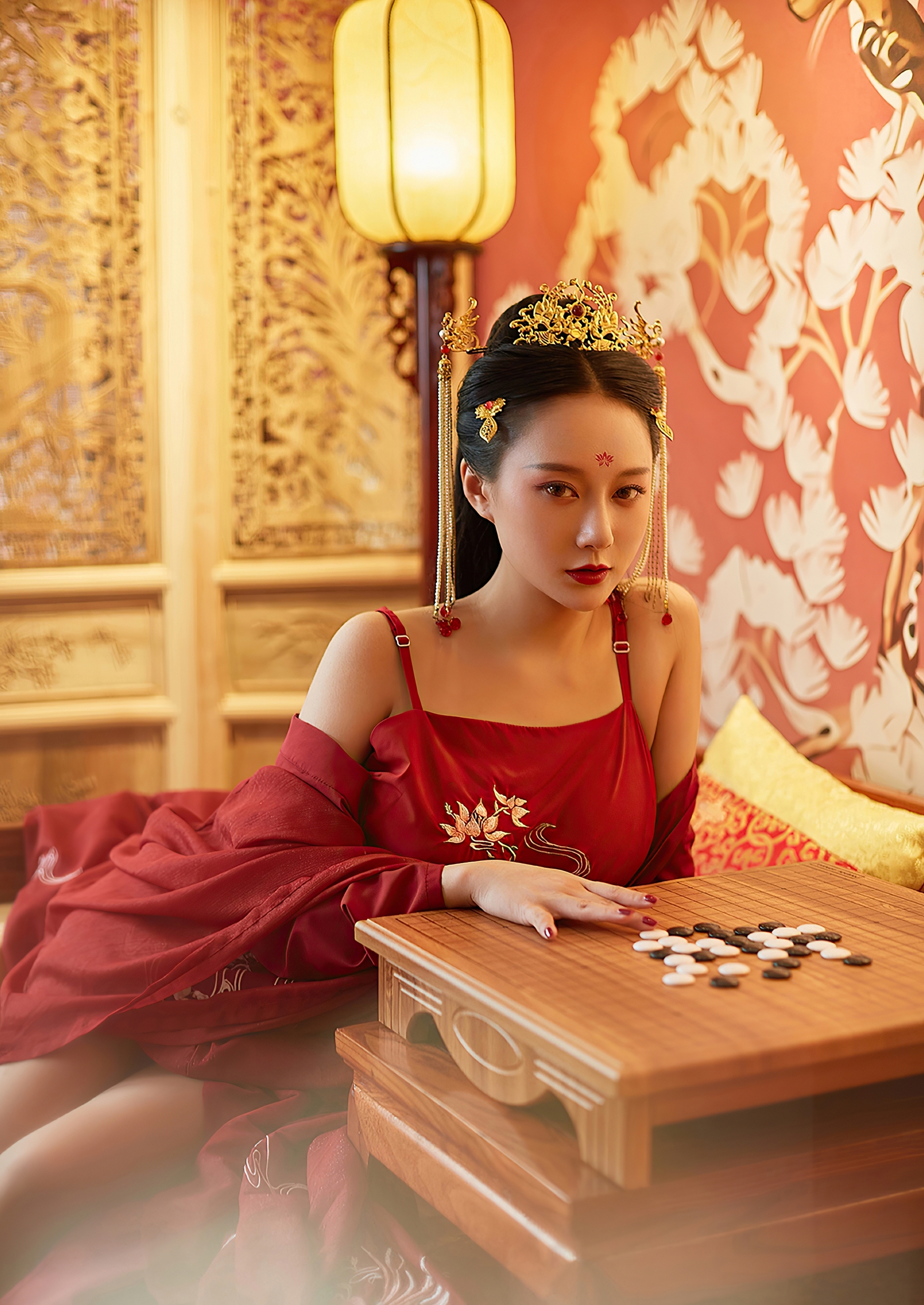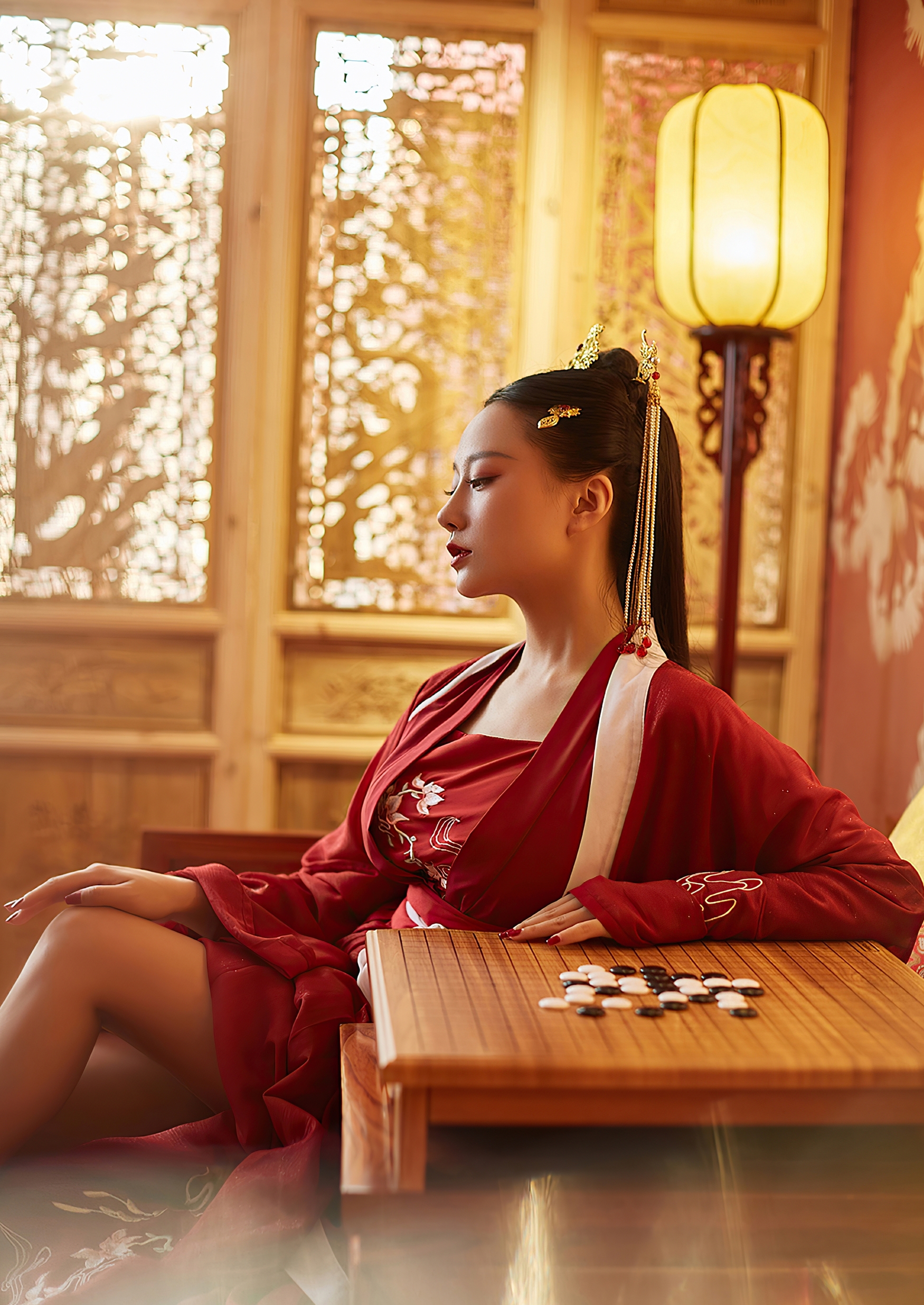 眼前,是一盘未竟的棋局。黑白子散落于木质棋盘之上,仿佛一场刚刚结束、却无人宣告胜负的博弈。她伸出纤指,轻轻捻起一枚白子,指尖微凉,如同她此刻的心境。这盘棋,是与谁对弈?是那个曾许诺“落子无悔”的人吗?如今,棋子尚在,人却杳然。她凝望着棋盘,眼神却穿透了方寸之间,飘向了远方,飘向了那些再也无法重来的、并肩而坐的时光。