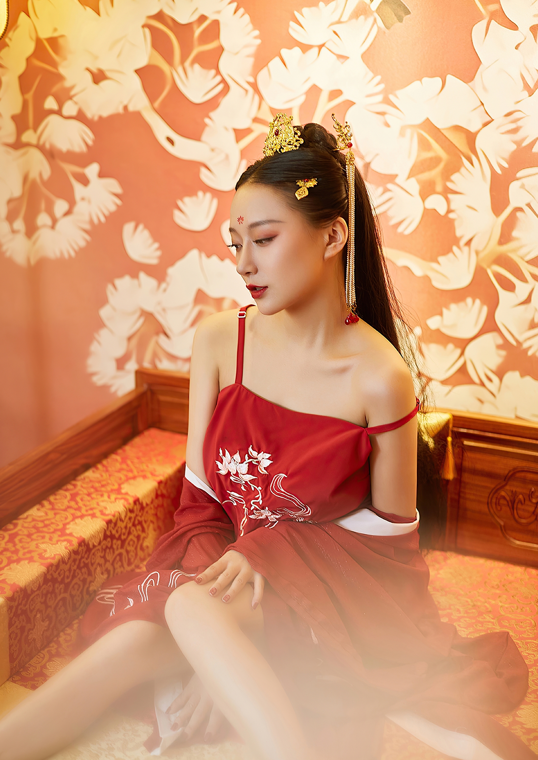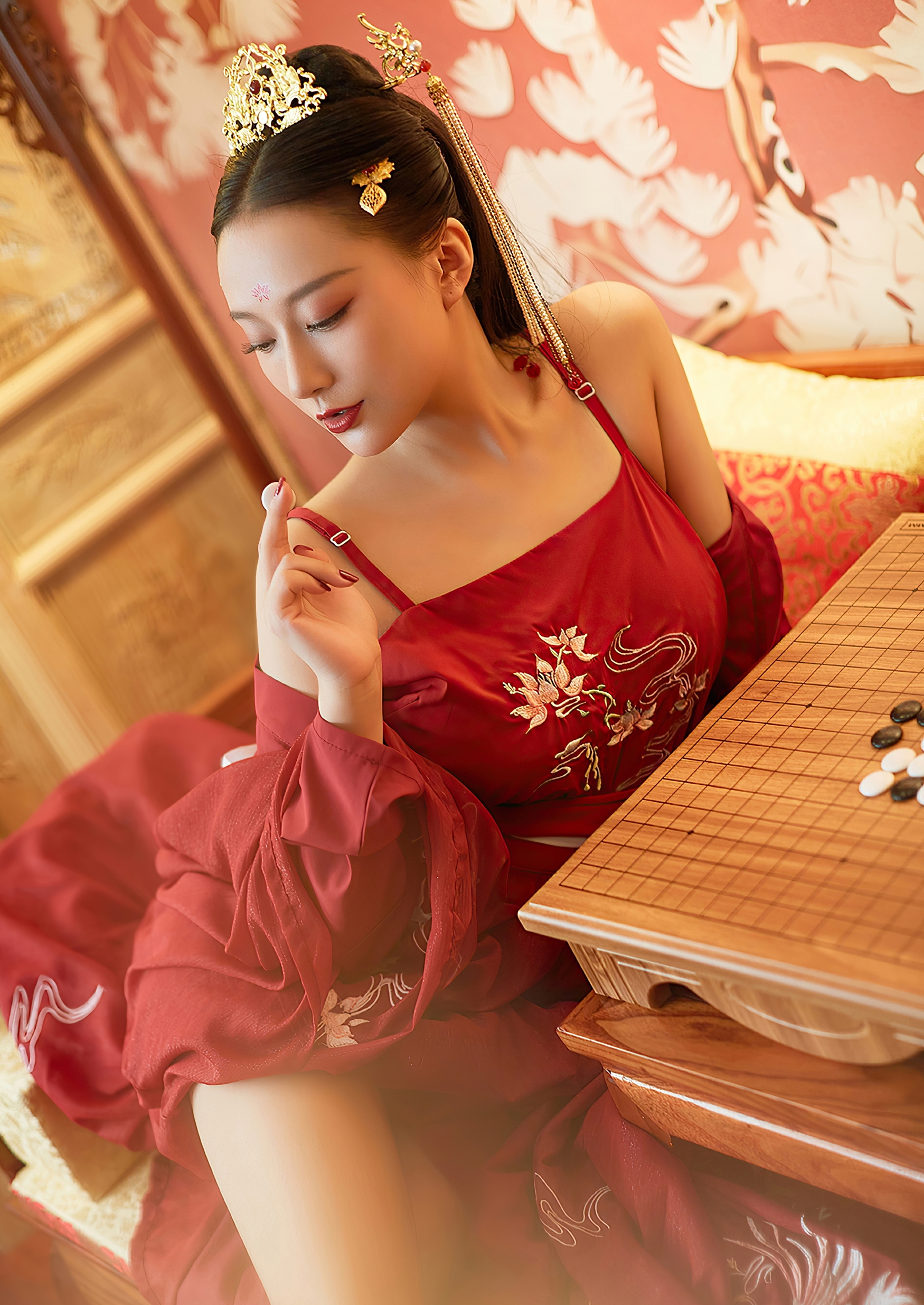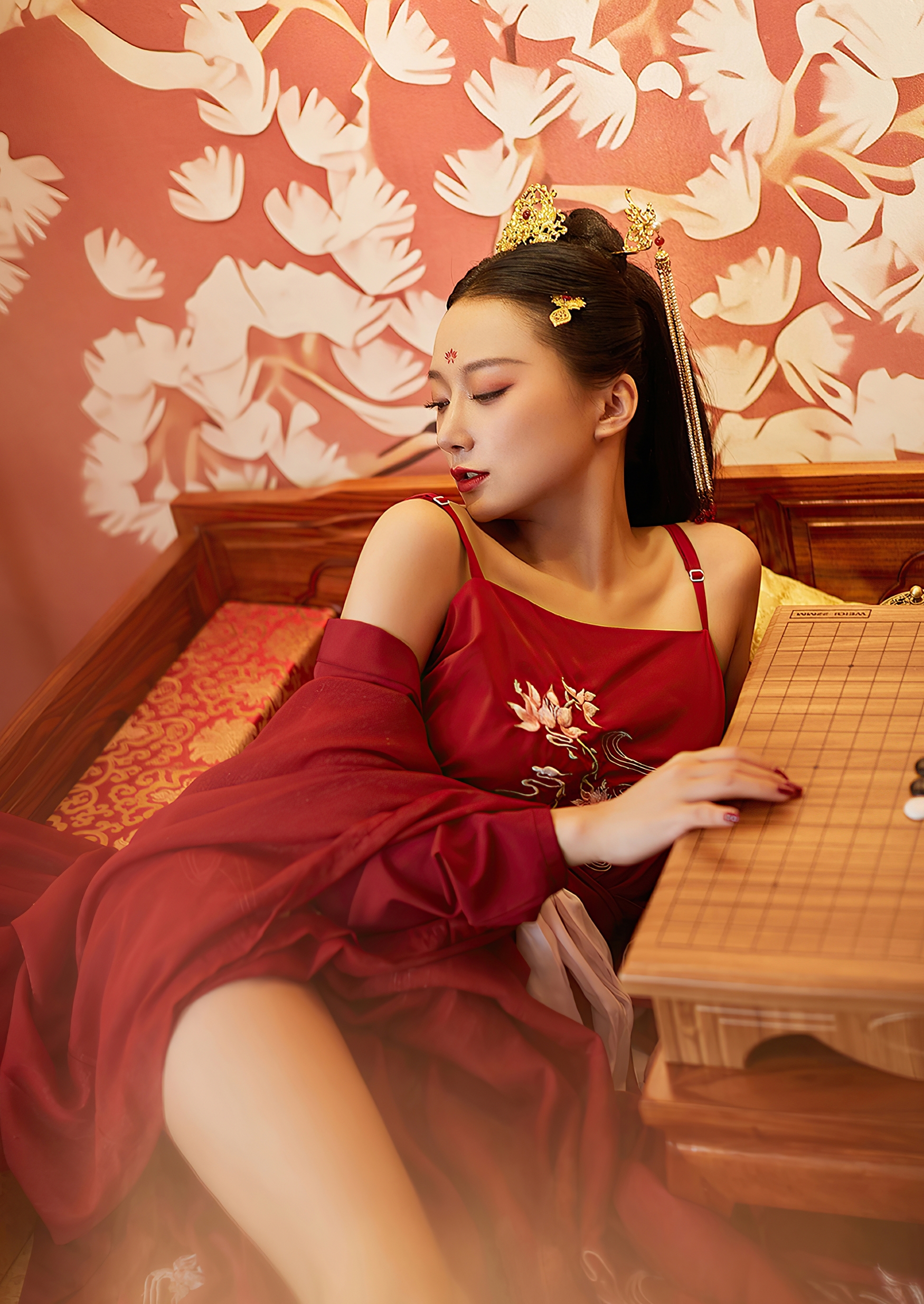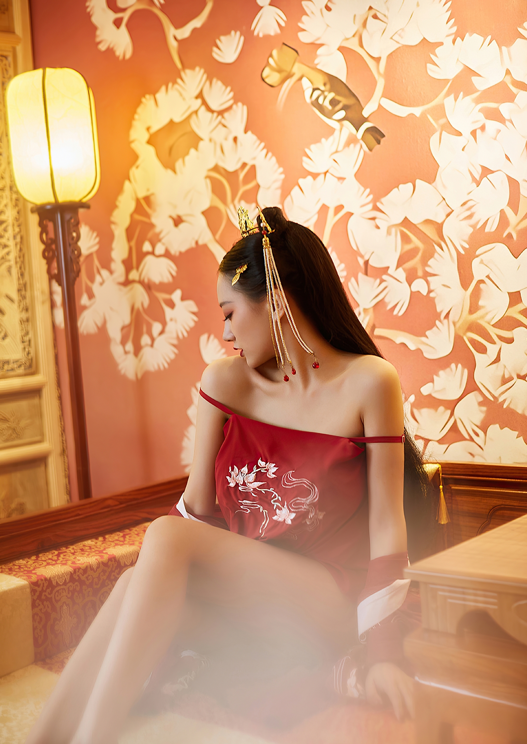 她斜倚在那张温润的红木罗汉床上,身着一袭如晚霞般浓烈的红裳。薄纱轻笼,勾勒出玲珑的曲线,肩头半露,是无声的邀请,也是寂寞的叹息。乌发如瀑,被一支精巧的金钗与流苏步摇挽起,几缕青丝不经意地垂落颈侧,更添几分慵懒的风情。