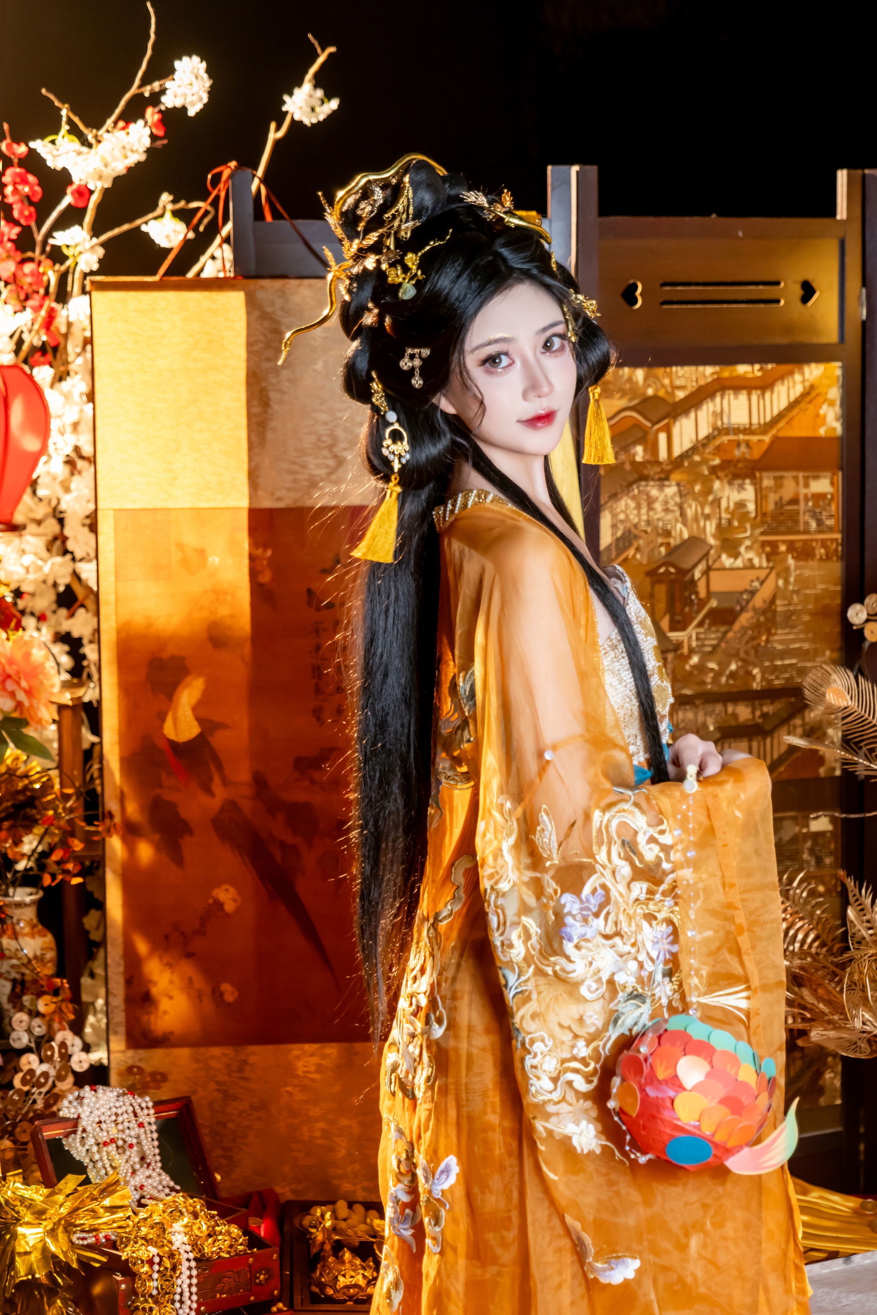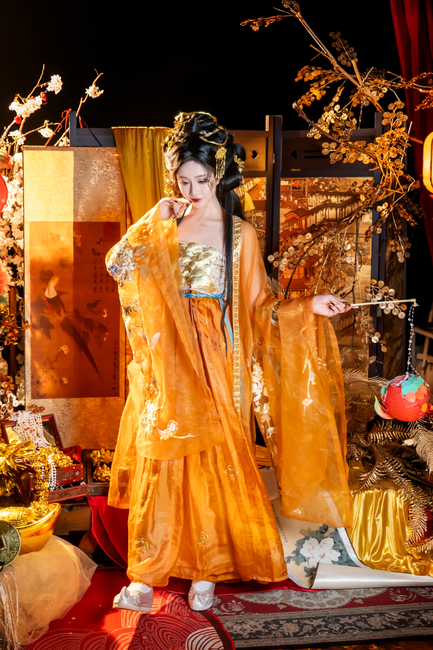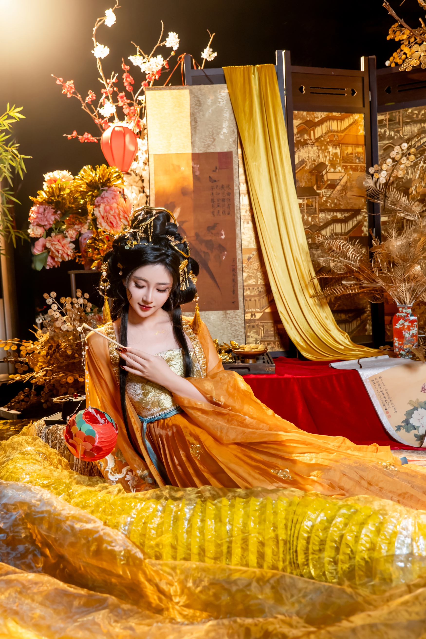 她身着一袭流金溢彩的华裳,那金线绣出的繁花,在烛火下仿佛有了生命,无声地绽放着,却只映衬出满室的寂寥。轻纱半掩,遮不住眉间那抹化不开的愁绪,也挡不住眼底深处,那一汪为谁而蓄的清泪。