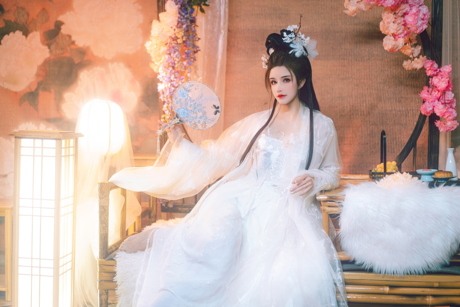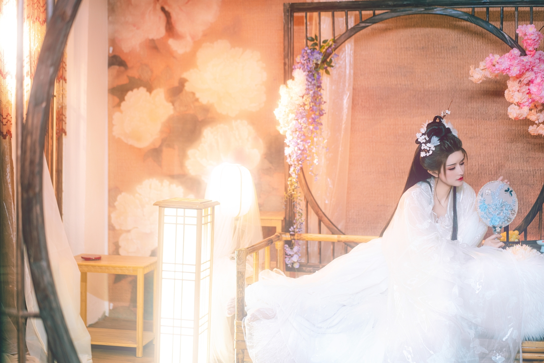 她身着一袭流云般的素白长裙,裙裾上绣着翩跹的蝶影,在暖黄的灯光下,仿佛随时会振翅飞走。她端坐于竹椅之上,手中轻握一把精巧的团扇,扇面上的蓝花与蜻蜓栩栩如生,却映不出她眼中那抹化不开的忧郁。