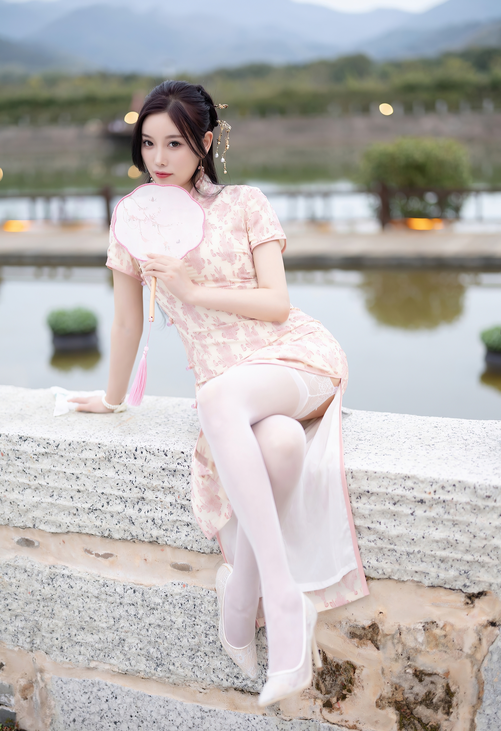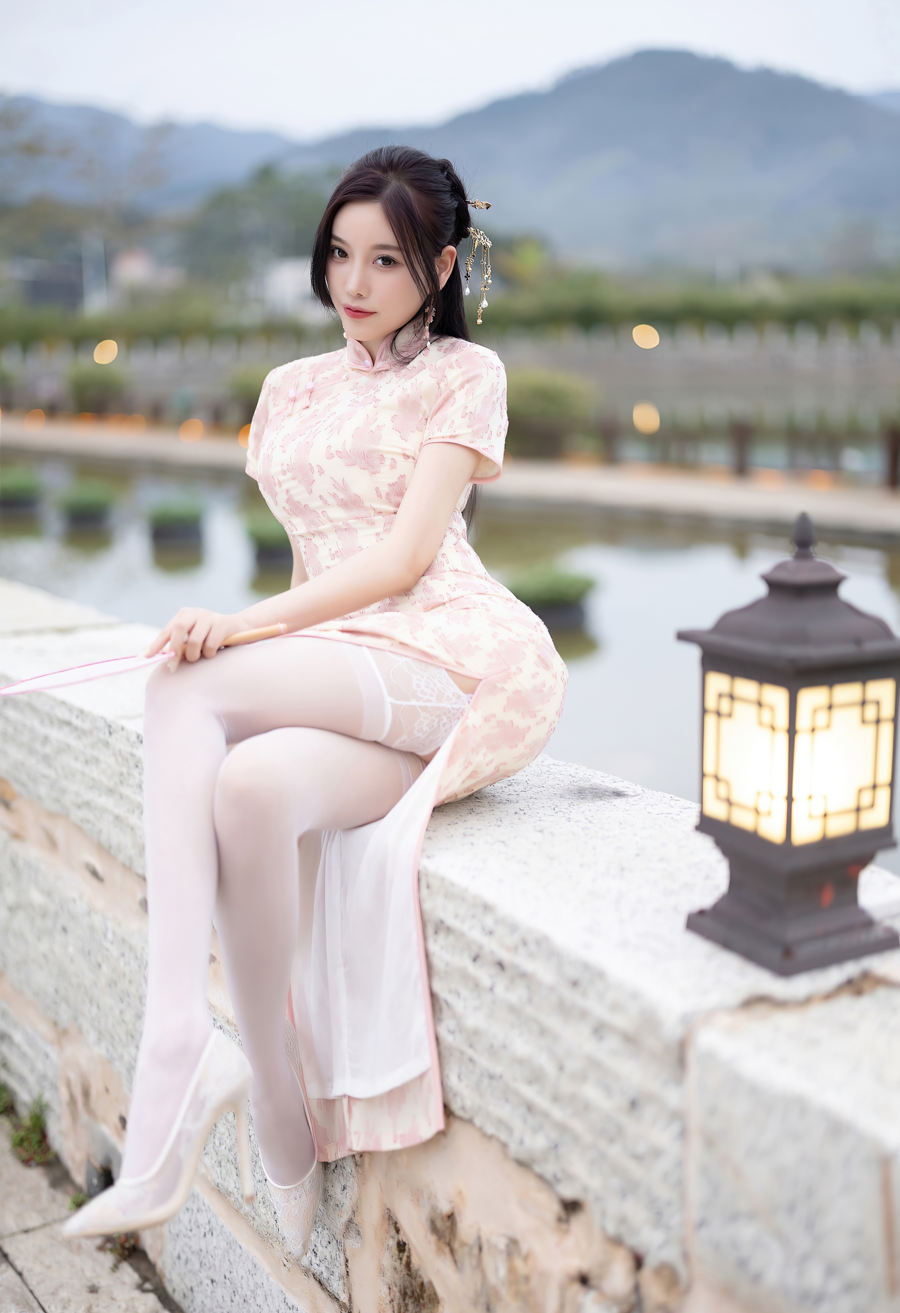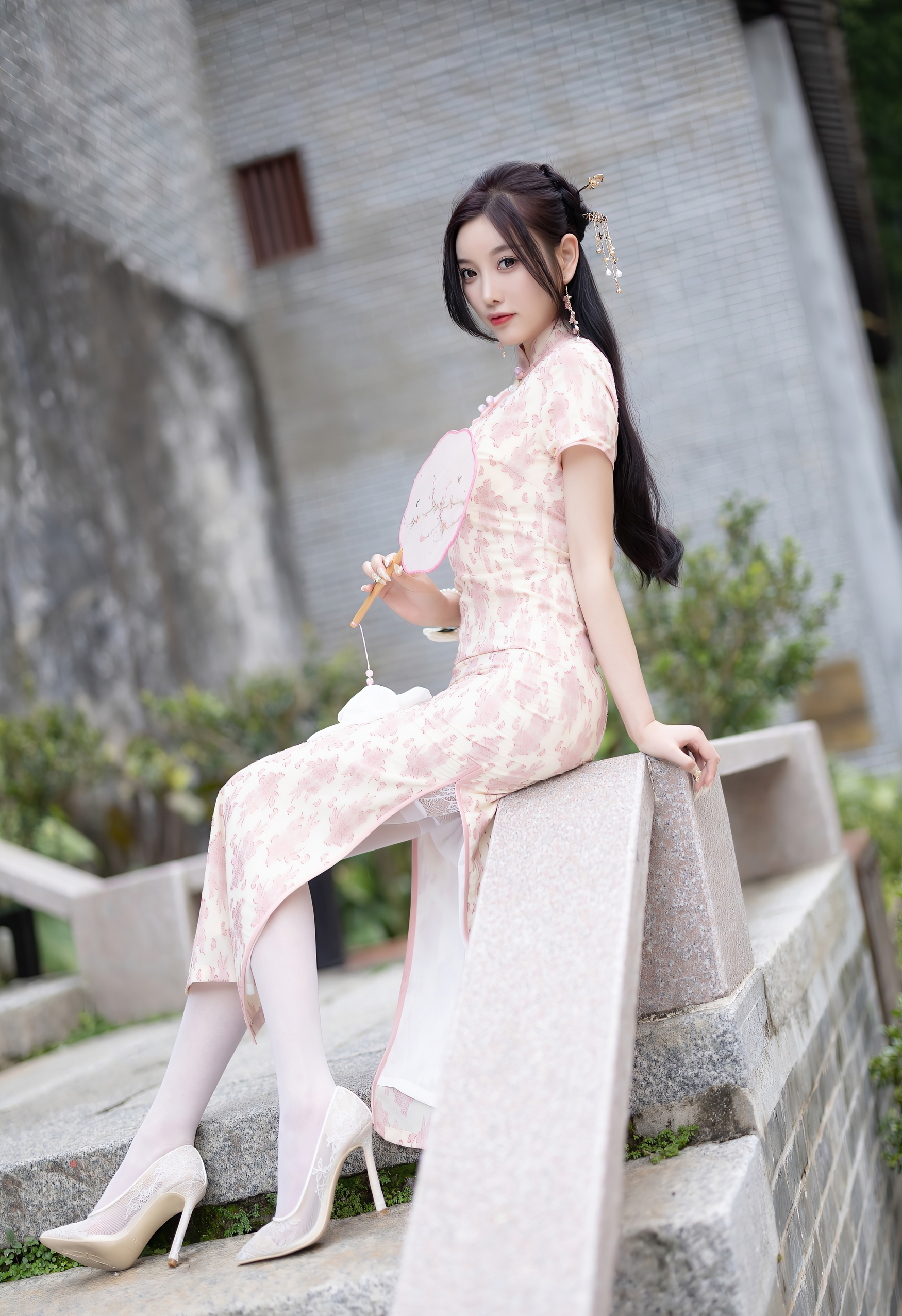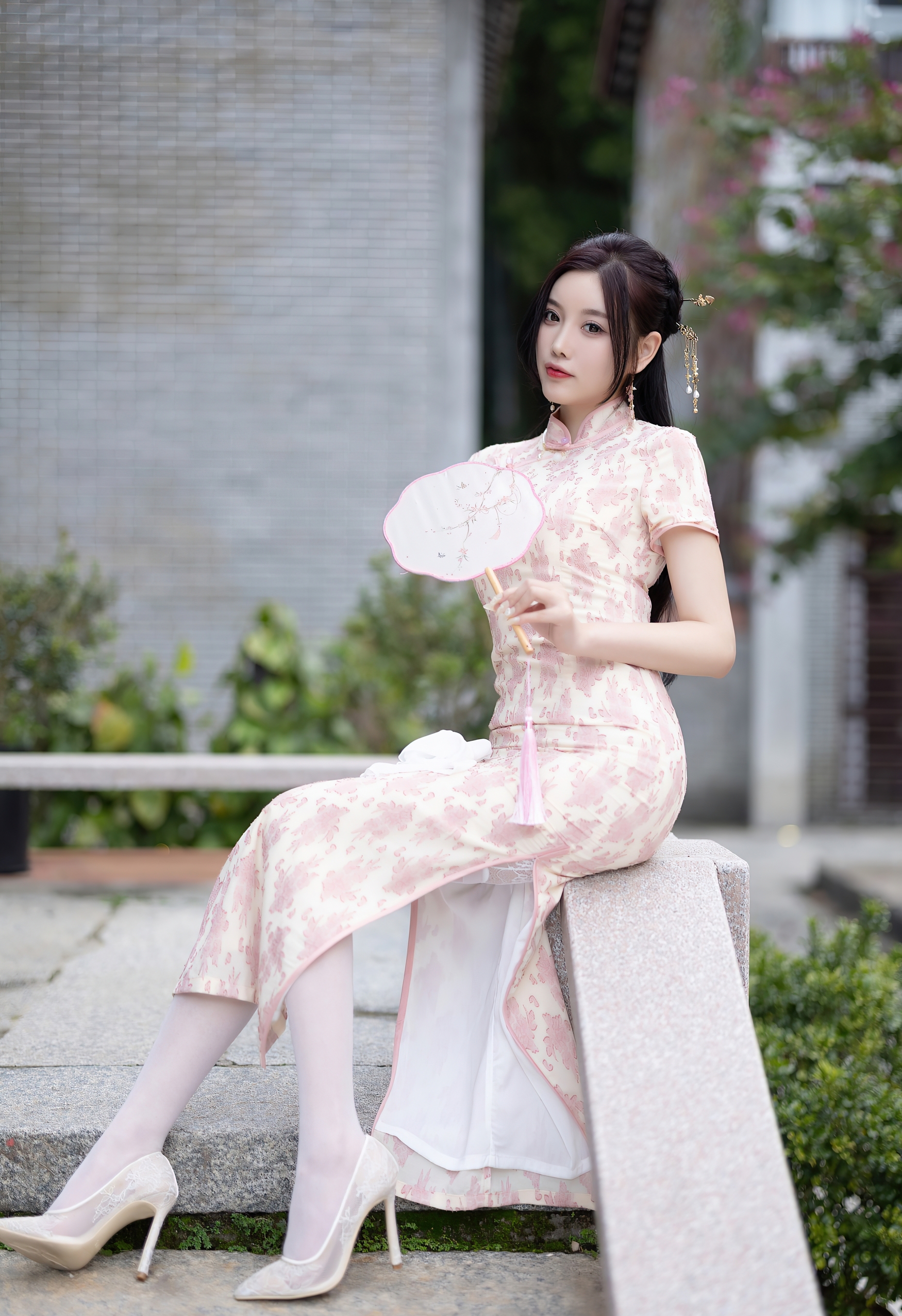 一袭粉白相间的旗袍,如初绽的樱花般娇嫩,细腻的暗纹在丝滑的缎面上若隐若现,勾勒出曼妙的身姿。高开衩的设计,不经意间流露出一丝现代的灵动与自信,与旗袍的古典韵味形成绝妙的平衡。脚上那双缀着蕾丝的浅色高跟鞋,与薄如蝉翼的丝袜相得益彰,将东方的含蓄与西方的精致完美融合。
