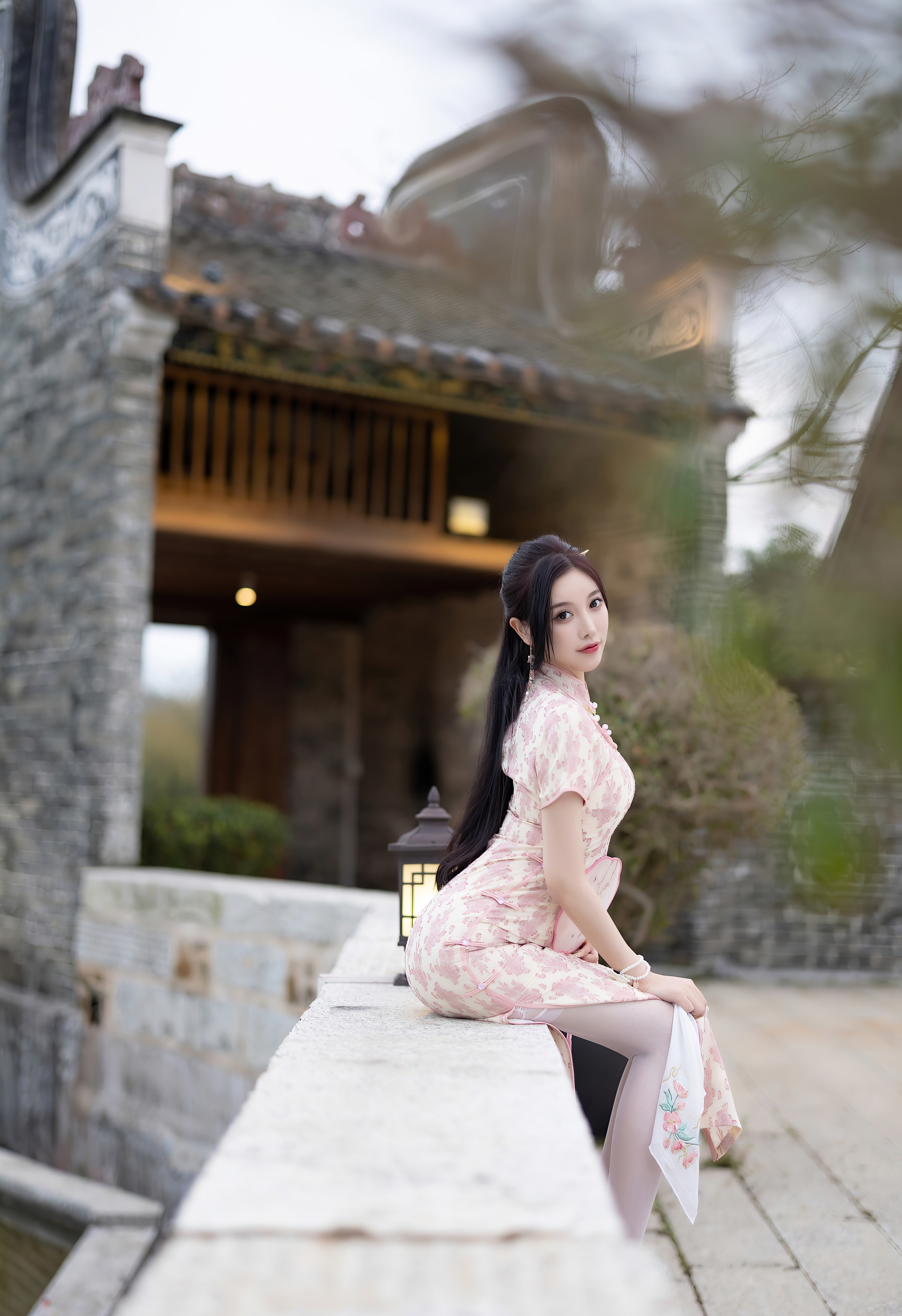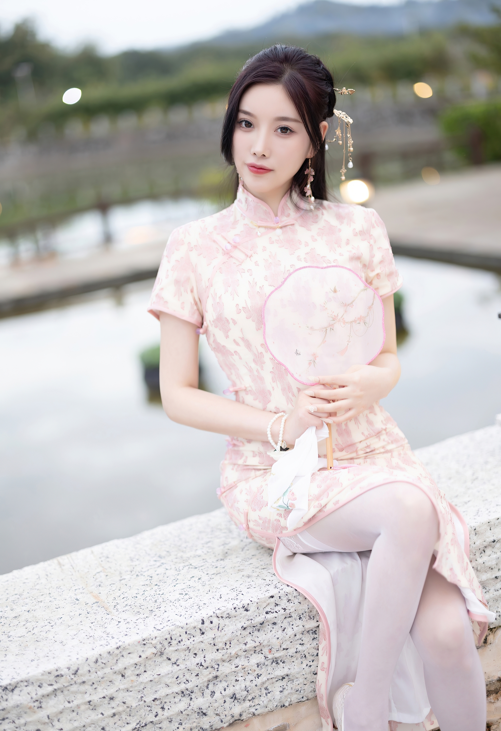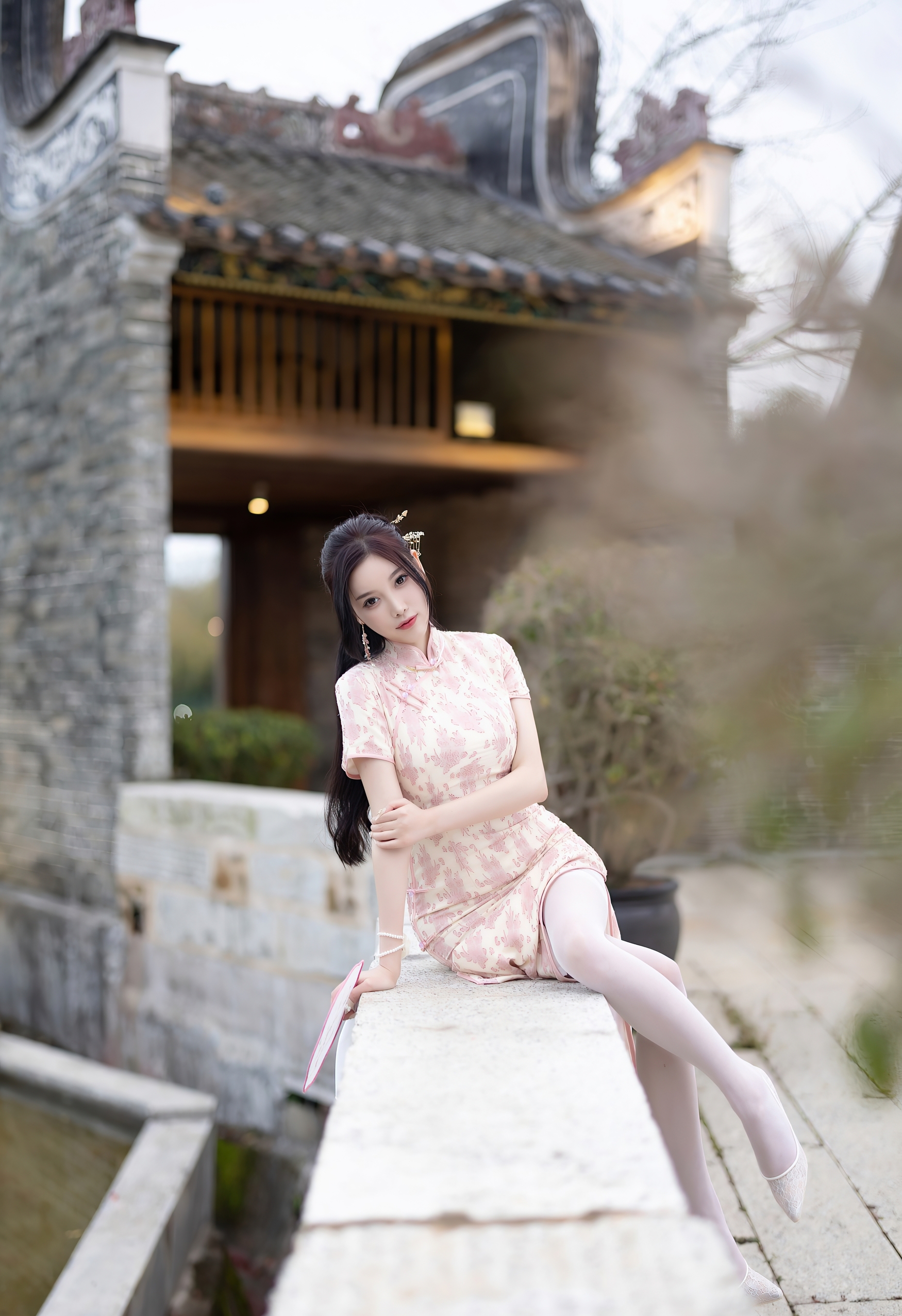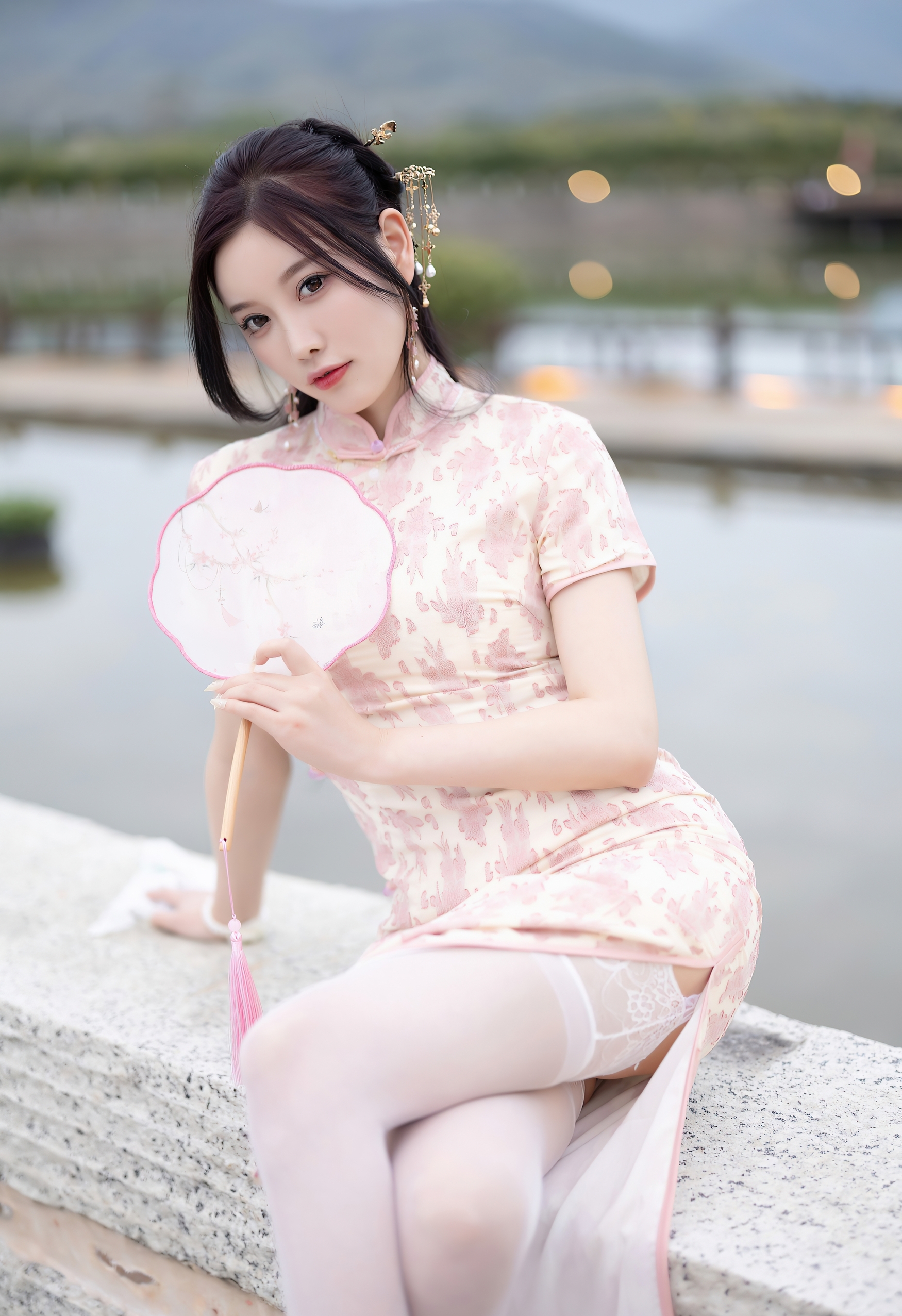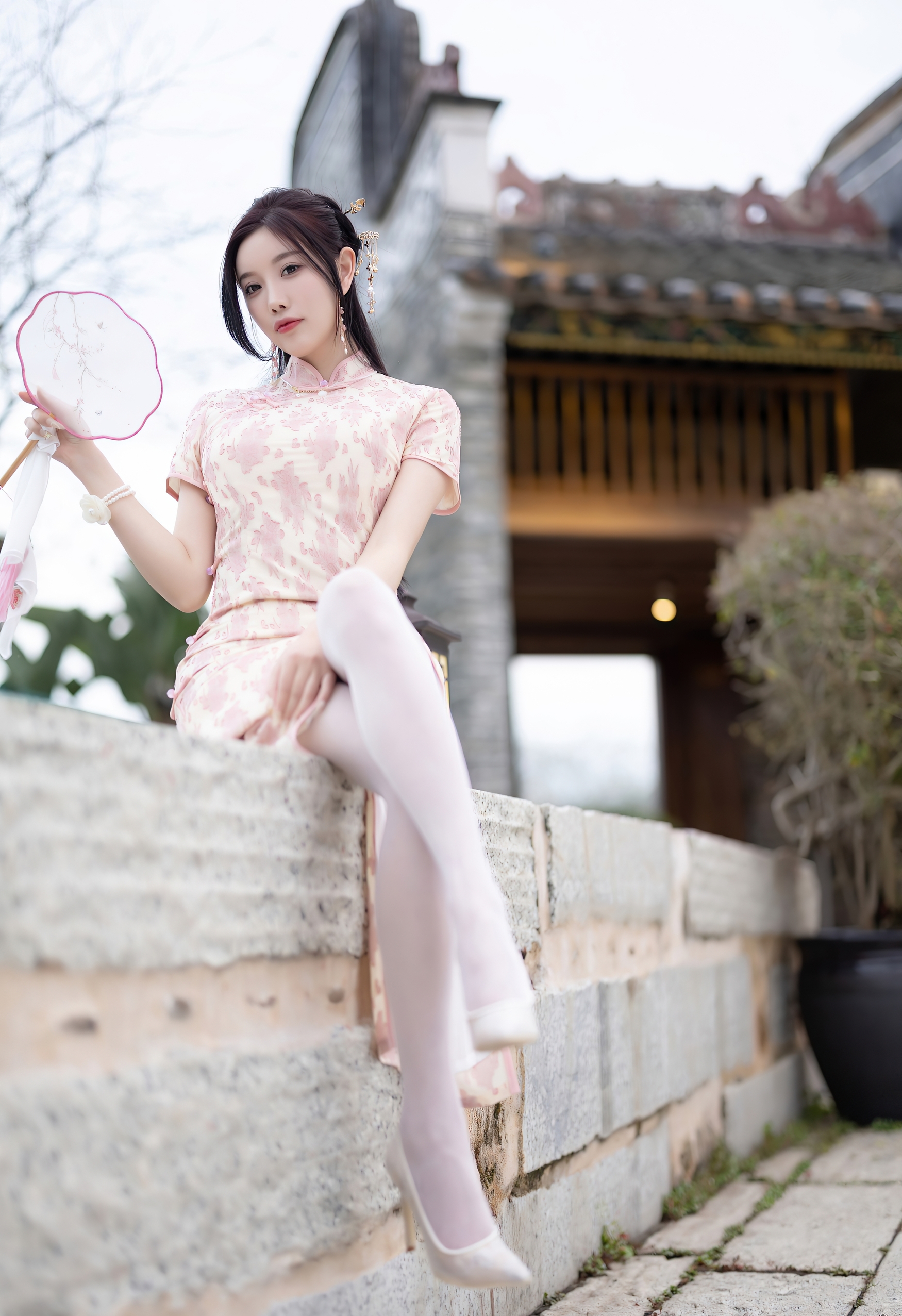 一袭粉白相间的旗袍,如初绽的樱花般娇嫩,细腻的暗纹在丝滑的缎面上若隐若现,勾勒出曼妙的身姿。高开衩的设计,不经意间流露出一丝现代的灵动与自信,与旗袍的古典韵味形成绝妙的平衡。脚上那双缀着蕾丝的浅色高跟鞋,与薄如蝉翼的丝袜相得益彰,将东方的含蓄与西方的精致完美融合。