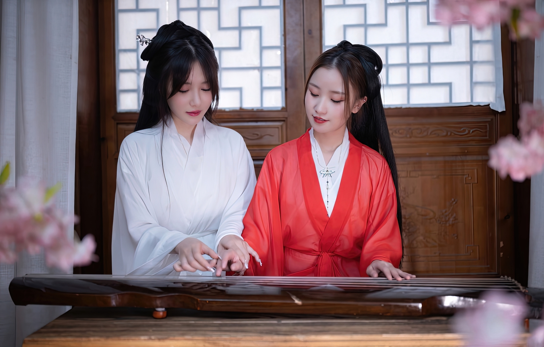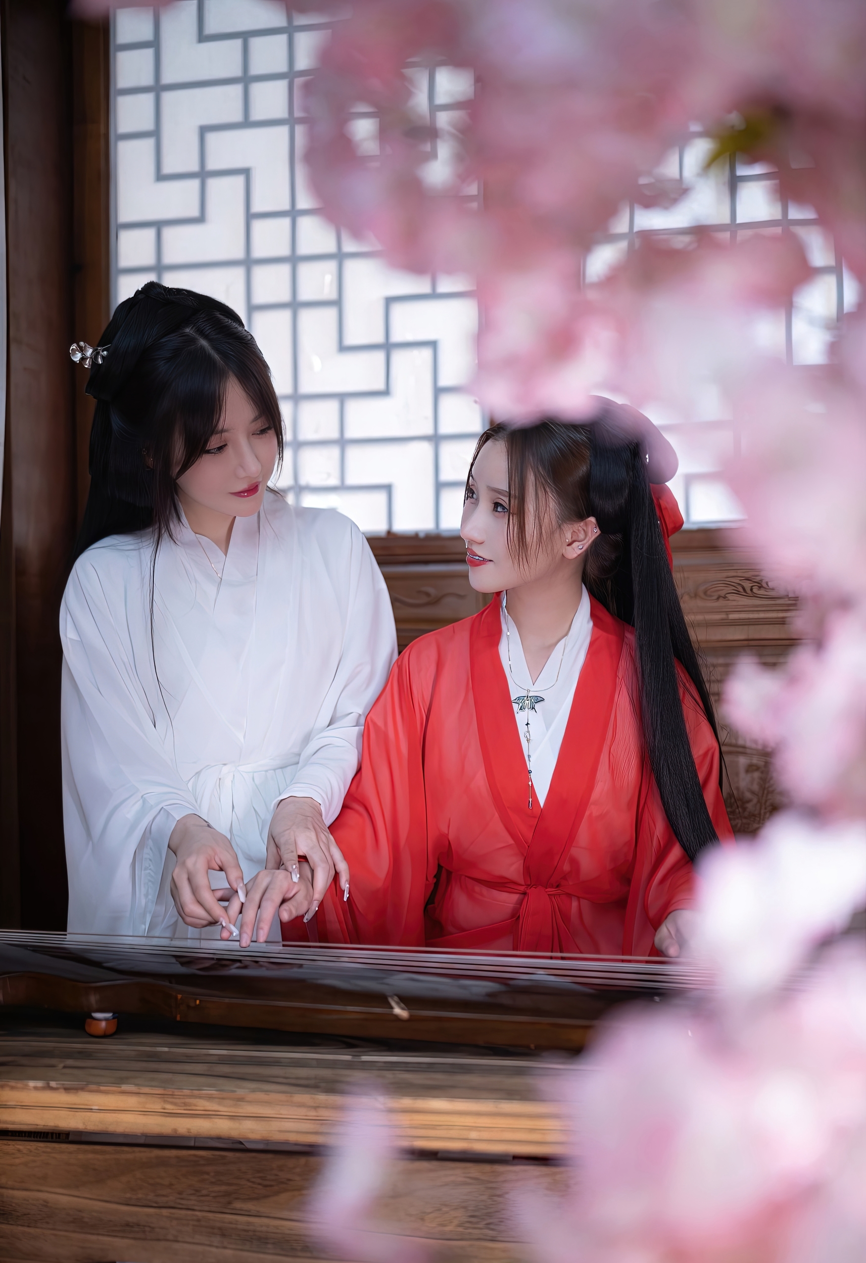 晨光熹微,穿过雕花的木窗,在古朴的琴案上投下细碎的光斑。一袭素白的身影端坐其前,指尖轻触琴弦,似在酝酿一首未名的曲调。另一抹灼灼的朱红悄然立于身侧,如春日里最盛放的一枝牡丹,静静凝望着她。