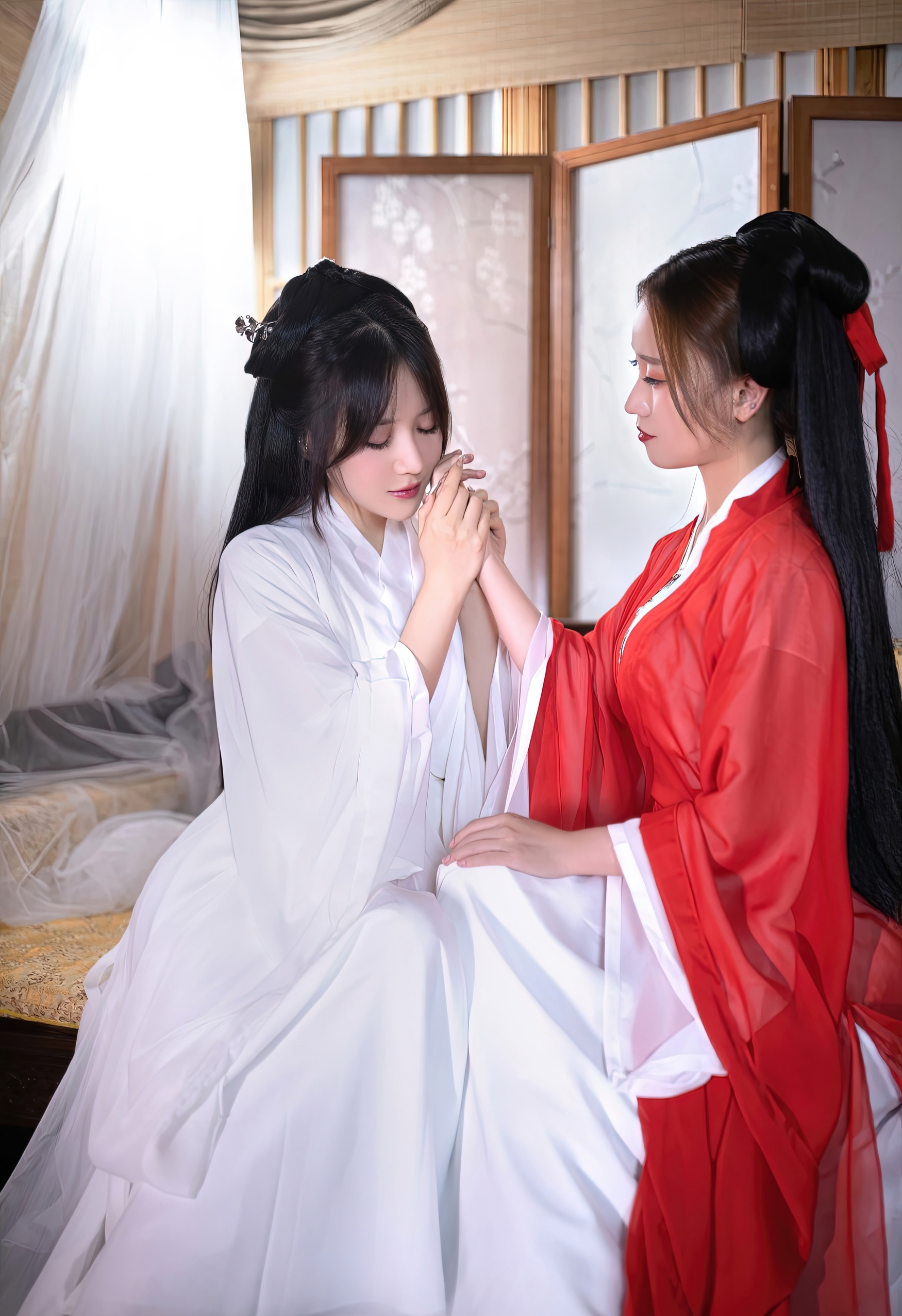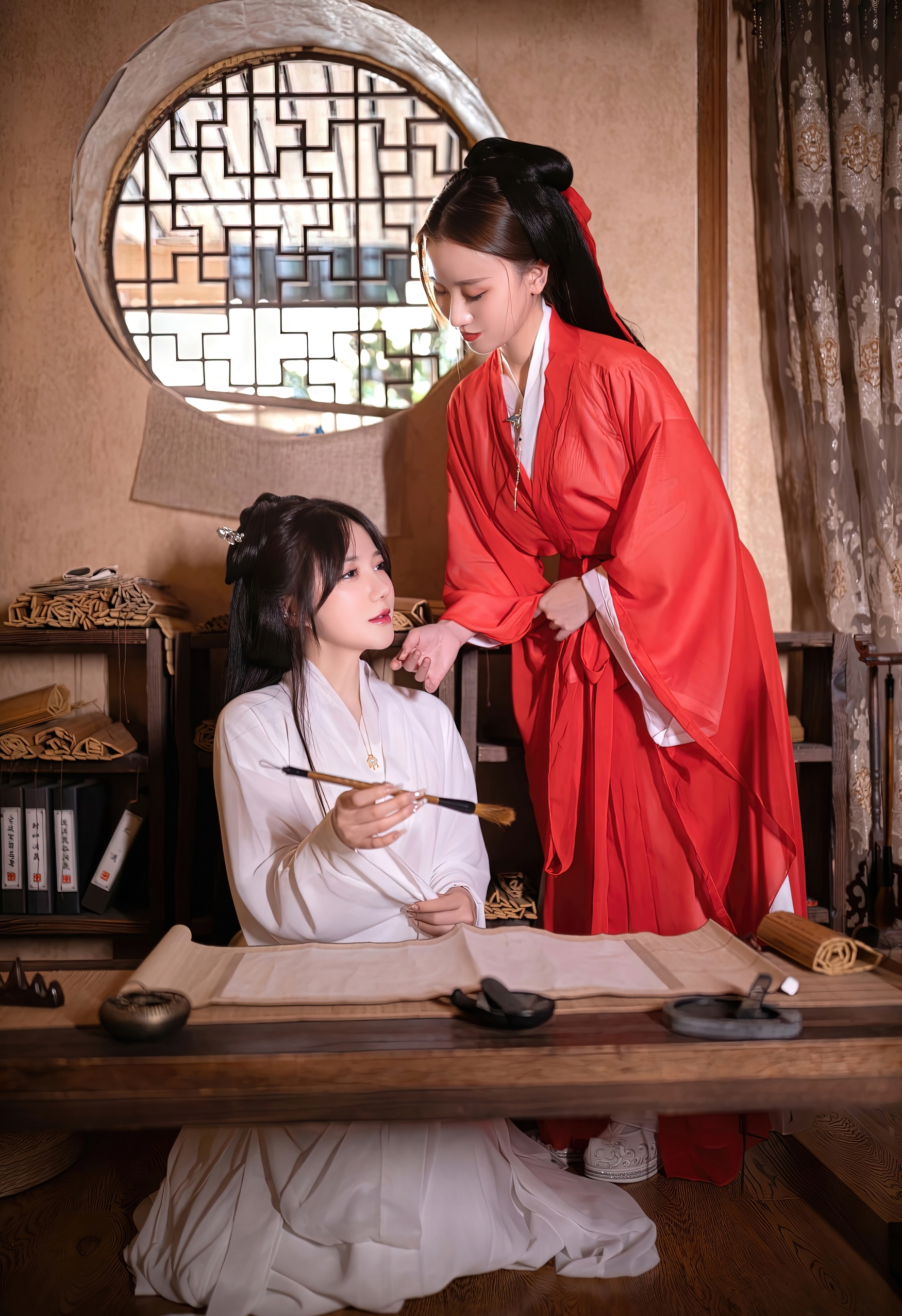 移至书案前,白衣女子提笔欲书,红衣女子便自然地为她研墨。墨块在砚台中缓缓转动,发出细微的沙沙声,那是时光沉淀的声音。她看着对方认真的侧脸,目光温柔,仿佛在看自己生命中最珍视的风景。无需言语,一个眼神,一次指尖的轻触,便足以让彼此的心意熨帖如初。