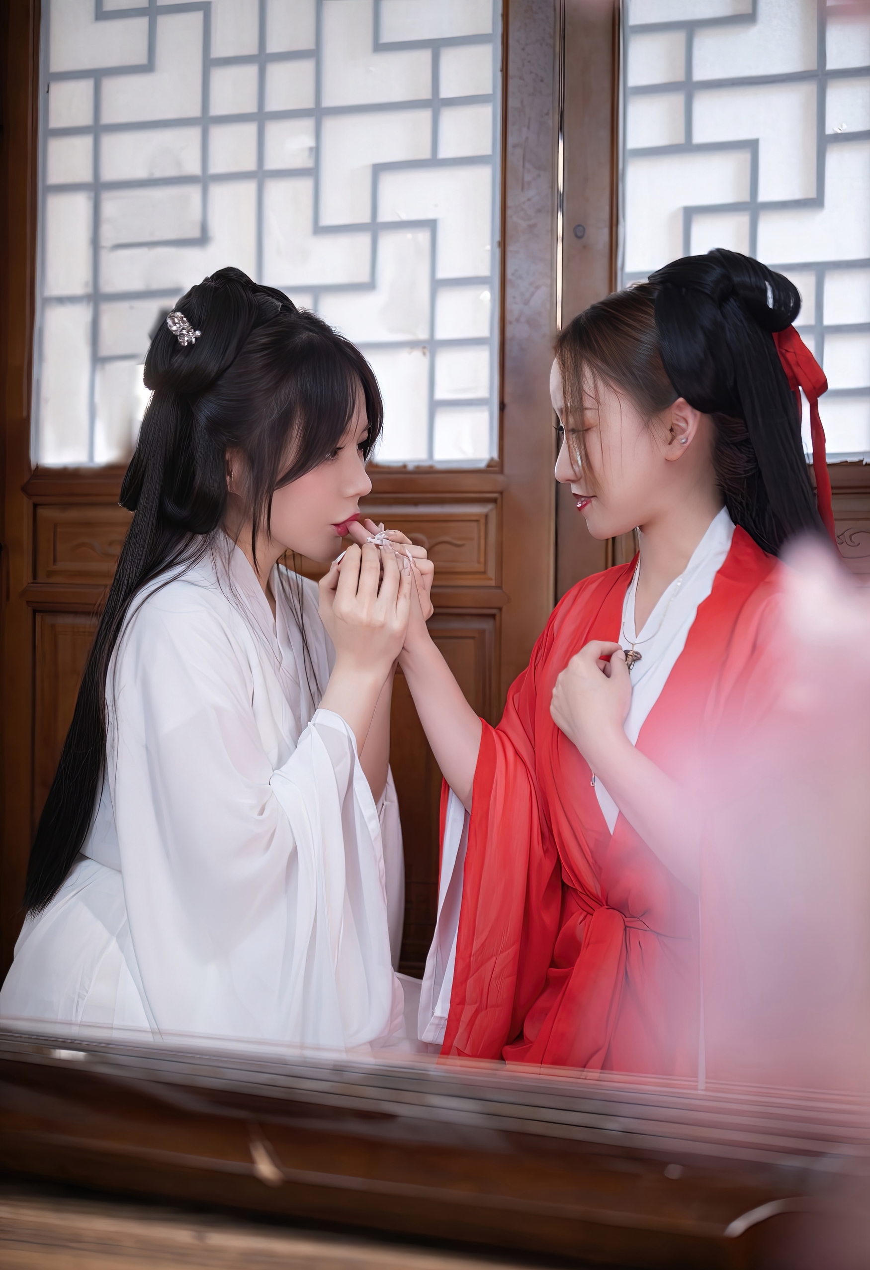 指尖落下,清越的琴音便如山涧溪流,潺潺而出。白衣女子专注地拨动琴弦,而红衣女子则在一旁,时而轻声哼唱和着旋律,时而为她拂去额前散落的一缕青丝。那红衣的飘逸,与白衣的素净,在琴声中交织、缠绕,如同一幅流动的画卷,无声地诉说着比金兰更甚的情谊。
