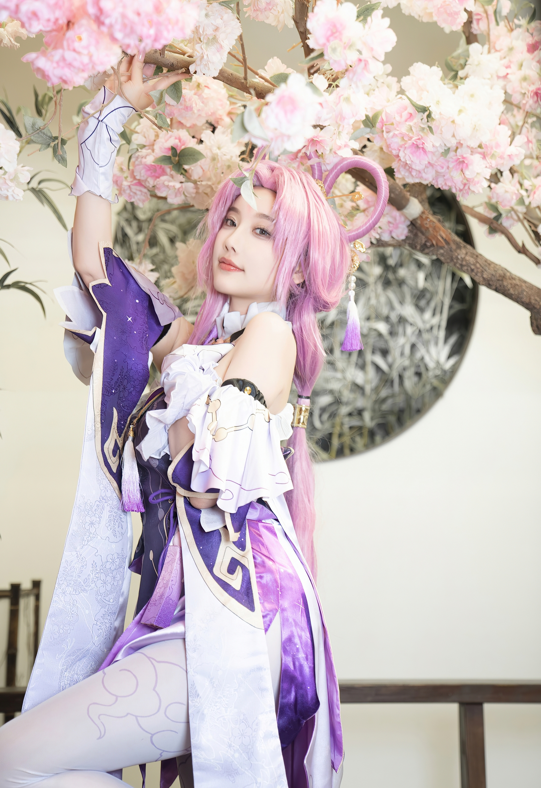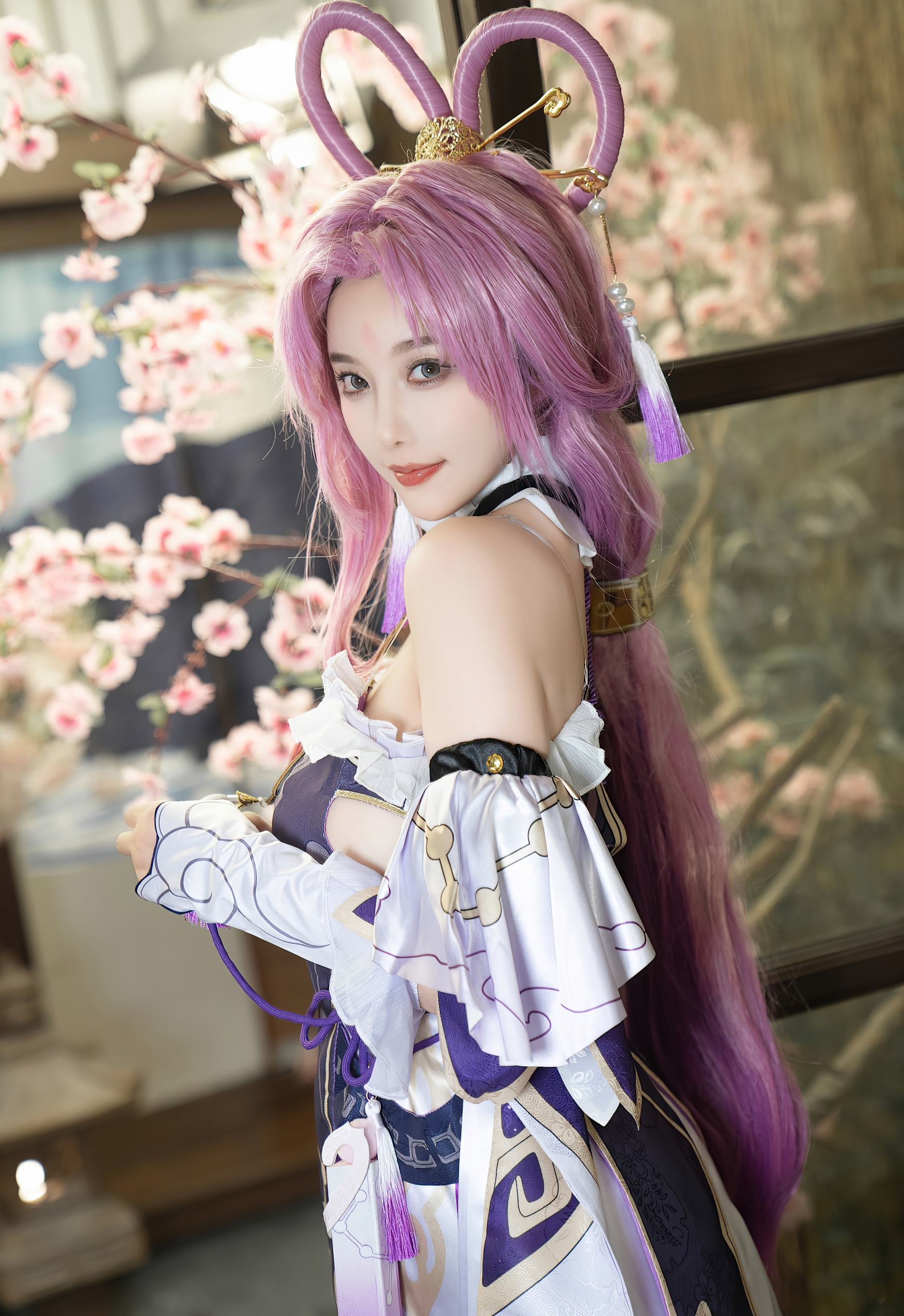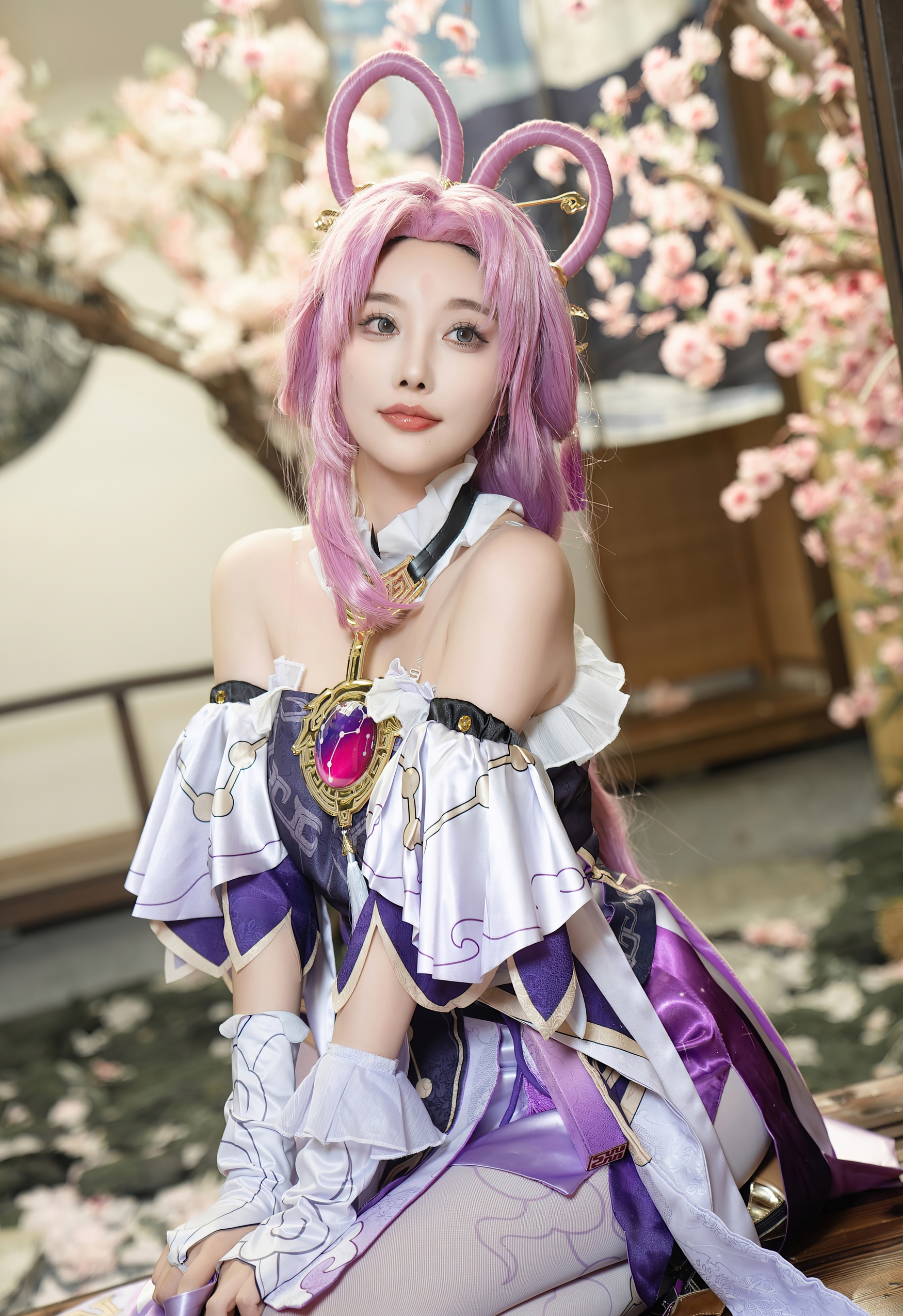 春风拂过庭院,樱花如雪般轻舞,落于青石小径,也悄然栖在她的肩头。她身着一袭紫白交织的华服,衣袂飘然,仿佛从古卷中走出的仙子。那抹淡粉的长发如云烟缭绕,头顶一对玲珑兔耳,缀以金饰与流苏,随风微颤,似诉说着一段不为人知的传说。