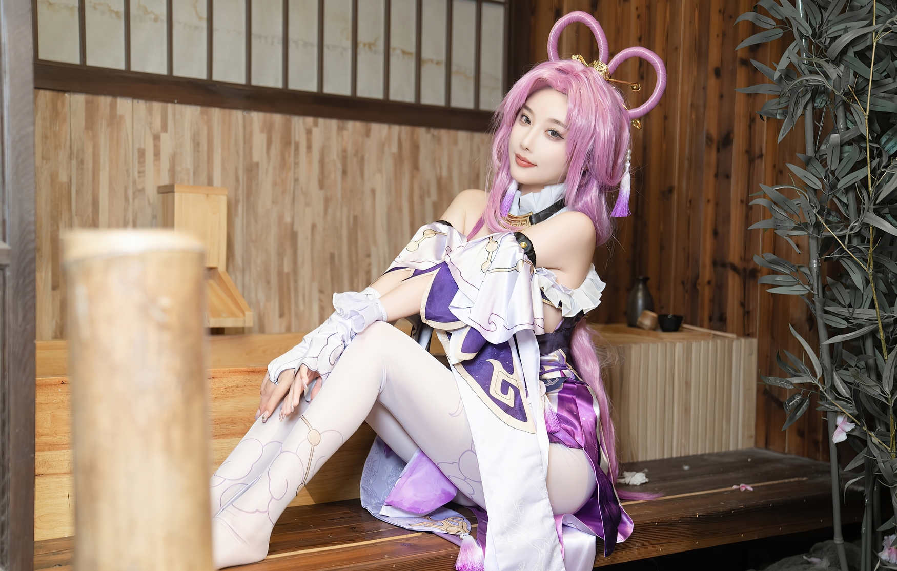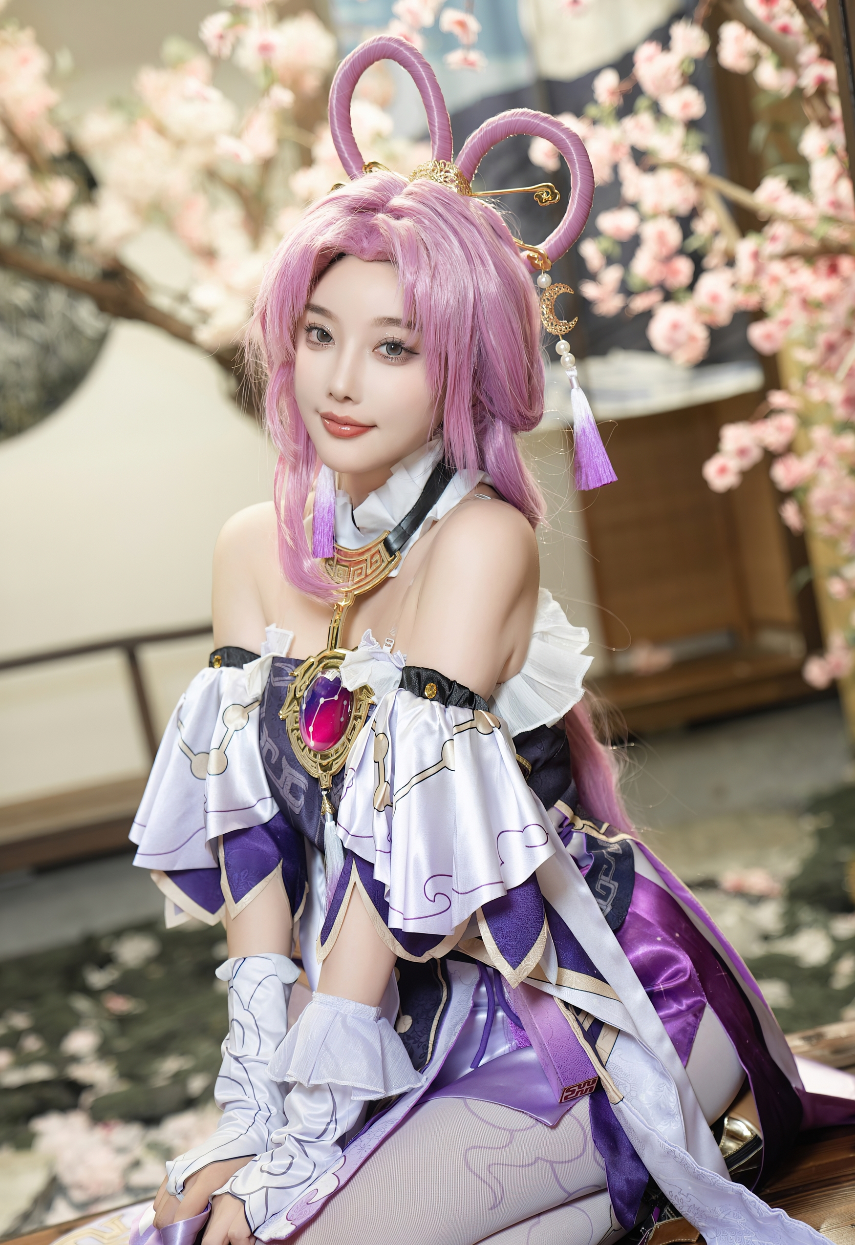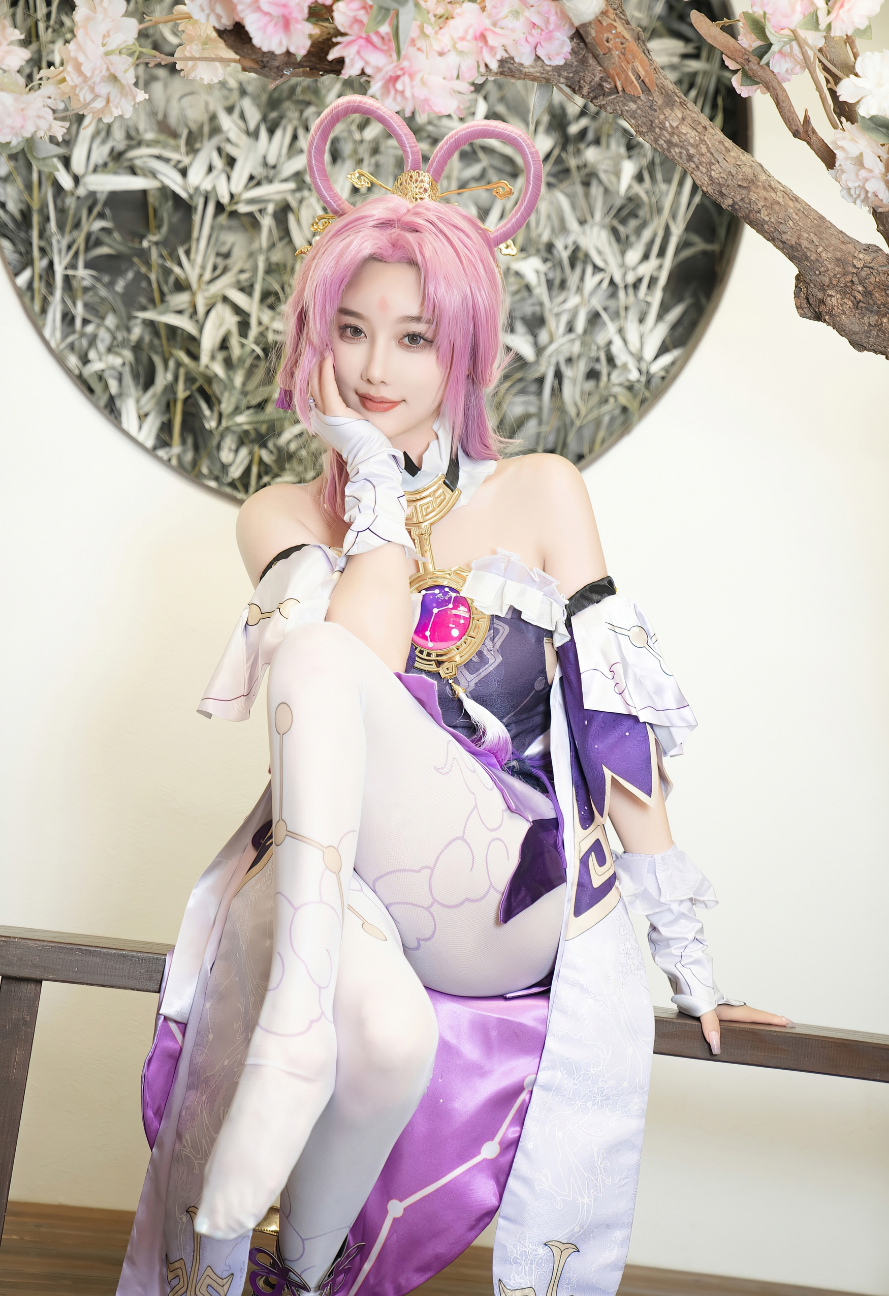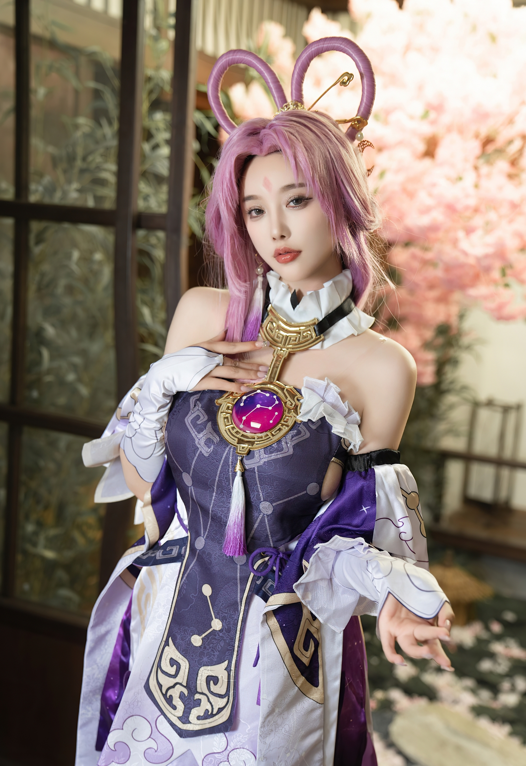春风拂过庭院,樱花如雪般轻舞,落于青石小径,也悄然栖在她的肩头。她身着一袭紫白交织的华服,衣袂飘然,仿佛从古卷中走出的仙子。那抹淡粉的长发如云烟缭绕,头顶一对玲珑兔耳,缀以金饰与流苏,随风微颤,似诉说着一段不为人知的传说。