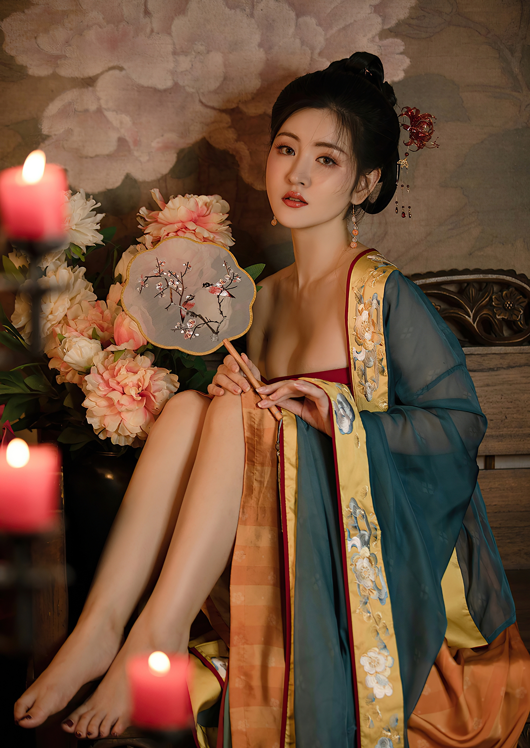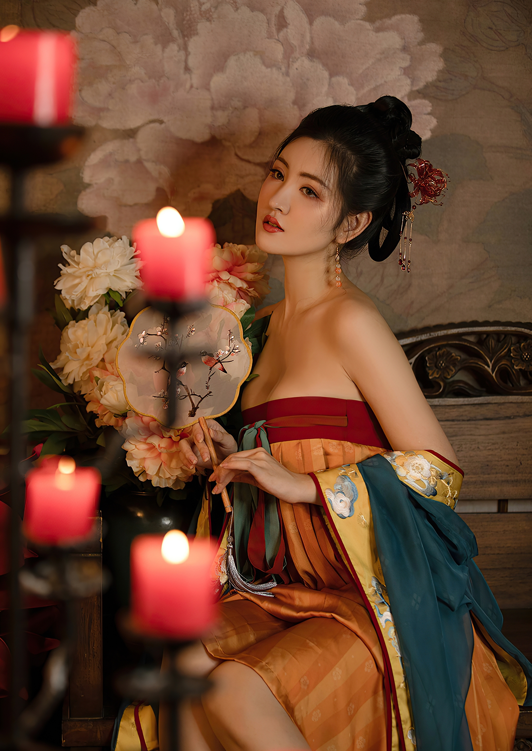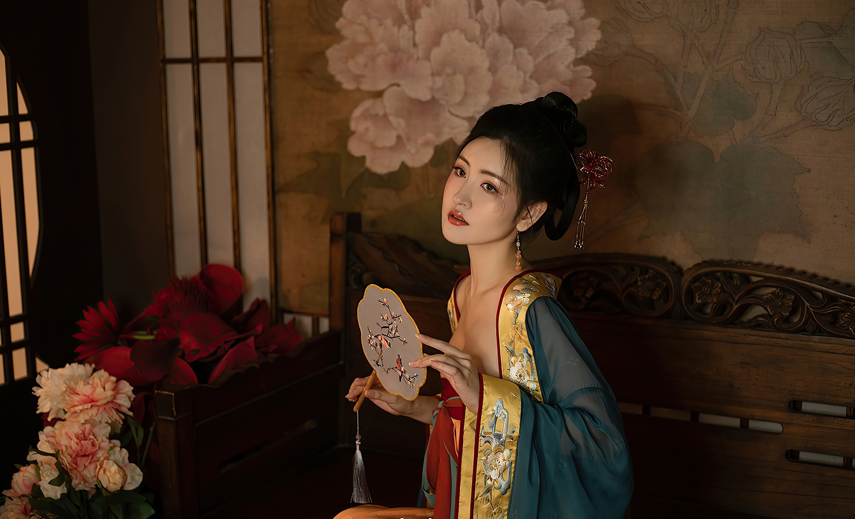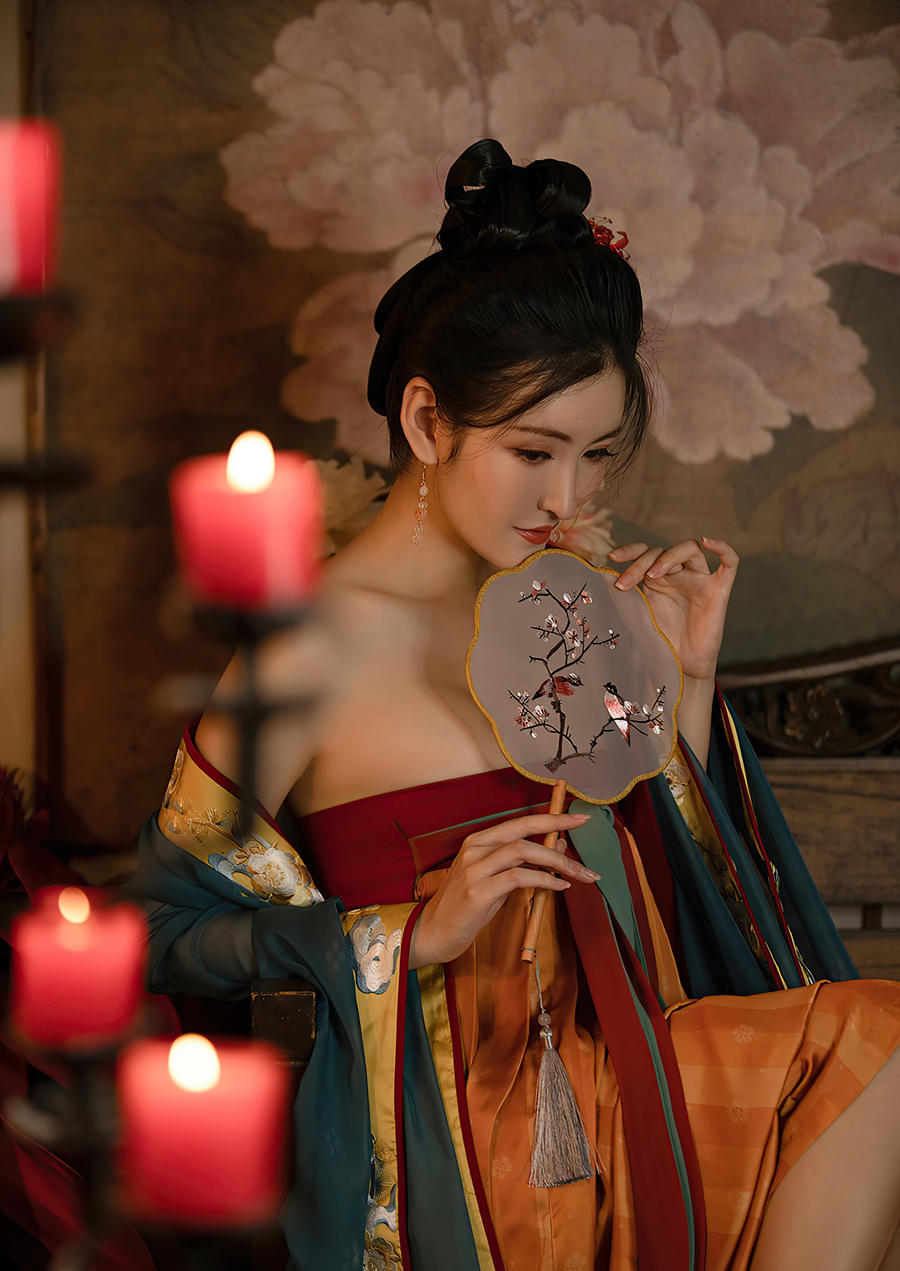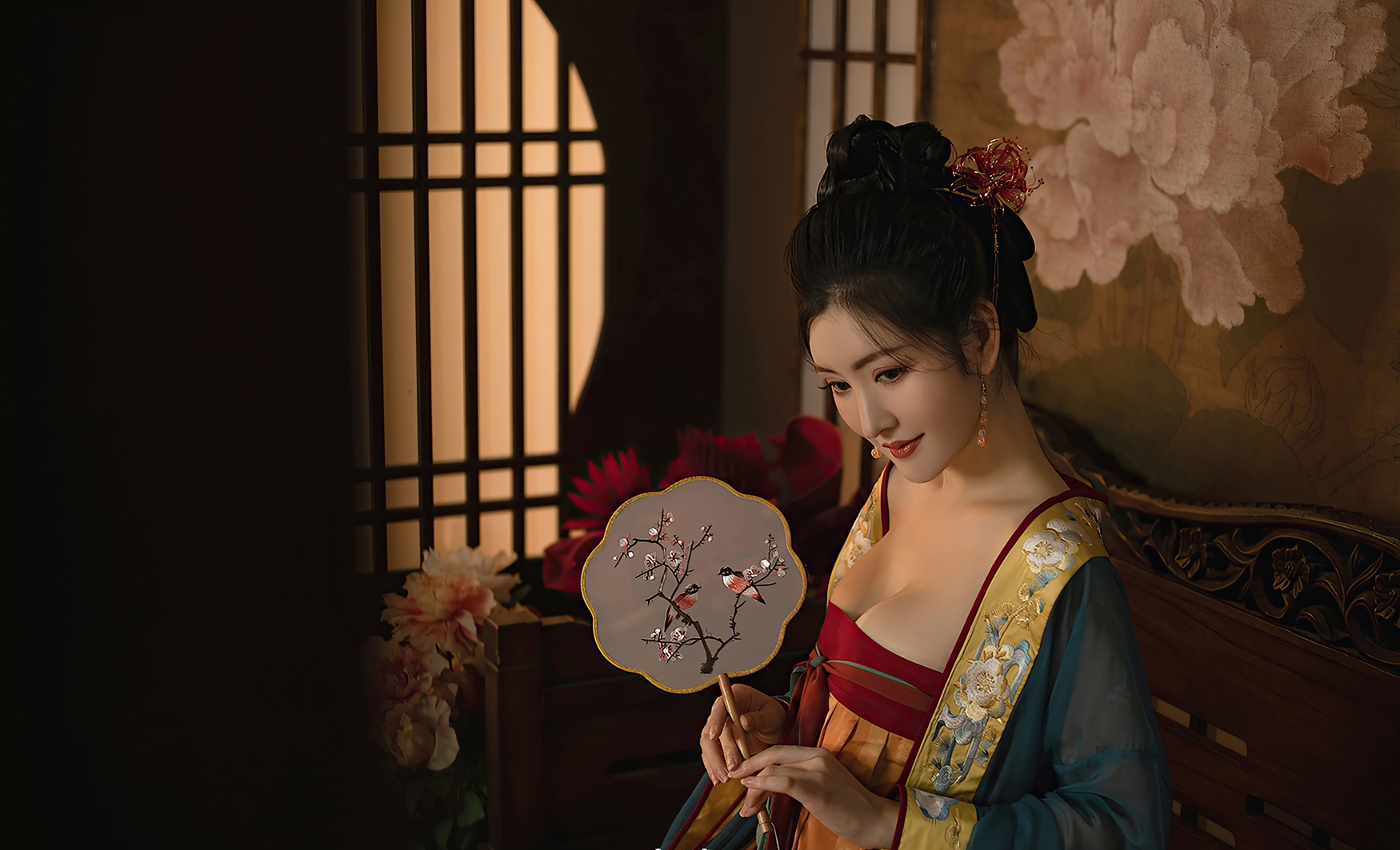 她端坐于古木雕椅之上,手中轻握一把团扇,扇面绘着梅枝双鹊,淡雅如诗,似有春意悄然潜入寒夜。指尖轻抚扇骨,那抹朱唇微启,仿佛要诉说一段未曾出口的旧事。耳坠珠玉轻晃,随着呼吸微微颤动,如同心跳在寂静中低语。
