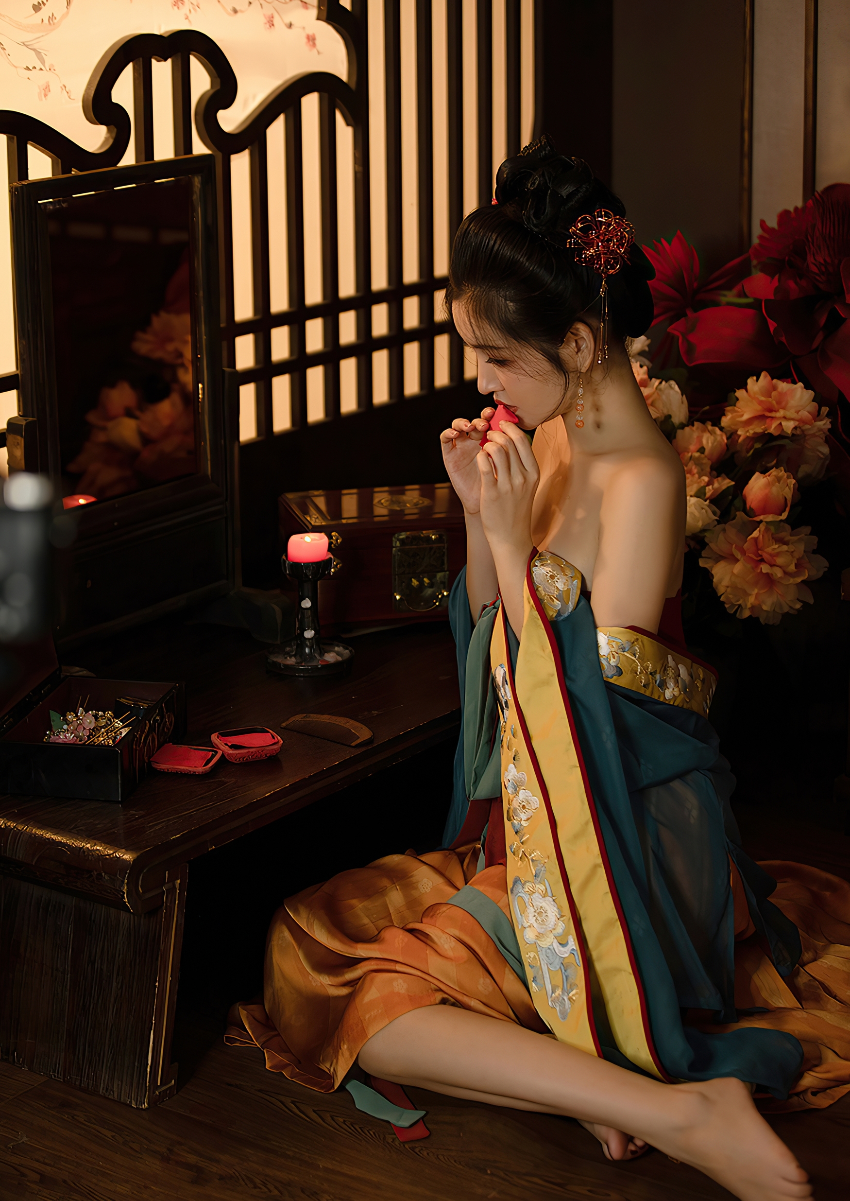 妆台前,她正以胭脂轻点唇色,镜中倒影如梦似幻。案上铜镜映出她的容颜,眉目如画,眼波流转,似有万千思绪藏于瞳孔深处。一束牡丹置于身旁,花瓣层层叠叠,宛如她内心那般丰盈而静美。