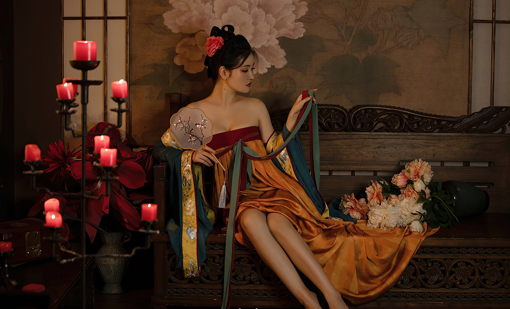 夜阑人静,烛火微明,一缕暖光自雕花窗棂间斜洒而入,轻轻拂过她垂落的鬓角。她身着一袭华美的唐风汉服,衣料如云霞般流动,金线绣出的祥云与牡丹在暗影中悄然绽放,仿佛将千年的繁华织进了这一瞬的温柔里。