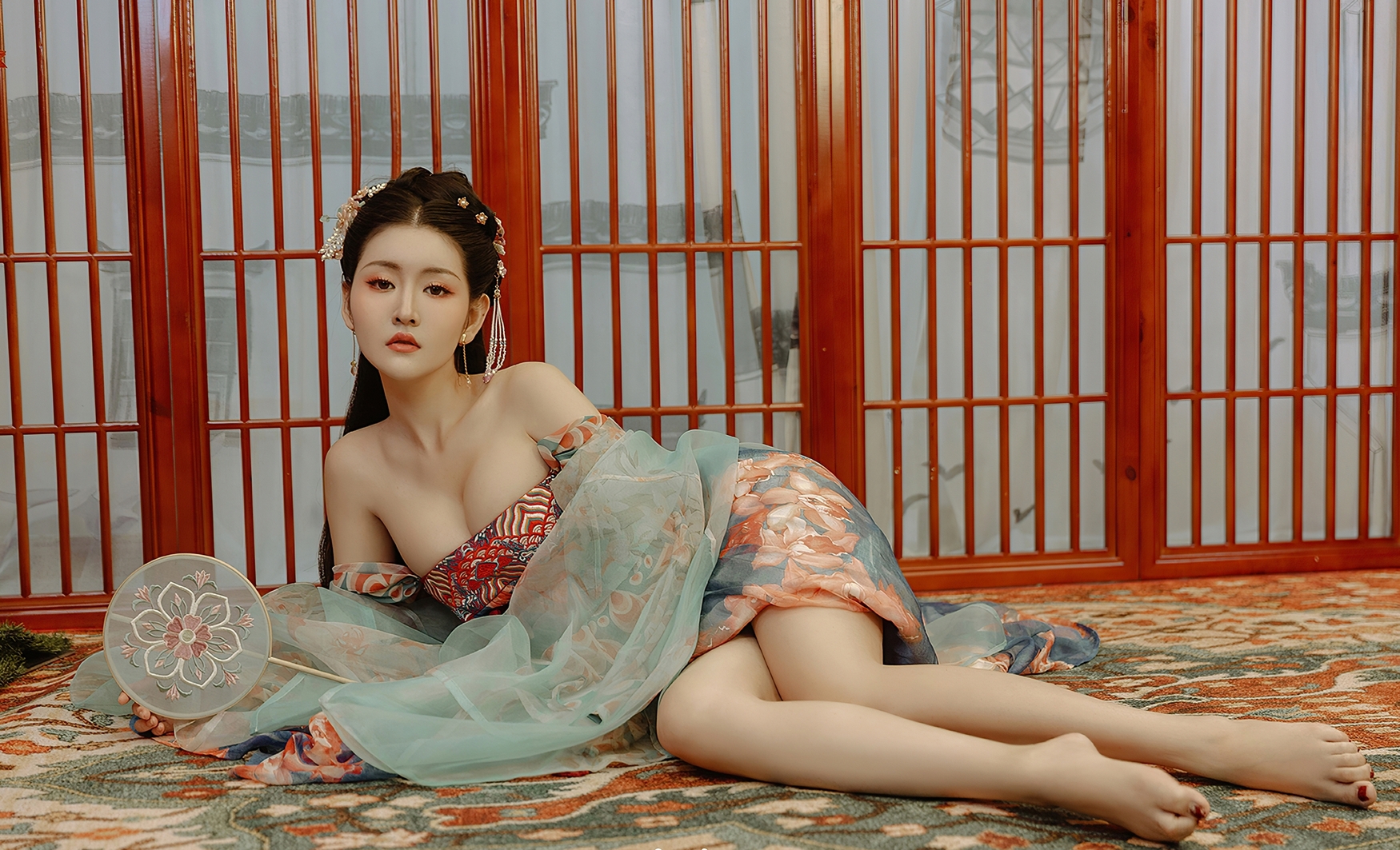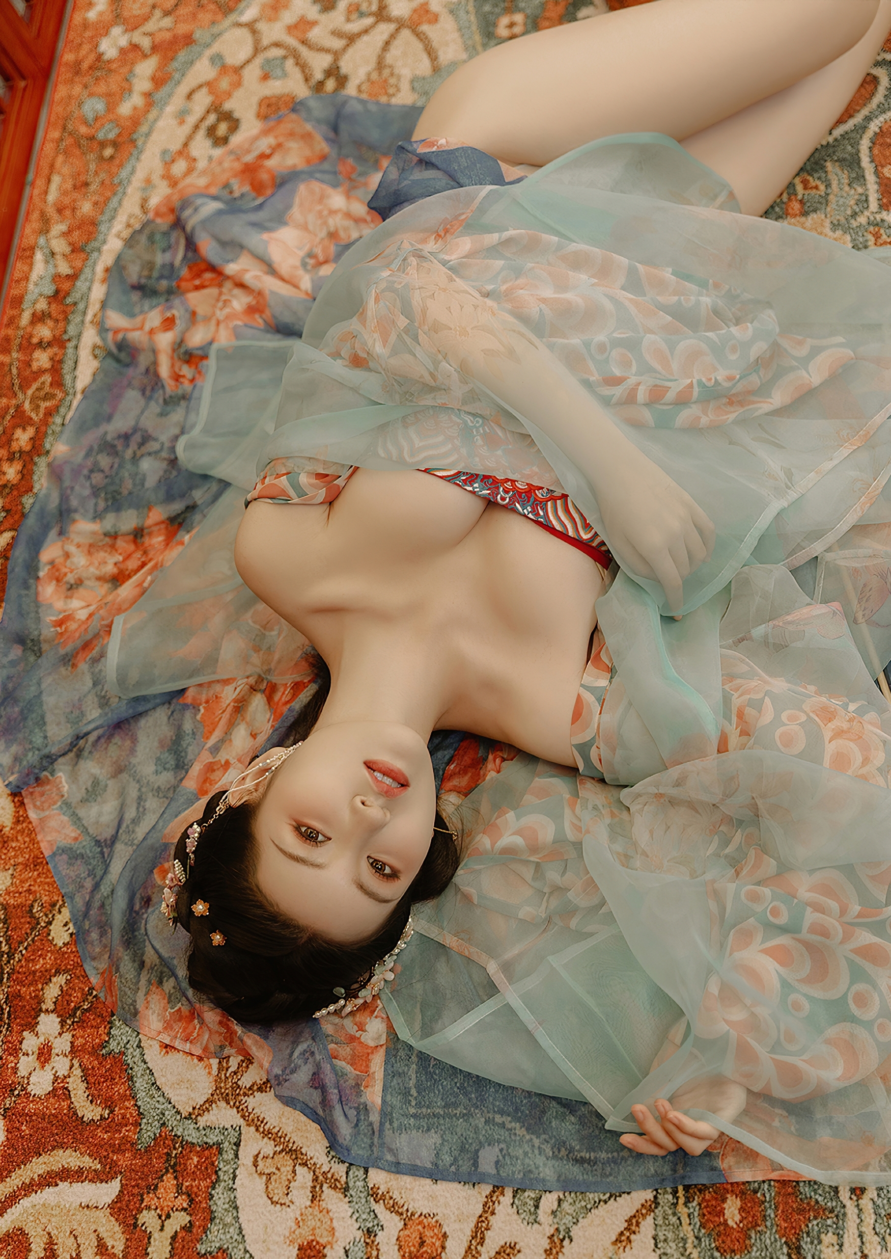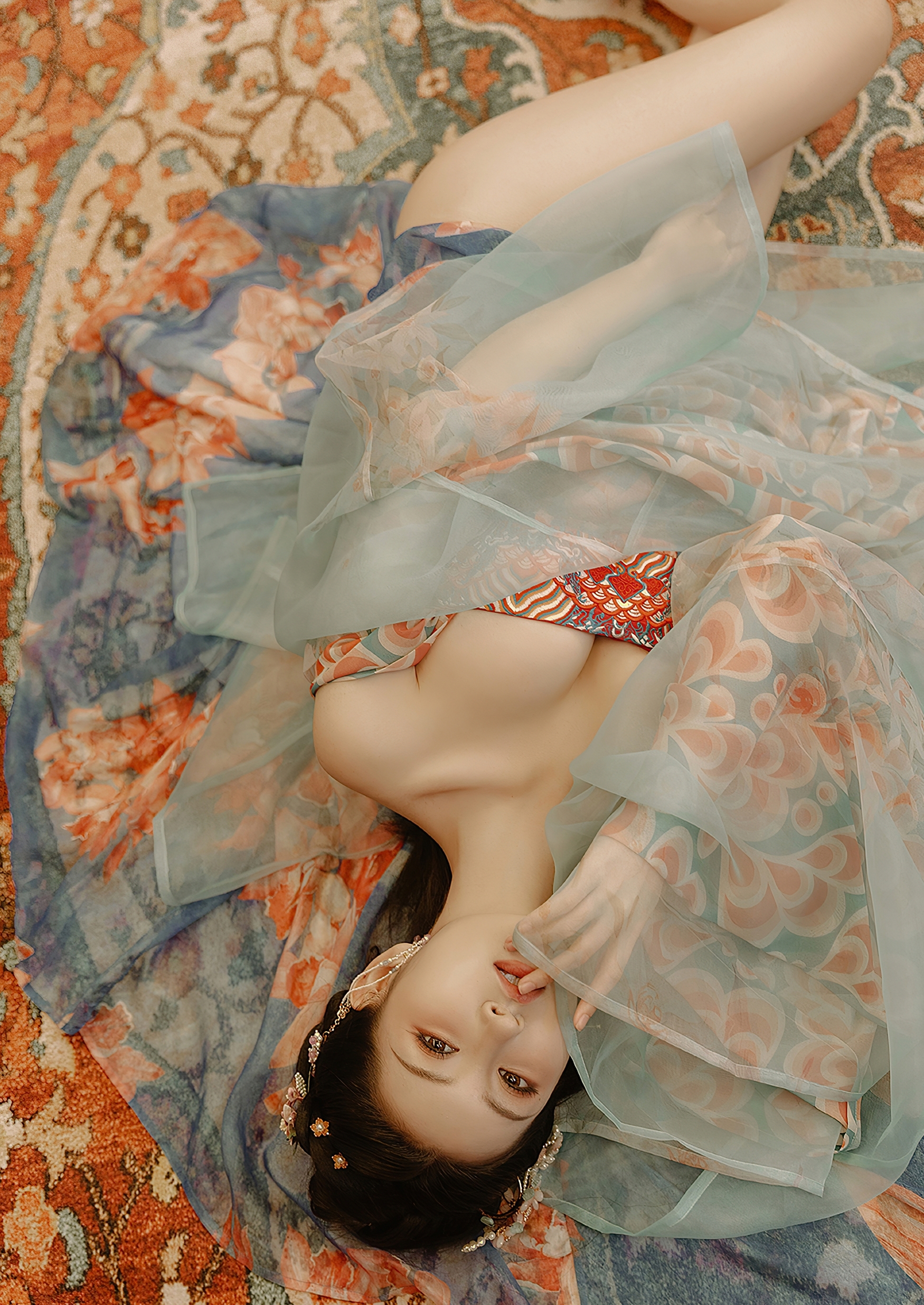 她亦曾躺卧于斑斓地毯之上,素手轻抚衣襟,双眸望向远方,仿佛在追忆一段未竟的往事。那眼神里,有思念,有孤寂,更有对美的执着守望。她的姿态,慵懒却不失端庄,娇媚而不失风骨,宛如一幅流动的工笔画,一笔一划皆是情深。