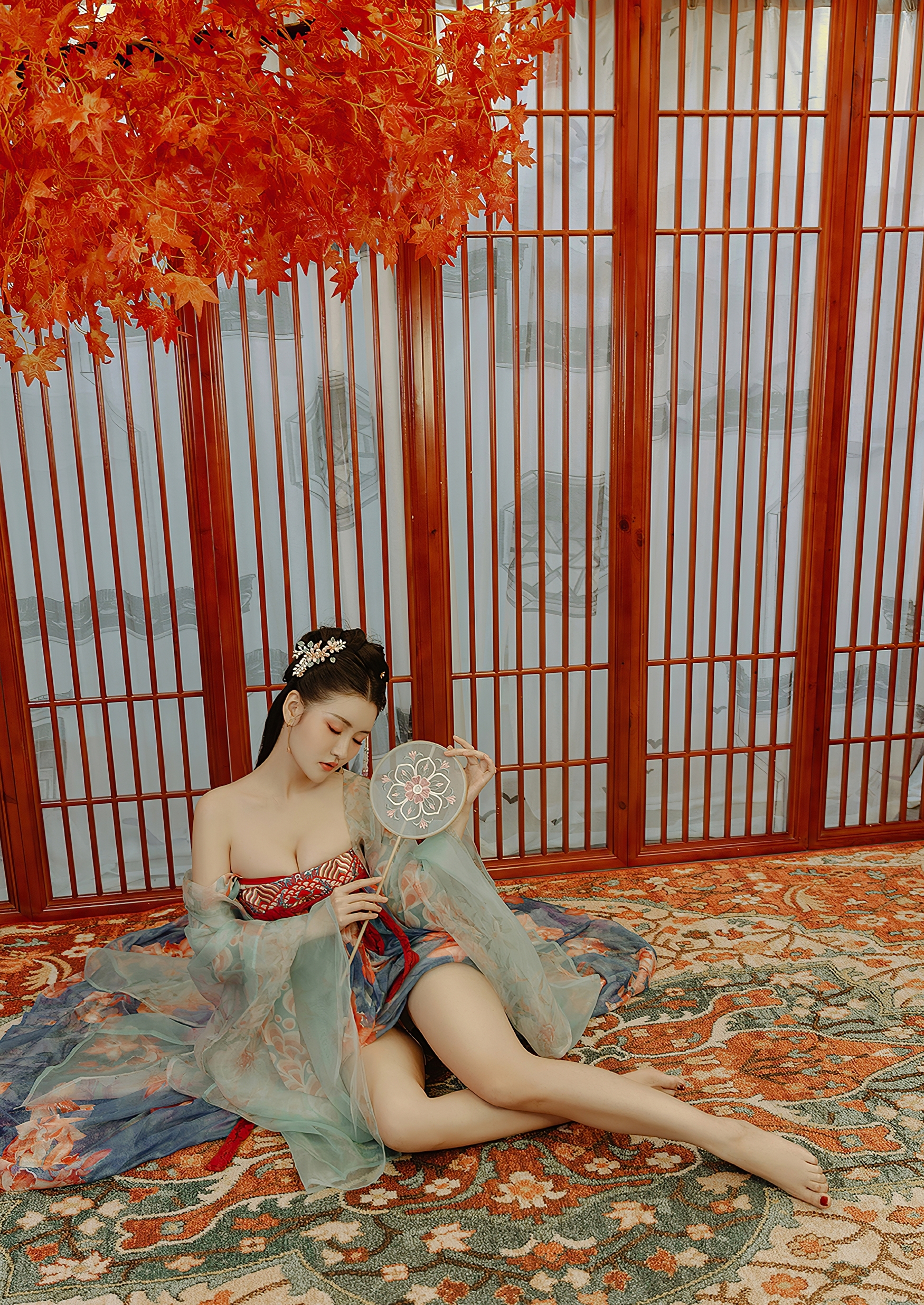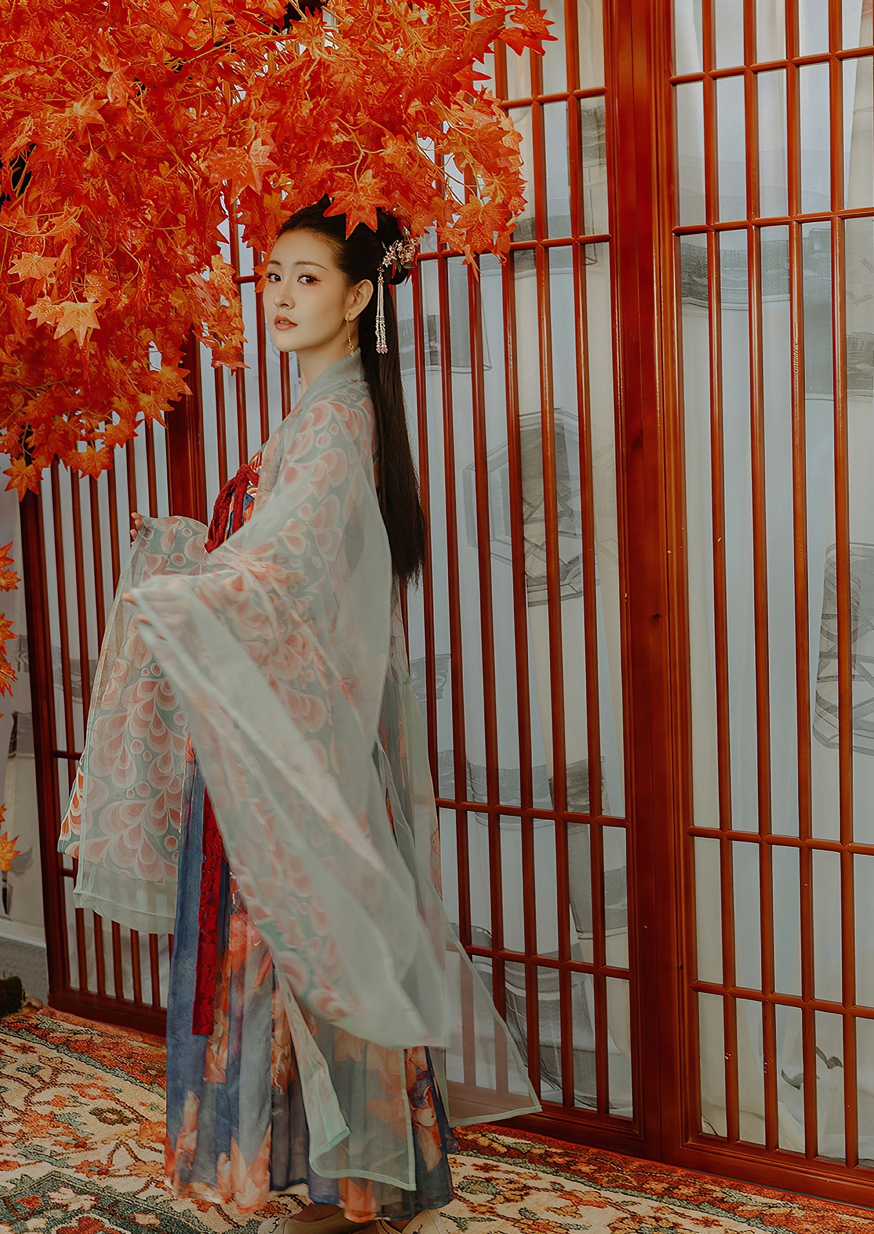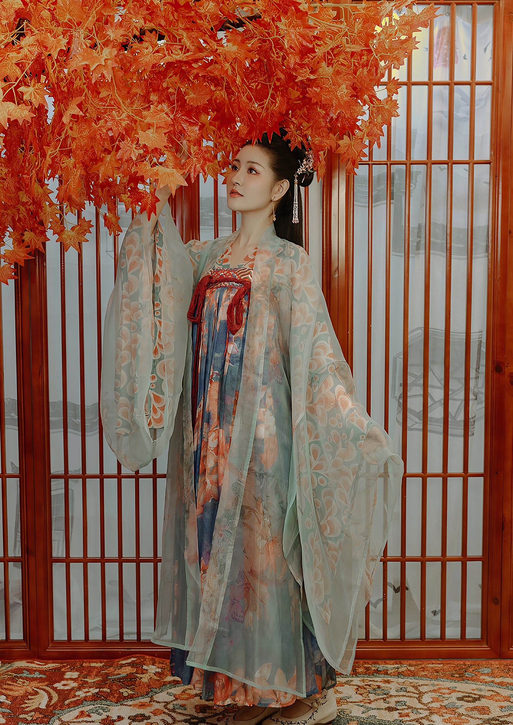 秋意渐浓,红枫如火,悄然垂落于雕花木窗前。一位女子立于其间,身披唐风华裳,青碧薄纱轻覆,若云霞缭绕,又似烟雨氤氲。衣上金线绣纹蜿蜒流转,牡丹与卷草交织成诗,每一寸布料都诉说着千年东方的雅致与深情。