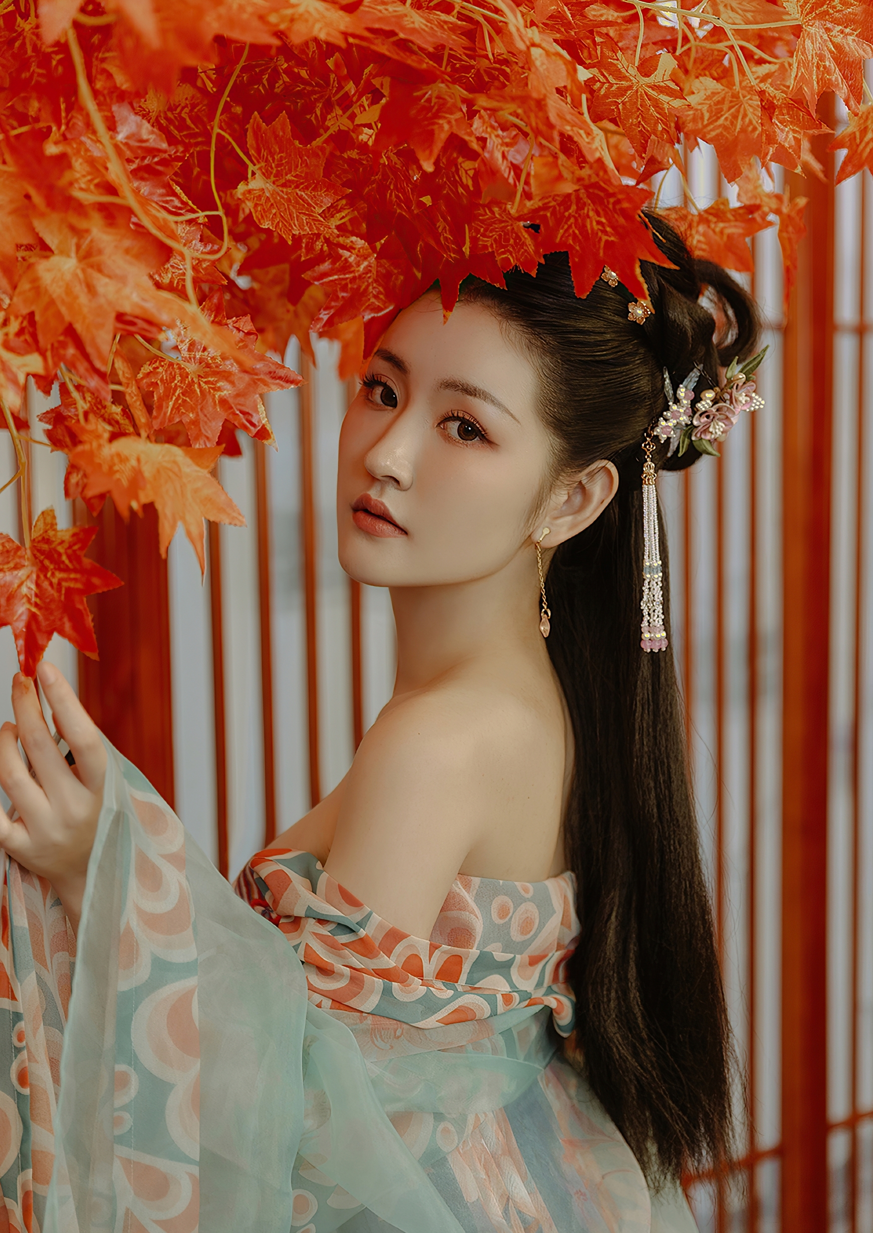 当她立于红枫之下,伸手轻触一片落叶,风起时,衣袂翻飞,如蝶舞翩跹。那一瞬间,天地仿佛只剩下她一人,与秋色共舞,与时光对话。她是秋的化身,是美的具象,是古典灵魂的延续。