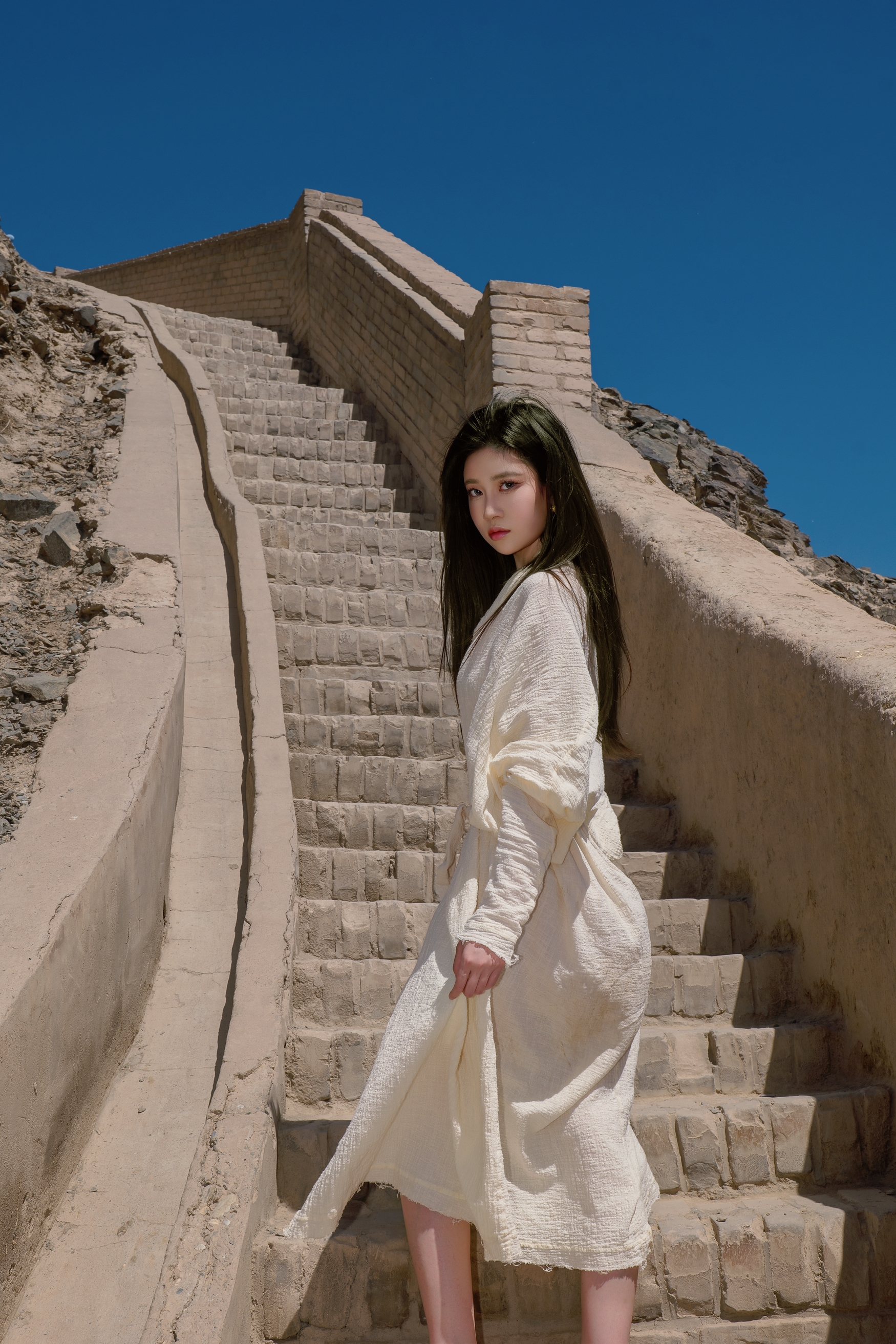 她的身影,在浩瀚的背景下显得如此渺小,却又如此坚定。她不是征服者,也不是游客,她是那个愿意停下脚步、倾听历史的人。她穿着最简单的白裙,却比任何华服都更接近“美”的本质——那份不张扬、不争抢,却自有一种穿透岁月的力量。