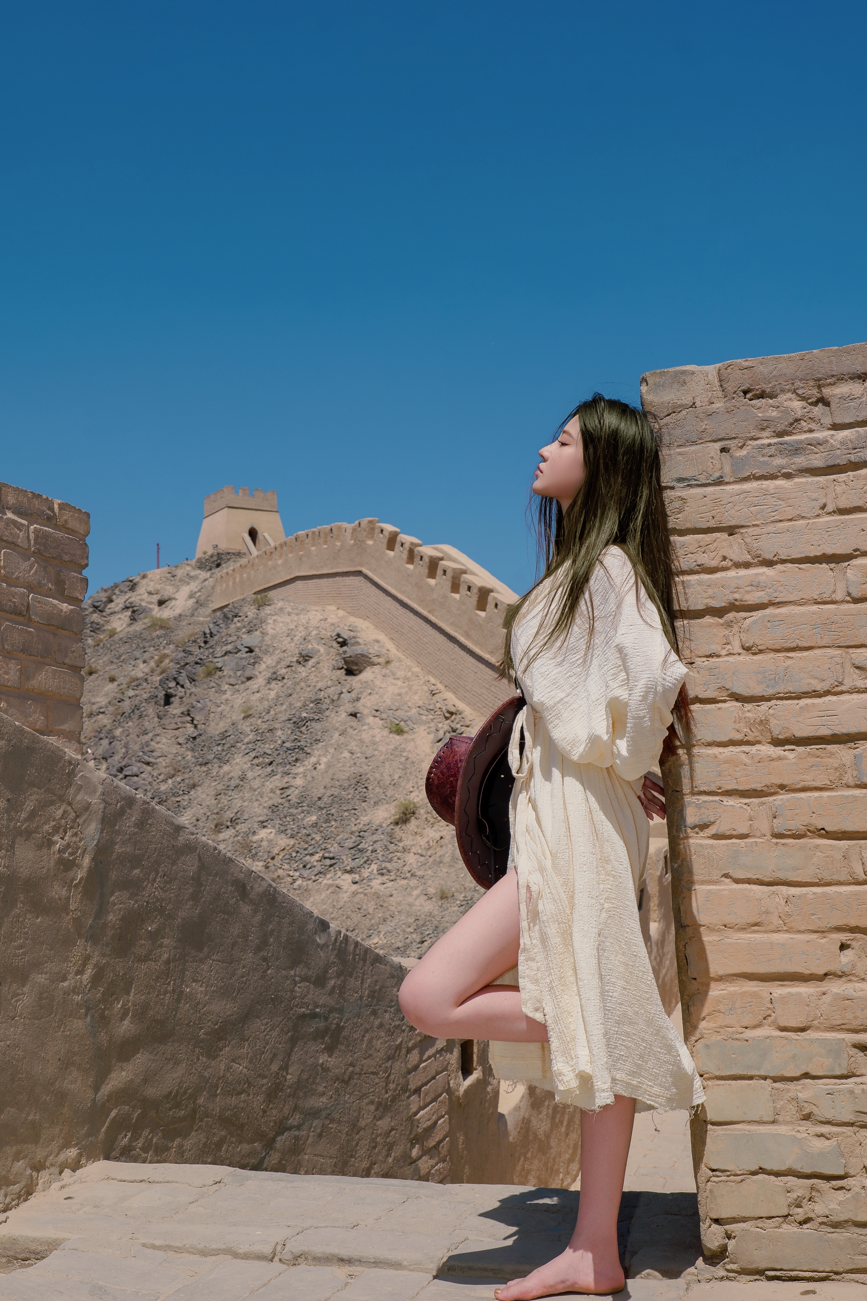 在西北的尽头,有一段沉默的长城,它不似八达岭那般喧嚣,却以最原始的姿态横卧于荒原之上,仿佛一条沉睡千年的巨龙,静静守望着天边的云卷云舒。而她,一袭素白长裙,赤足行走在古老的砖阶上,像一道流动的光,悄然融入这苍茫天地之间。