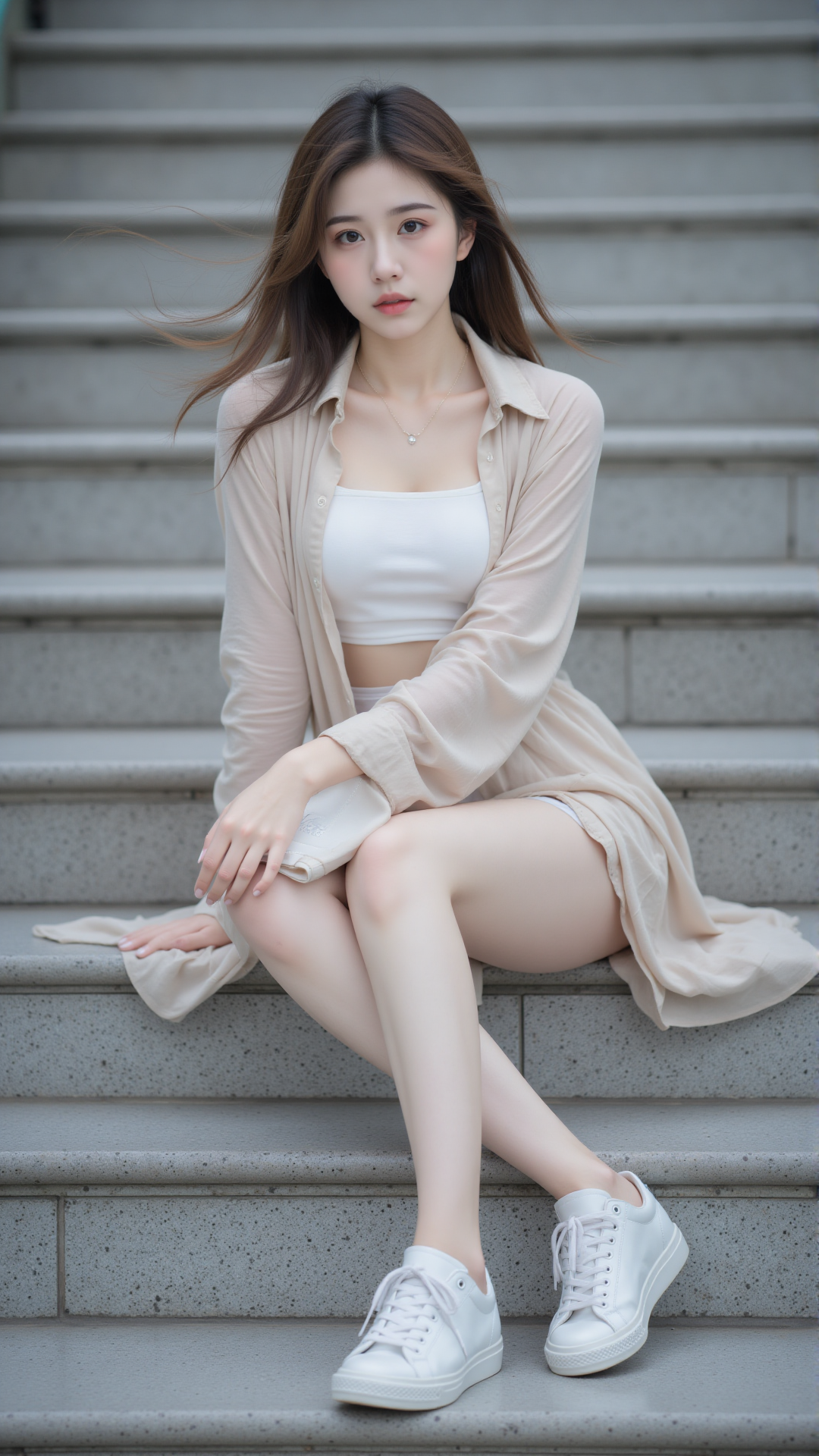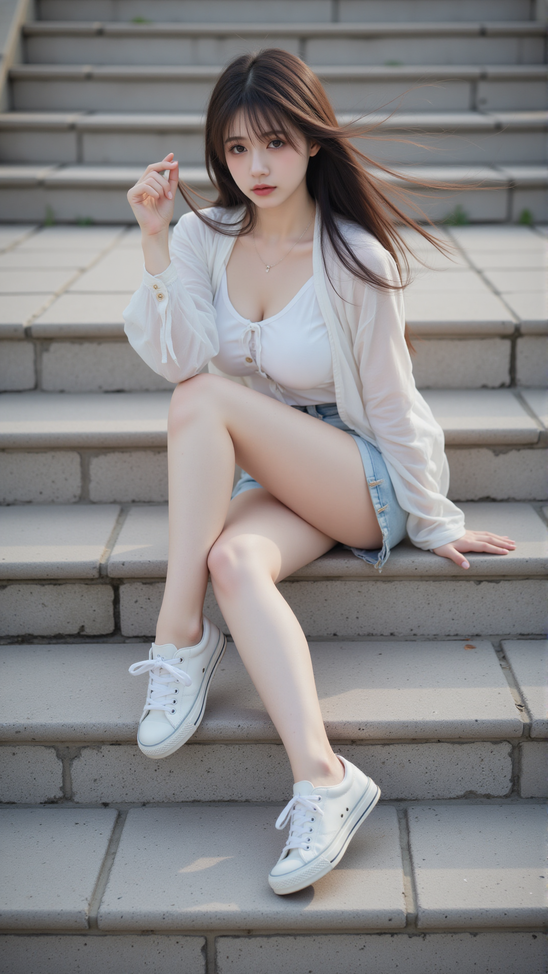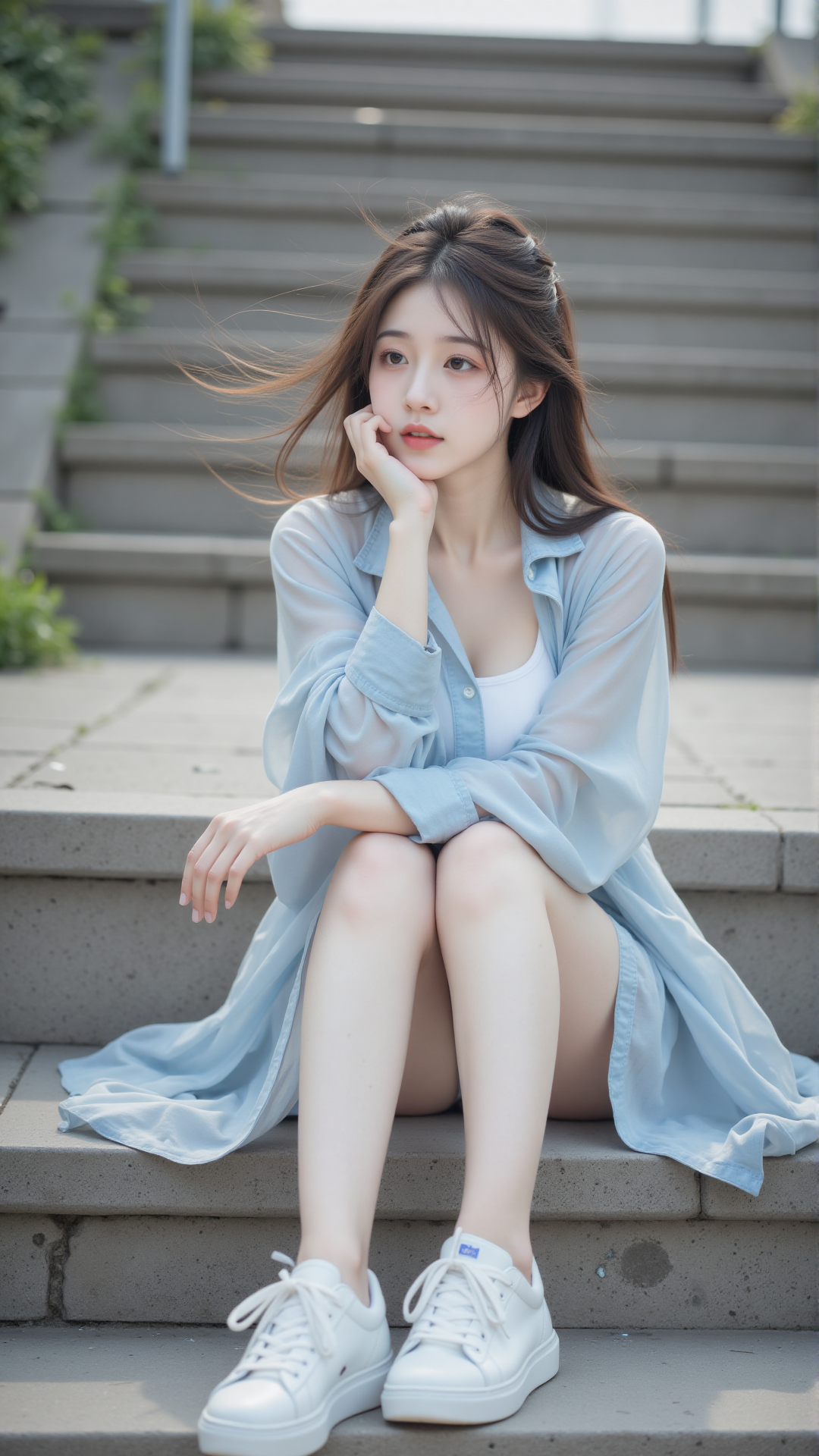 午后微风,轻轻掠过城市的缝隙,吹动她垂落肩头的长发,如丝如雾,在灰白的阶梯上划出一道柔美的弧线。她坐在石阶中央,双腿自然交叠,仿佛不是在等待谁,而是在与时光对话。