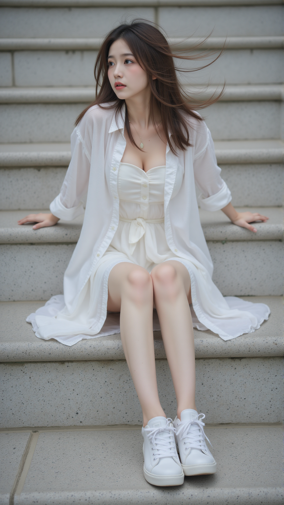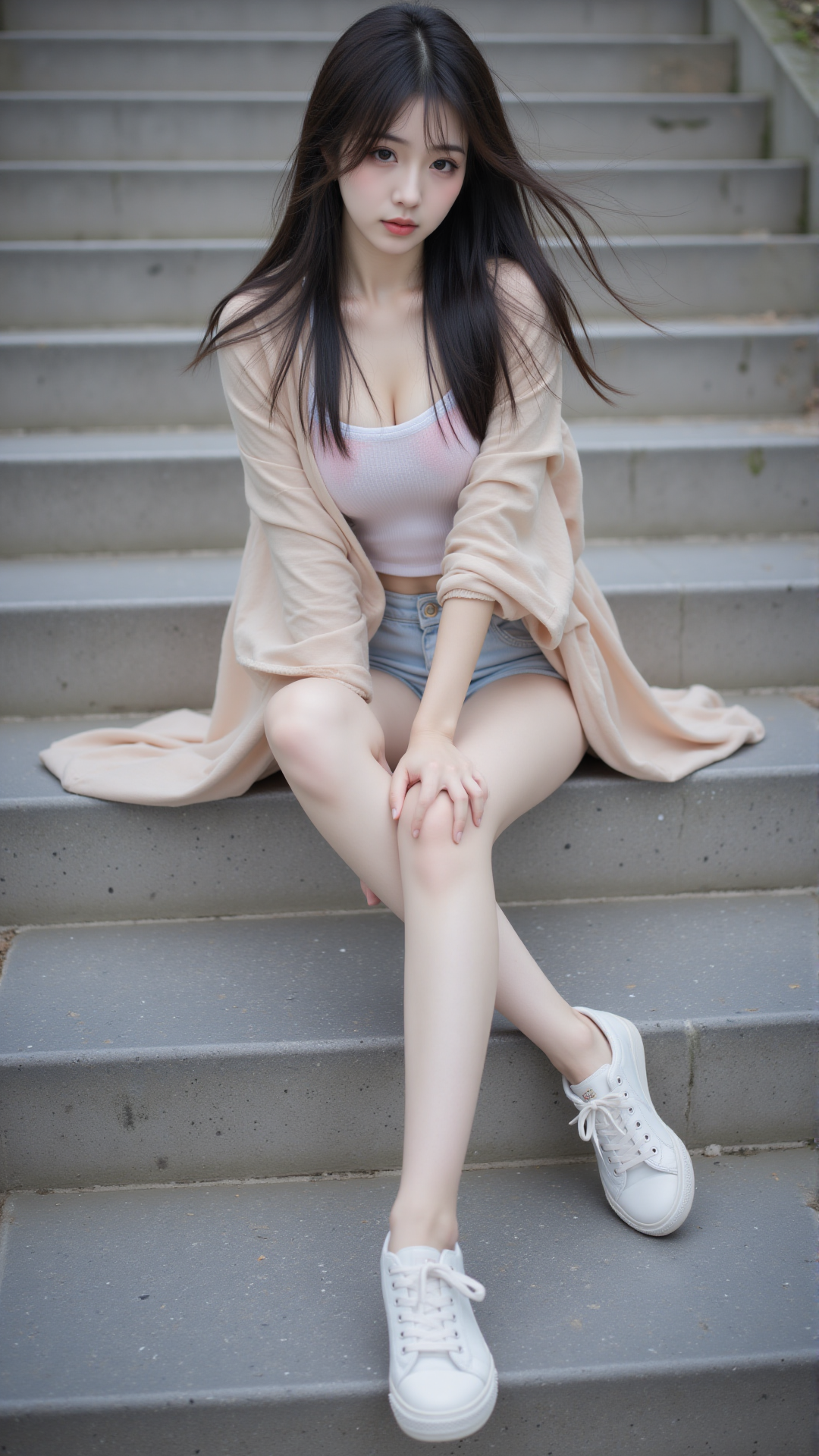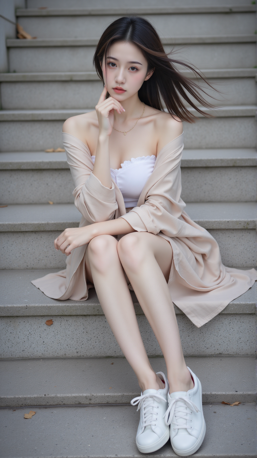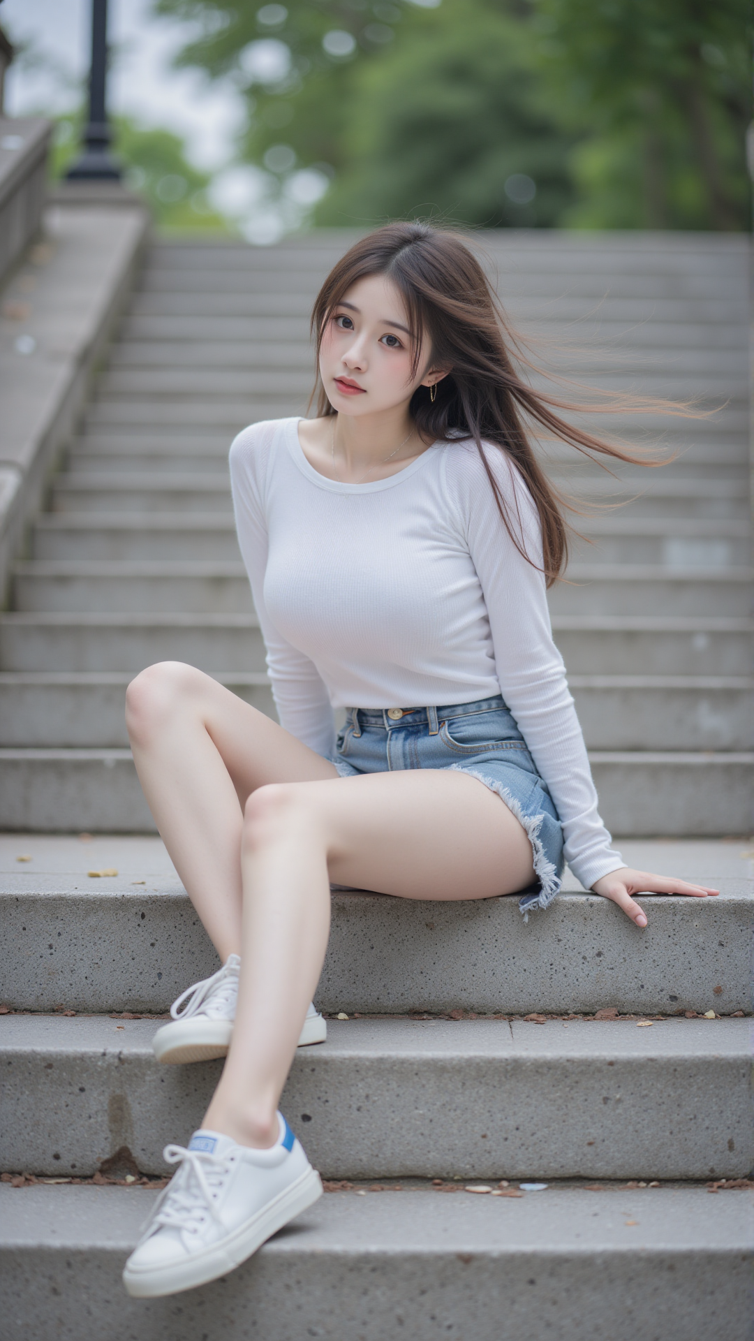 午后微风,轻轻掠过城市的缝隙,吹动她垂落肩头的长发,如丝如雾,在灰白的阶梯上划出一道柔美的弧线。她坐在石阶中央,双腿自然交叠,仿佛不是在等待谁,而是在与时光对话。