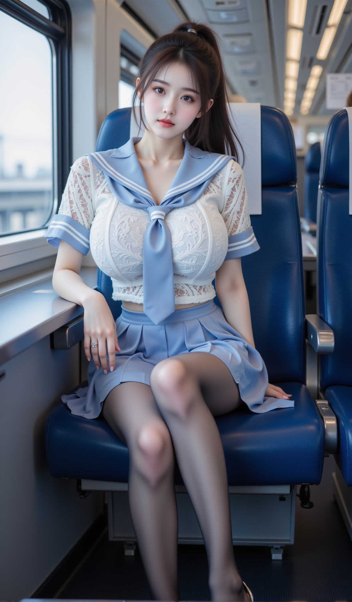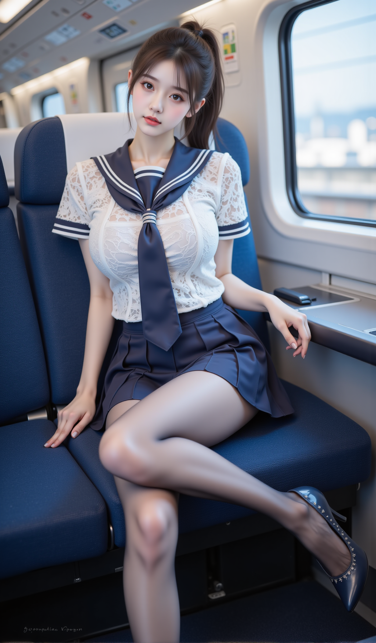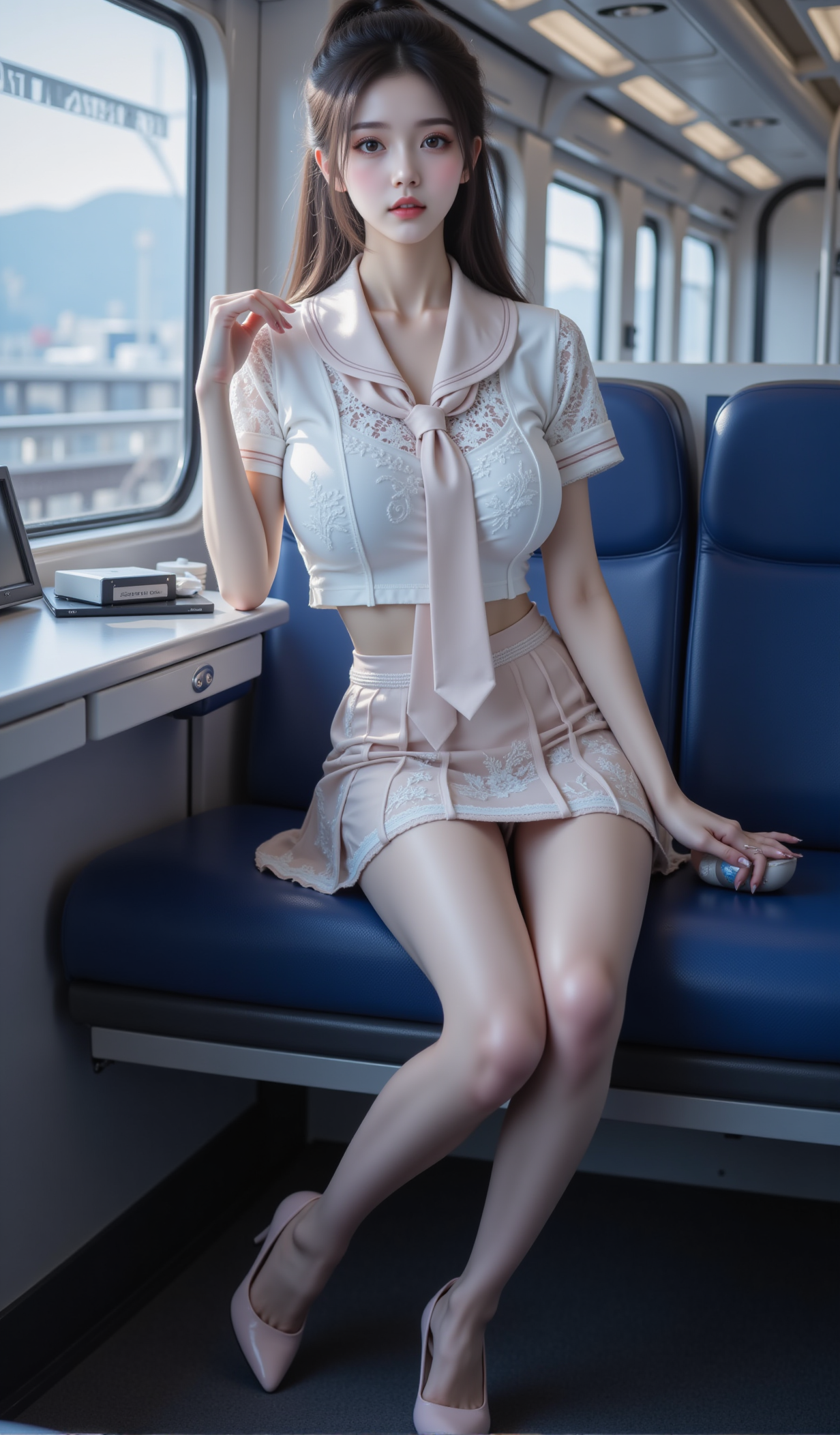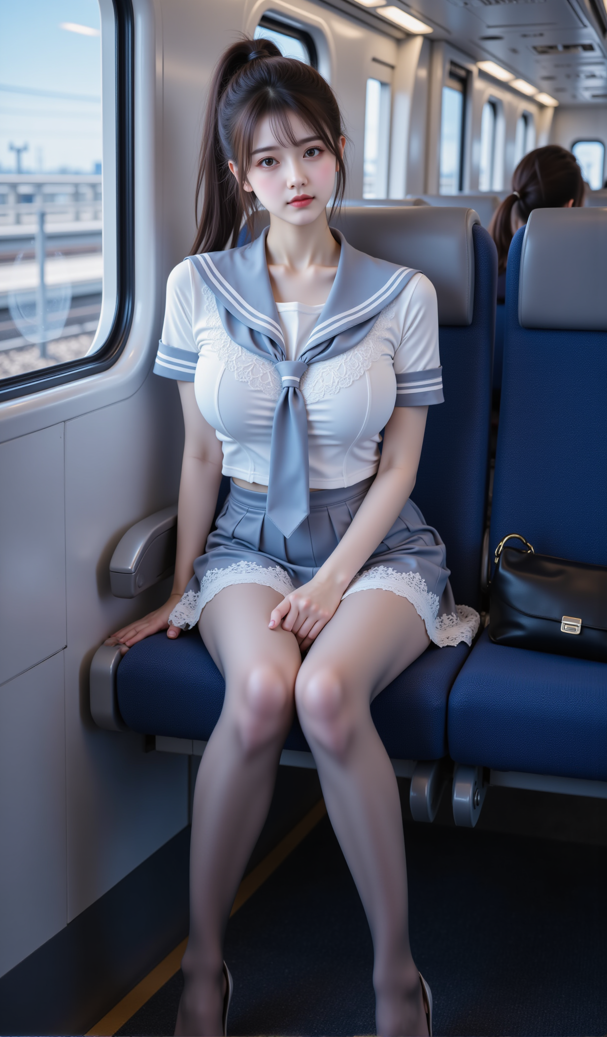 清晨的电车缓缓启动,玻璃窗映出城市的轮廓,也映出她安静的身影。她坐在靠窗的蓝色座椅上,身着一袭改良水手服——白色蕾丝短袖贴合身形,领口系着深蓝缎带,微微松开的结仿佛藏着一丝不经意的羞怯;下身是垂坠感十足的百褶短裙,裙边缀着细腻的白色花边,随车身轻微晃动而轻轻起伏。