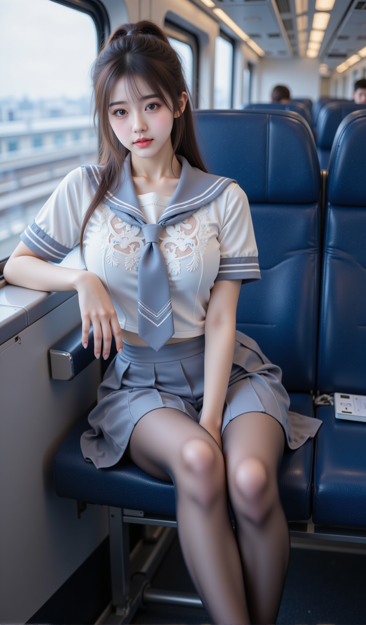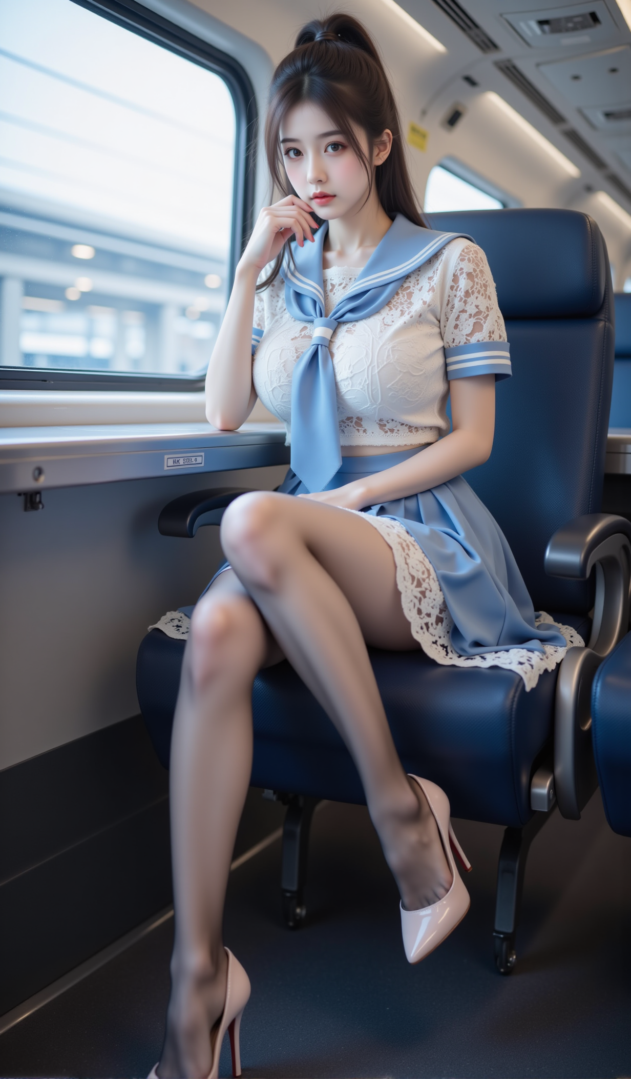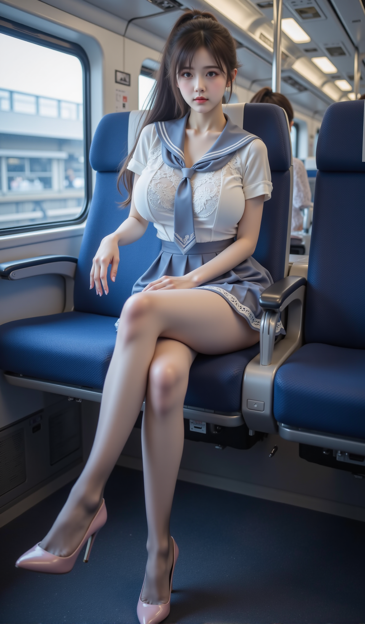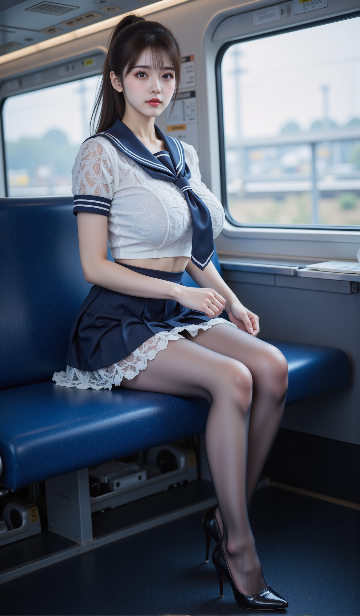 清晨的电车缓缓启动,玻璃窗映出城市的轮廓,也映出她安静的身影。她坐在靠窗的蓝色座椅上,身着一袭改良水手服——白色蕾丝短袖贴合身形,领口系着深蓝缎带,微微松开的结仿佛藏着一丝不经意的羞怯;下身是垂坠感十足的百褶短裙,裙边缀着细腻的白色花边,随车身轻微晃动而轻轻起伏。
