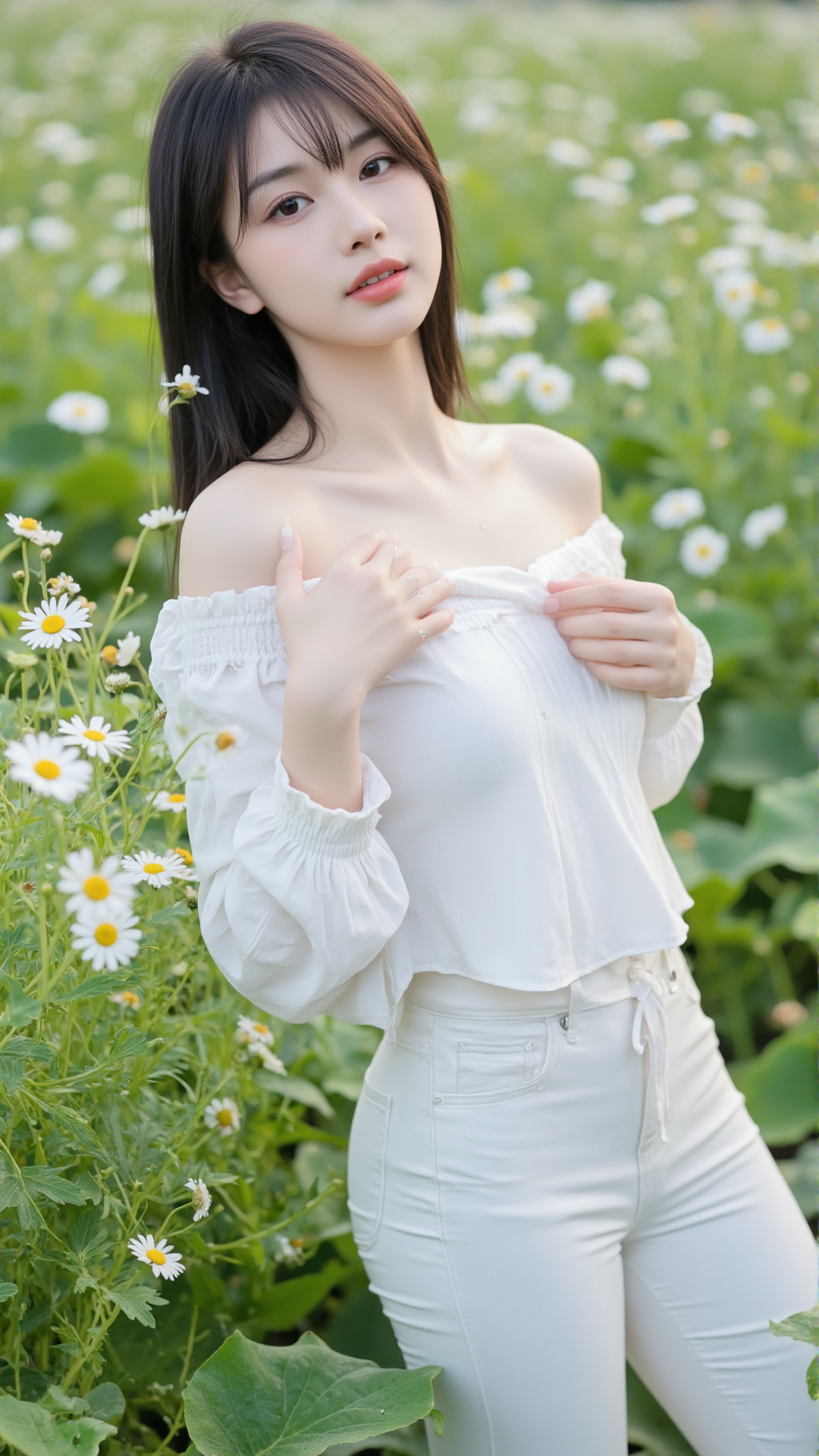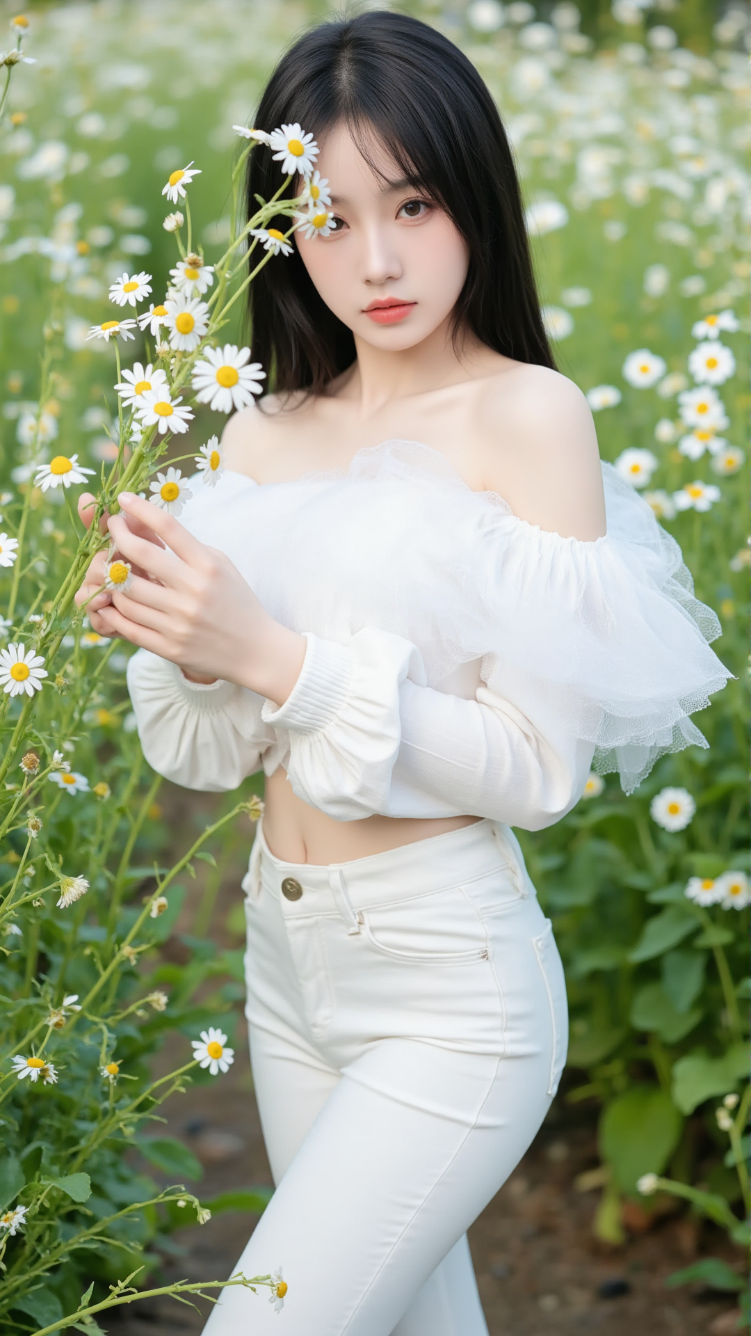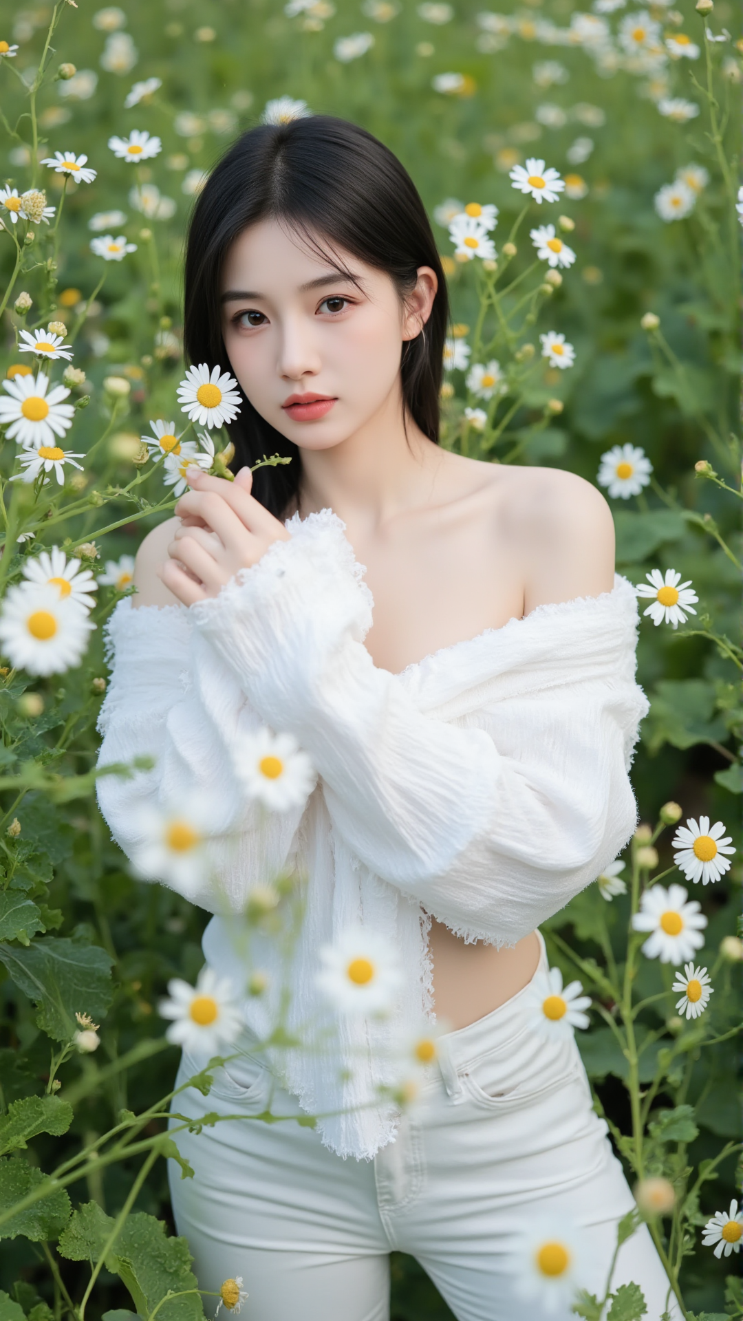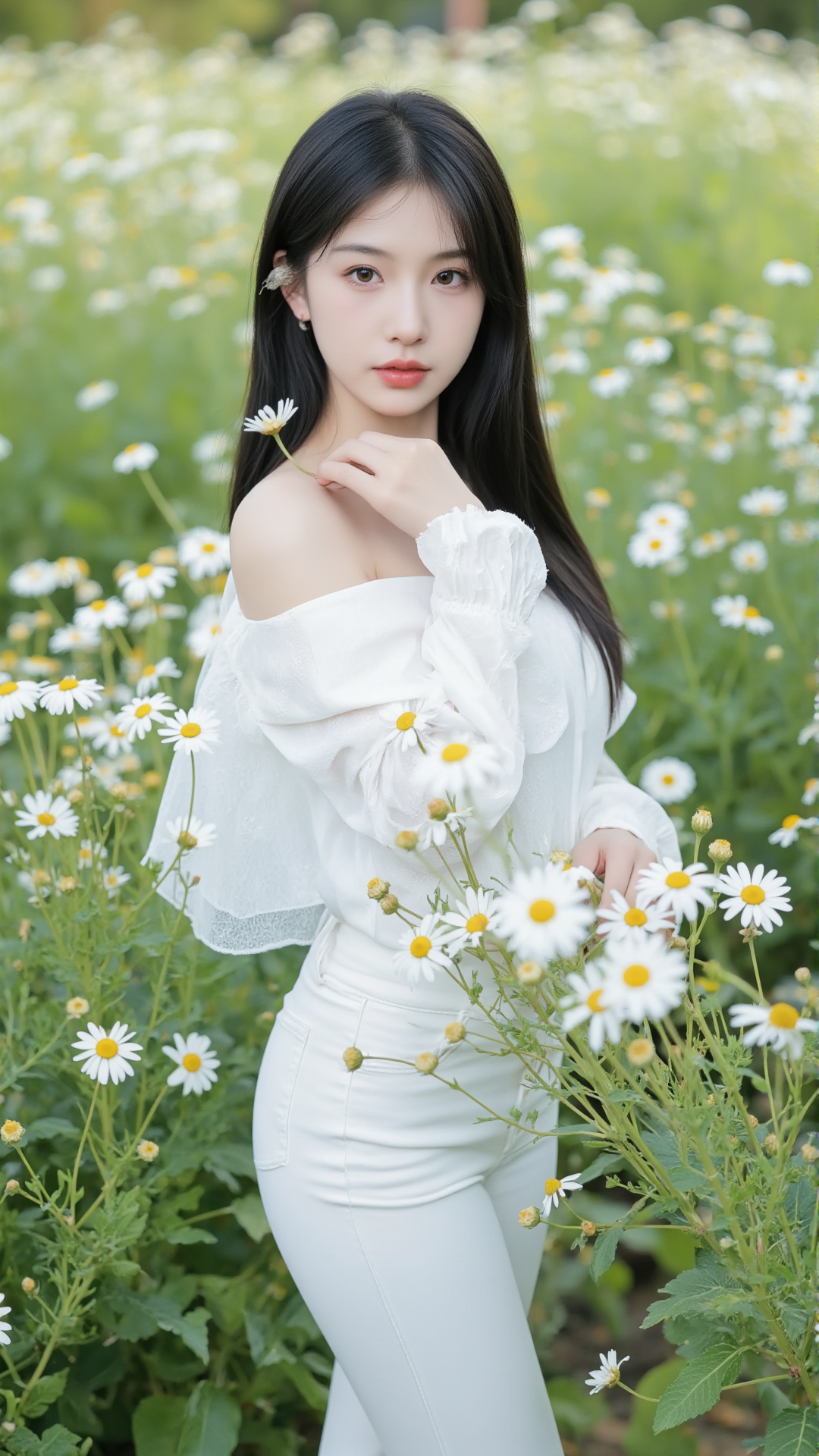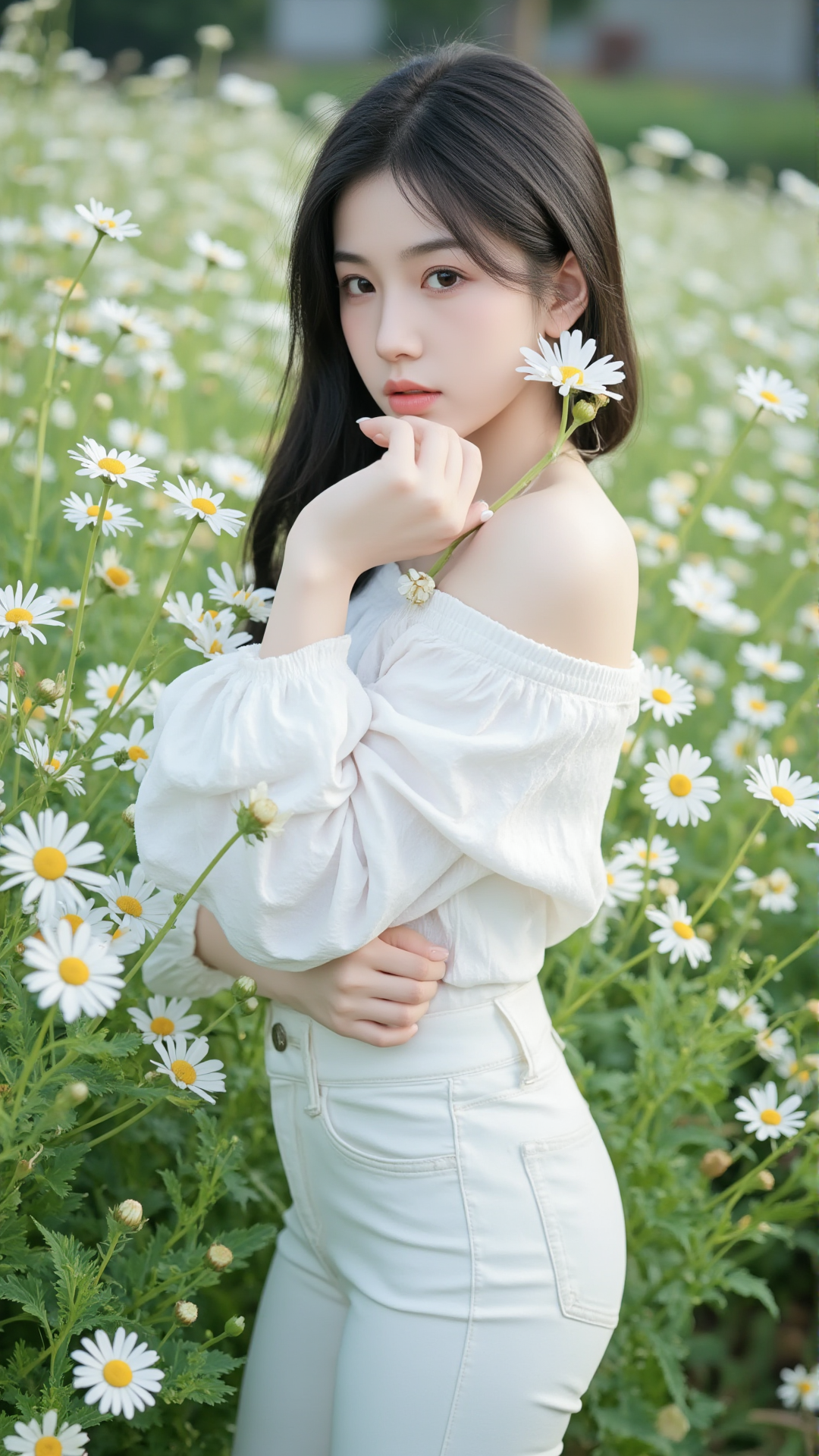 她立于花丛中央,一袭纯白露肩上衣,袖口蓬松如云朵,轻盈地搭在臂弯,勾勒出柔美的线条。下身是一条贴合身形的白色牛仔裤,简洁却不失韵味,宛如从画中走出的精灵。她的长发乌黑顺滑,随风轻扬,几缕发丝垂落在肩头,与花瓣相映成趣。