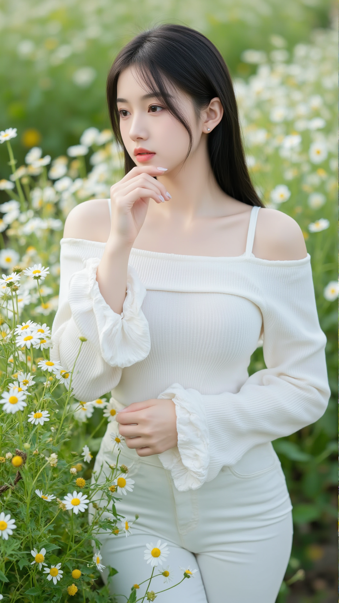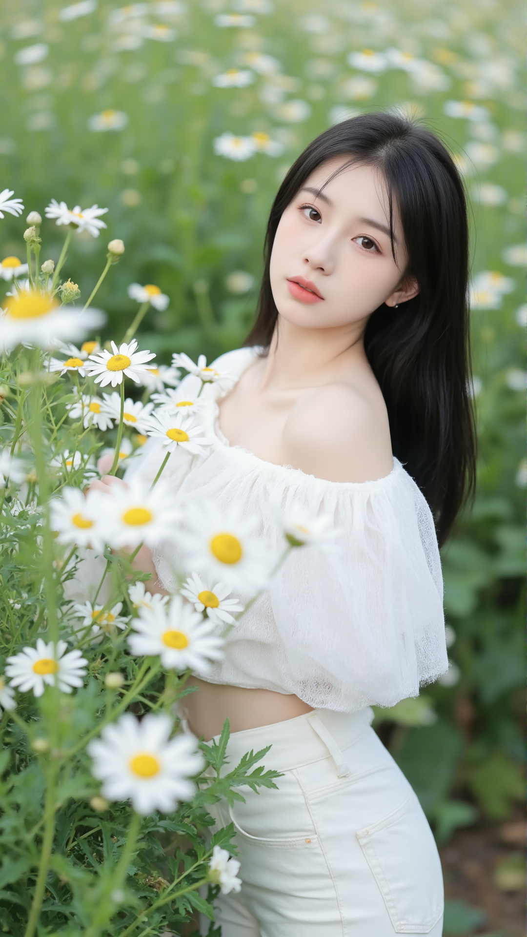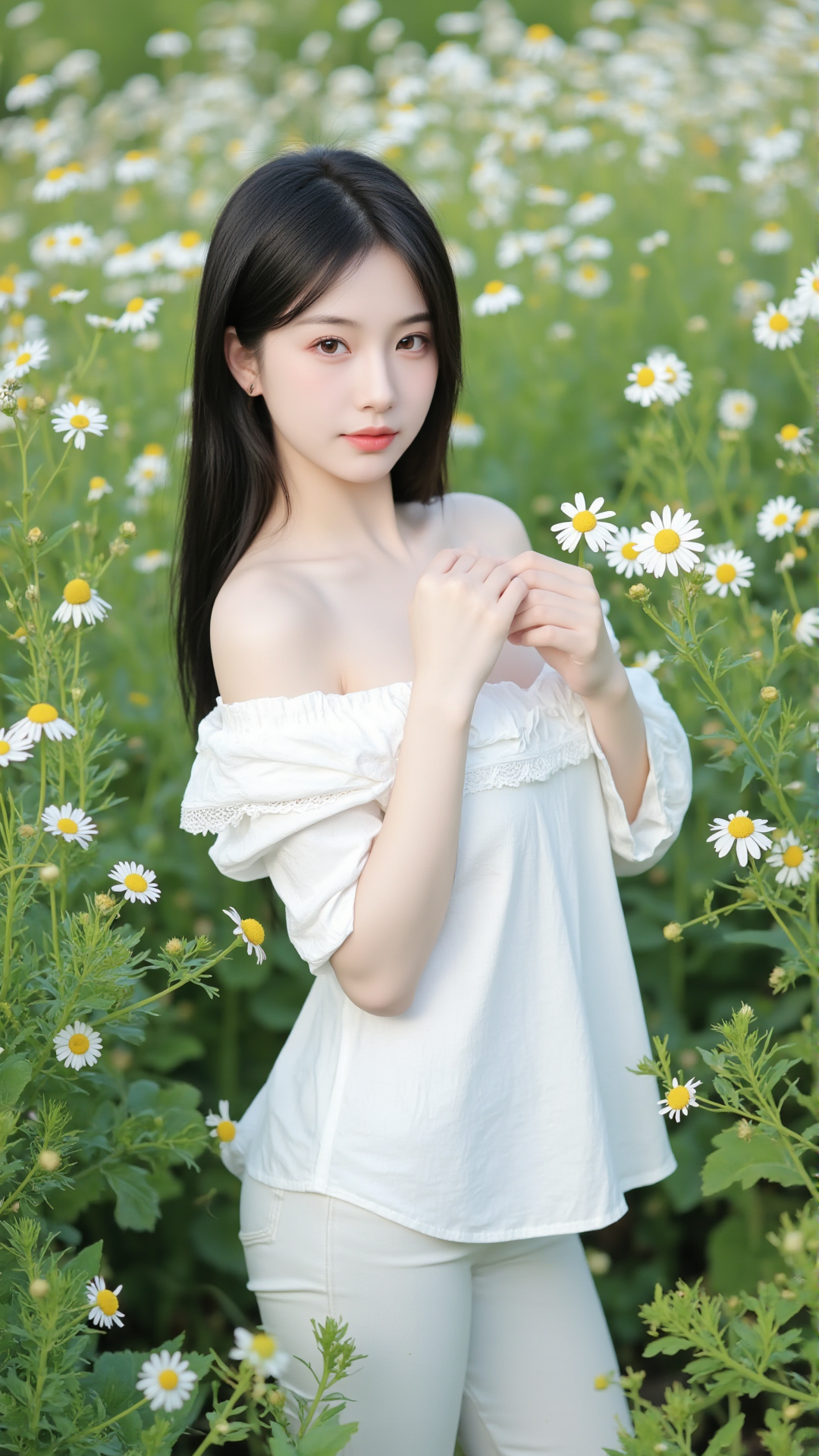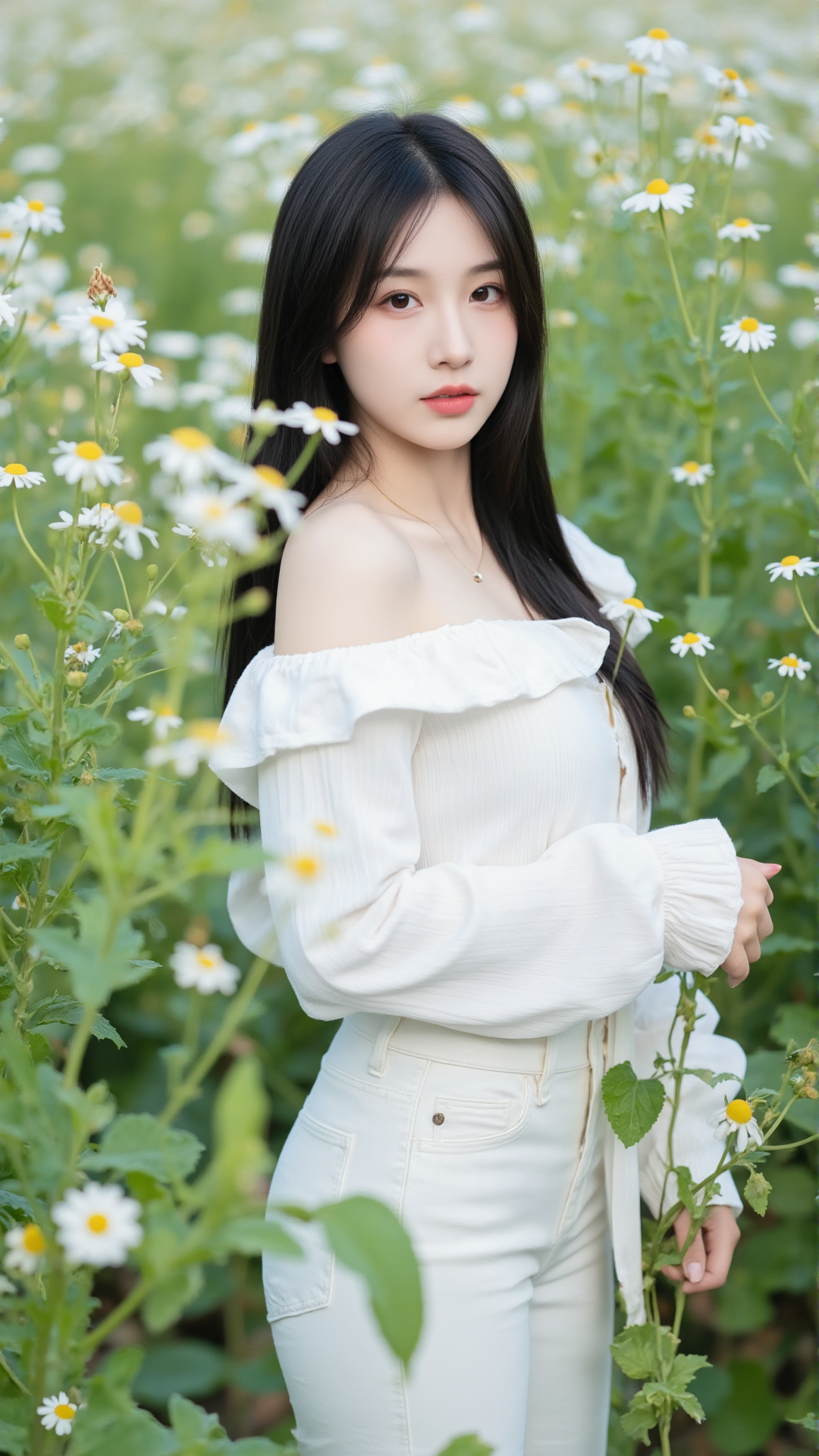 她立于花丛中央,一袭纯白露肩上衣,袖口蓬松如云朵,轻盈地搭在臂弯,勾勒出柔美的线条。下身是一条贴合身形的白色牛仔裤,简洁却不失韵味,宛如从画中走出的精灵。她的长发乌黑顺滑,随风轻扬,几缕发丝垂落在肩头,与花瓣相映成趣。