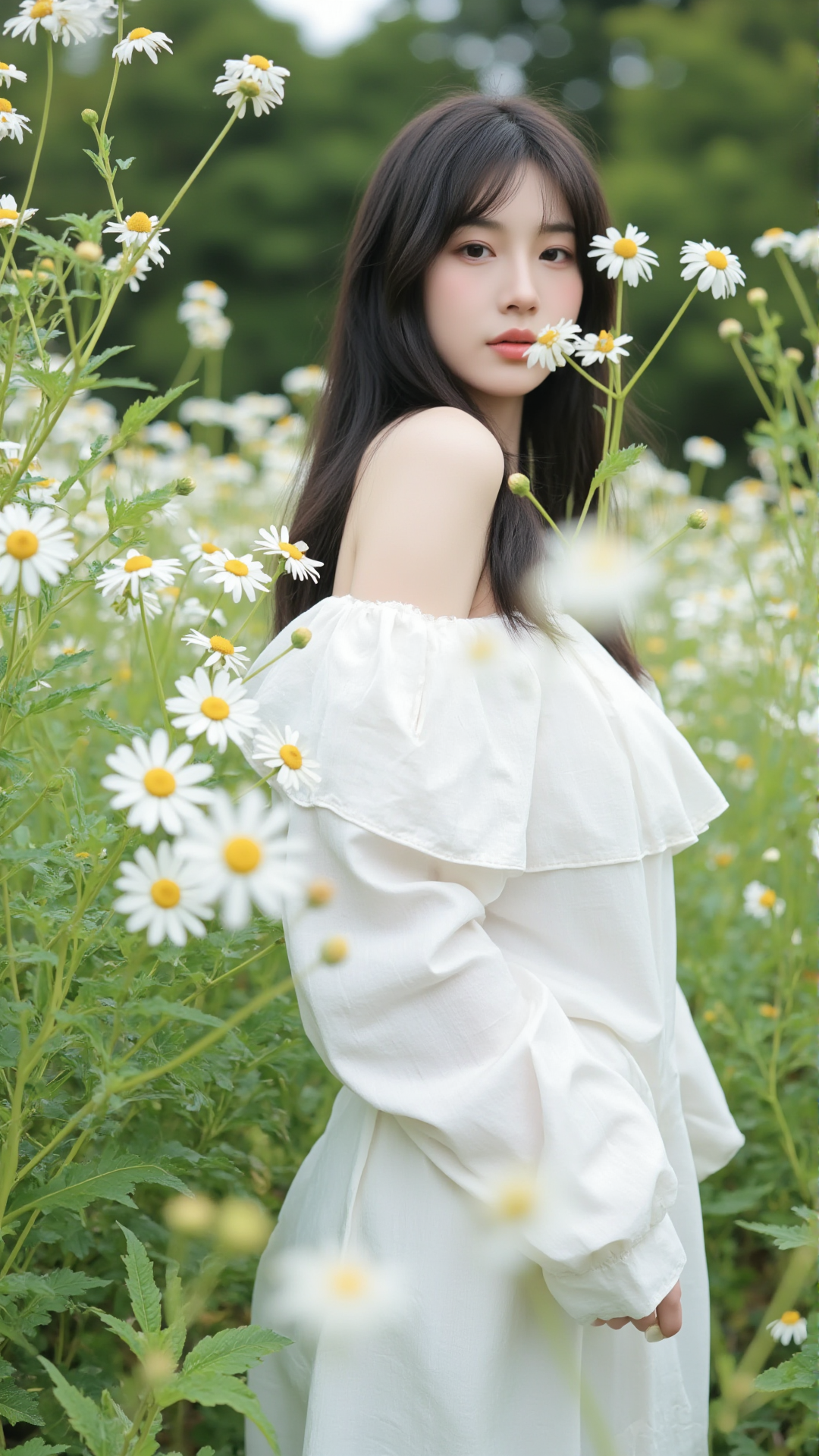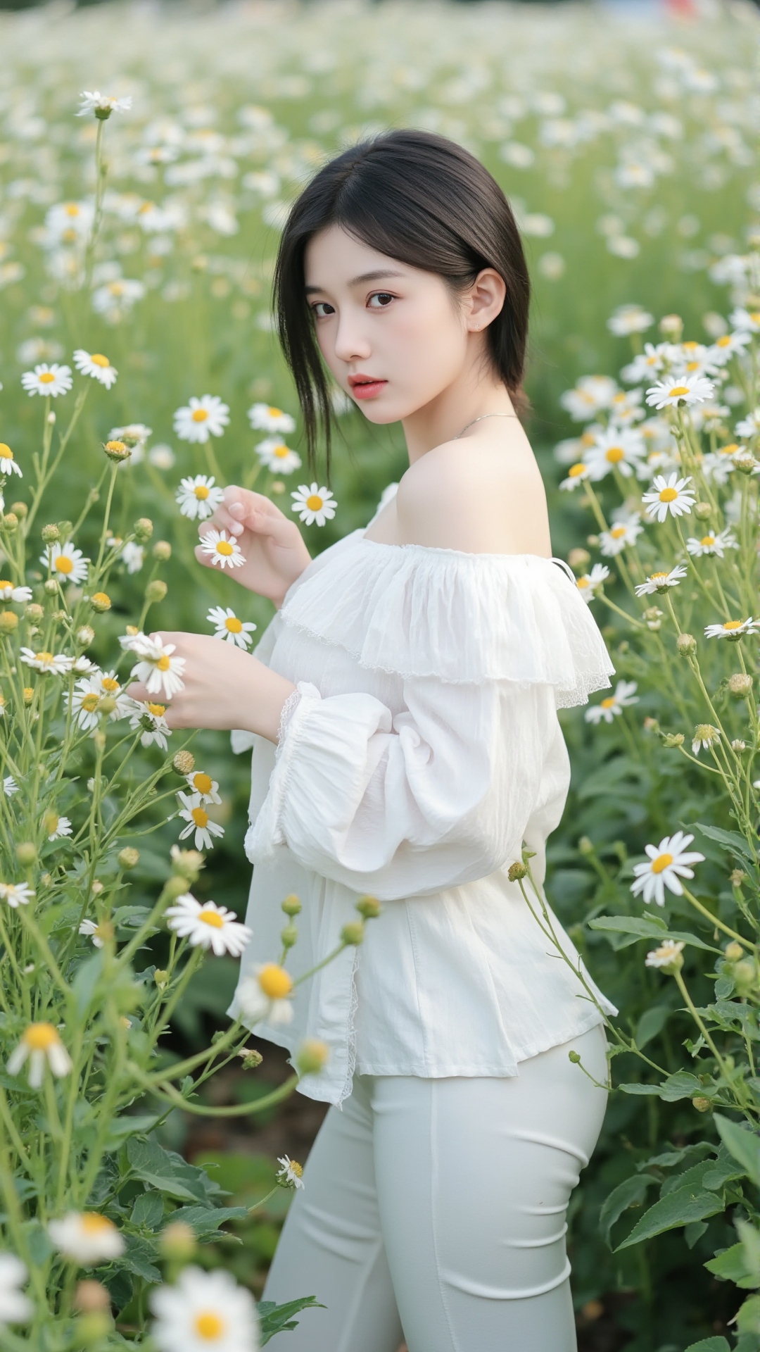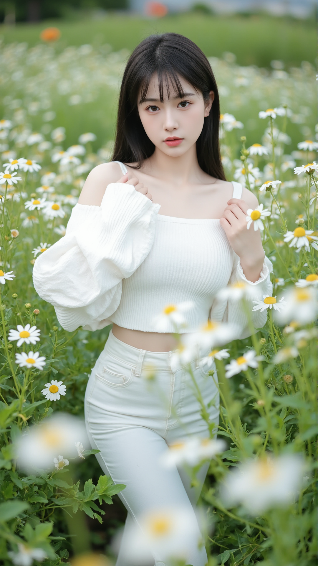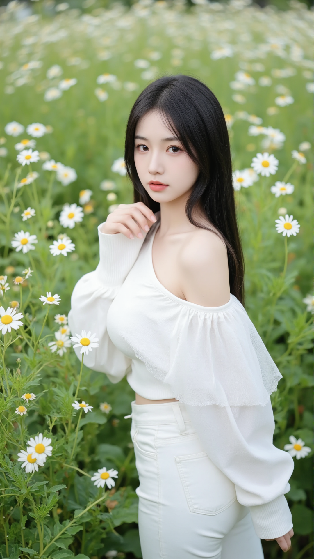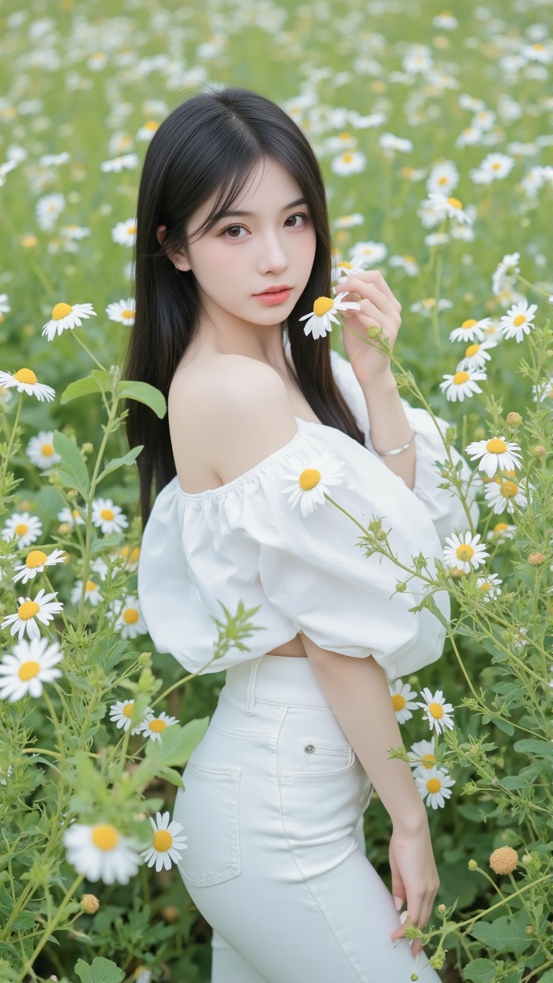 她立于花丛中央,一袭纯白露肩上衣,袖口蓬松如云朵,轻盈地搭在臂弯,勾勒出柔美的线条。下身是一条贴合身形的白色牛仔裤,简洁却不失韵味,宛如从画中走出的精灵。她的长发乌黑顺滑,随风轻扬,几缕发丝垂落在肩头,与花瓣相映成趣。