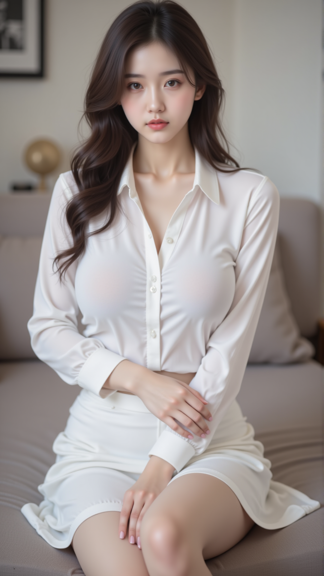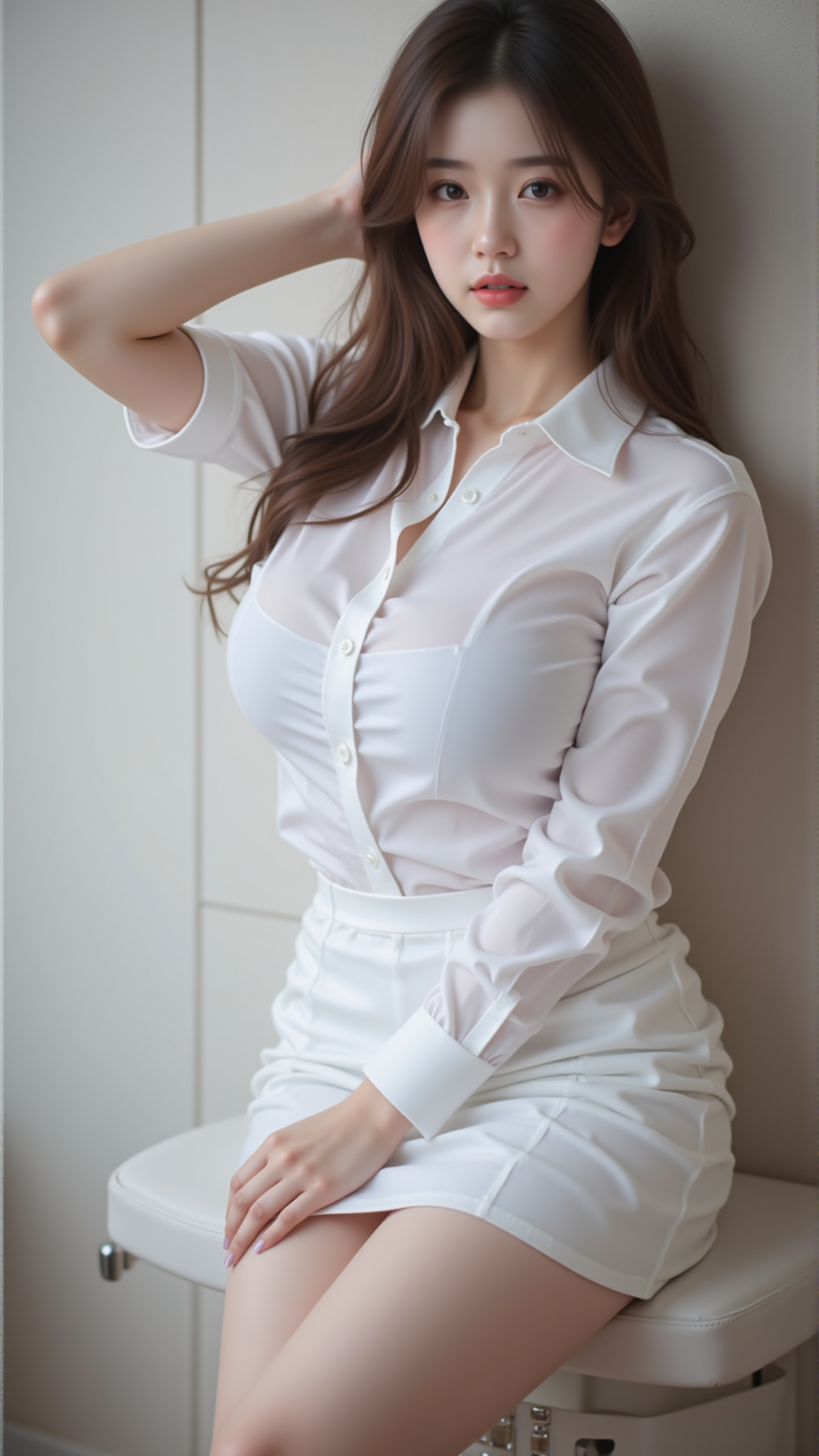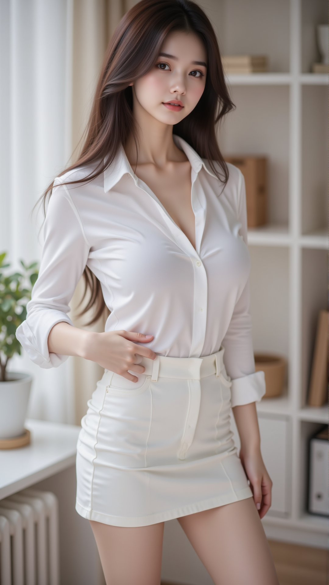 晨光悄然漫过窗棂,落在她身上,像一层薄纱轻轻覆盖。她穿着一件纯白衬衫,领口微微敞开,几颗珍珠般的小扣子在光线下泛着温润的光泽。衬衫贴合身形,勾勒出流畅的肩线与柔美的弧度,仿佛是为她量身定制的诗行。