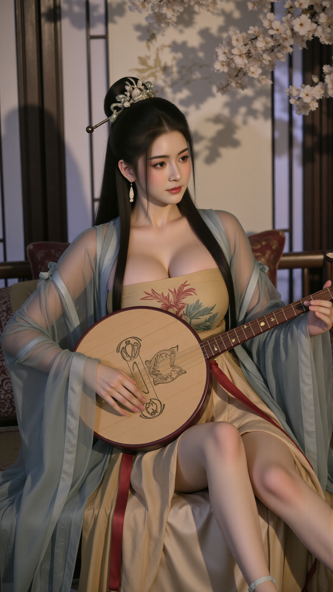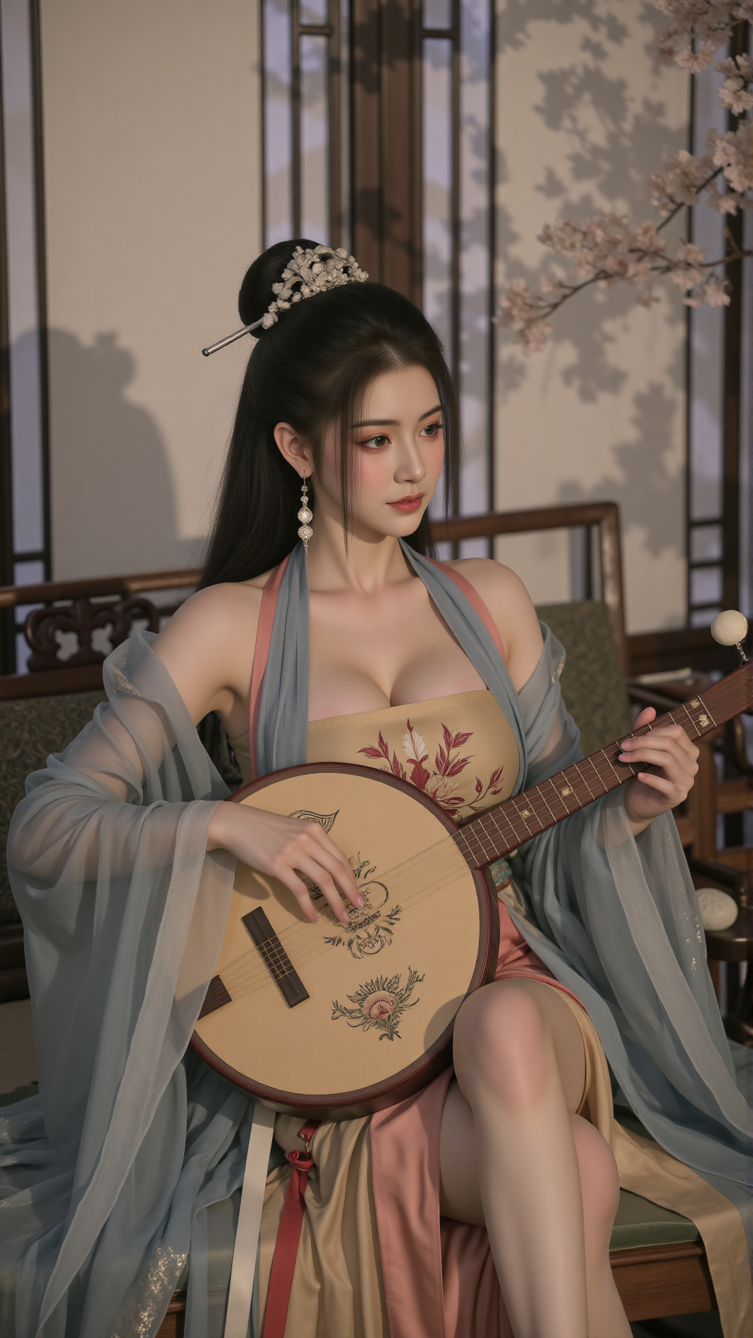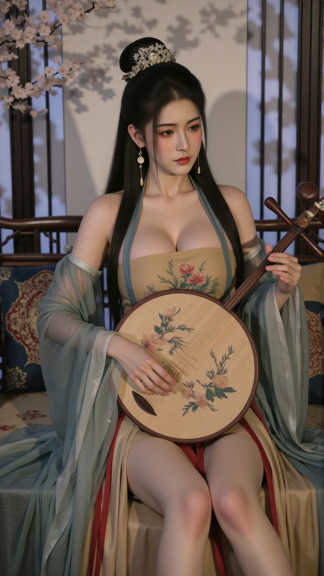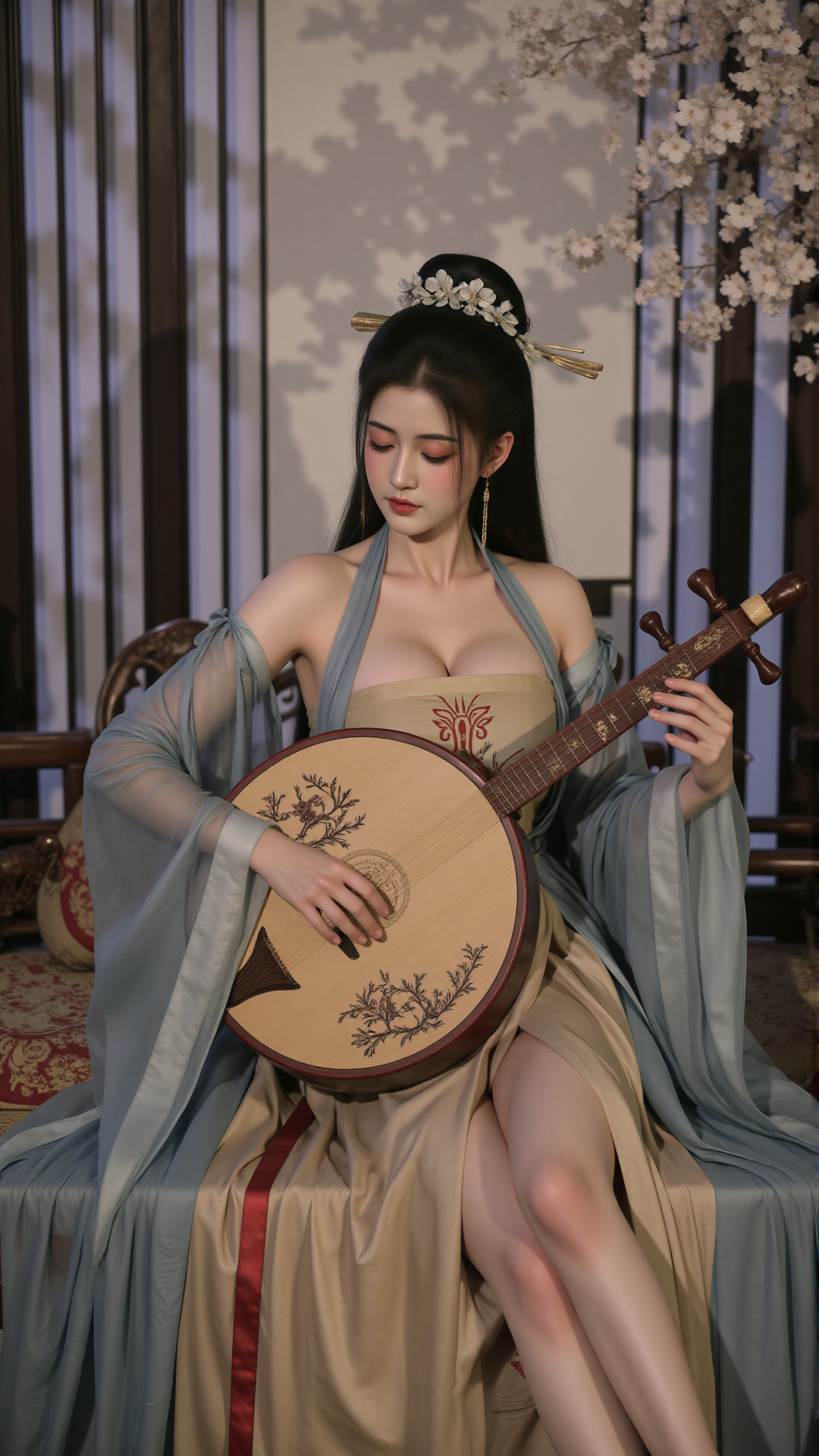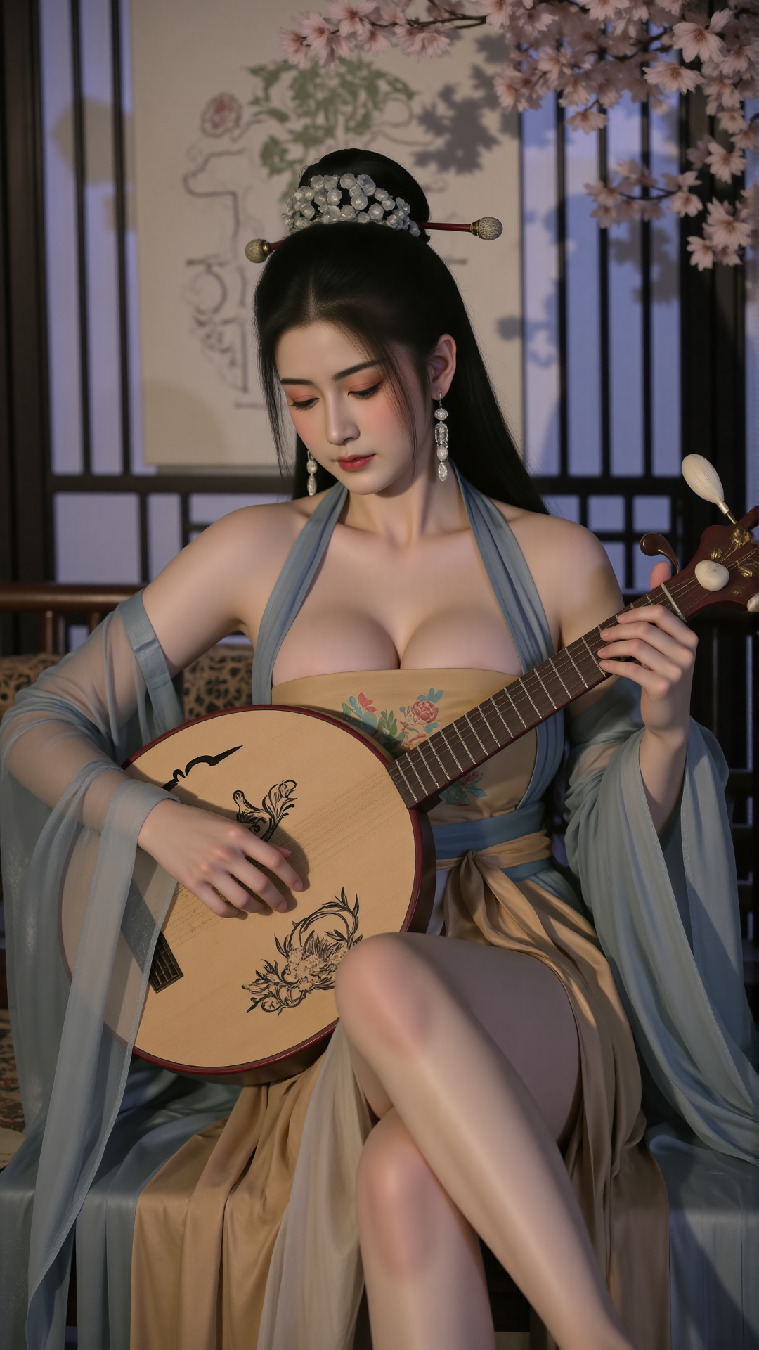 窗外,樱花依旧飘落,落在她的肩头、发梢,也落在那把古老的琵琶上。光影交错,她的身影与花影重叠,仿佛不是凡尘之人,而是从《霓裳羽衣曲》中走出的乐伎,是长安月下最动人的那一道风景。