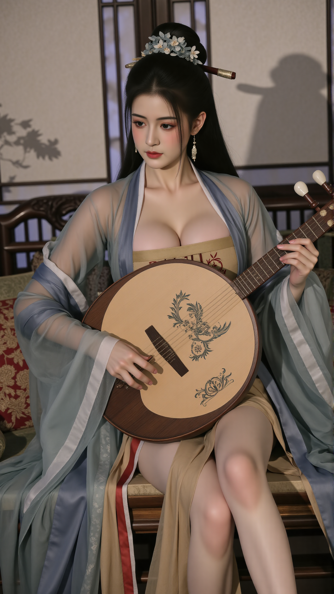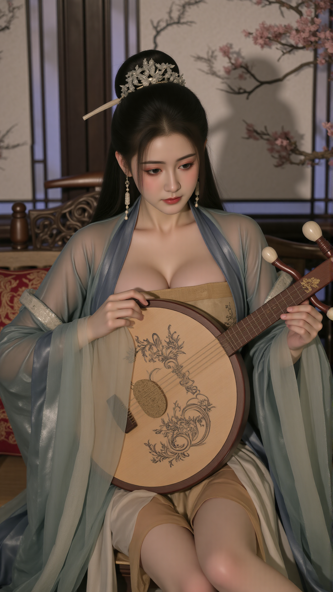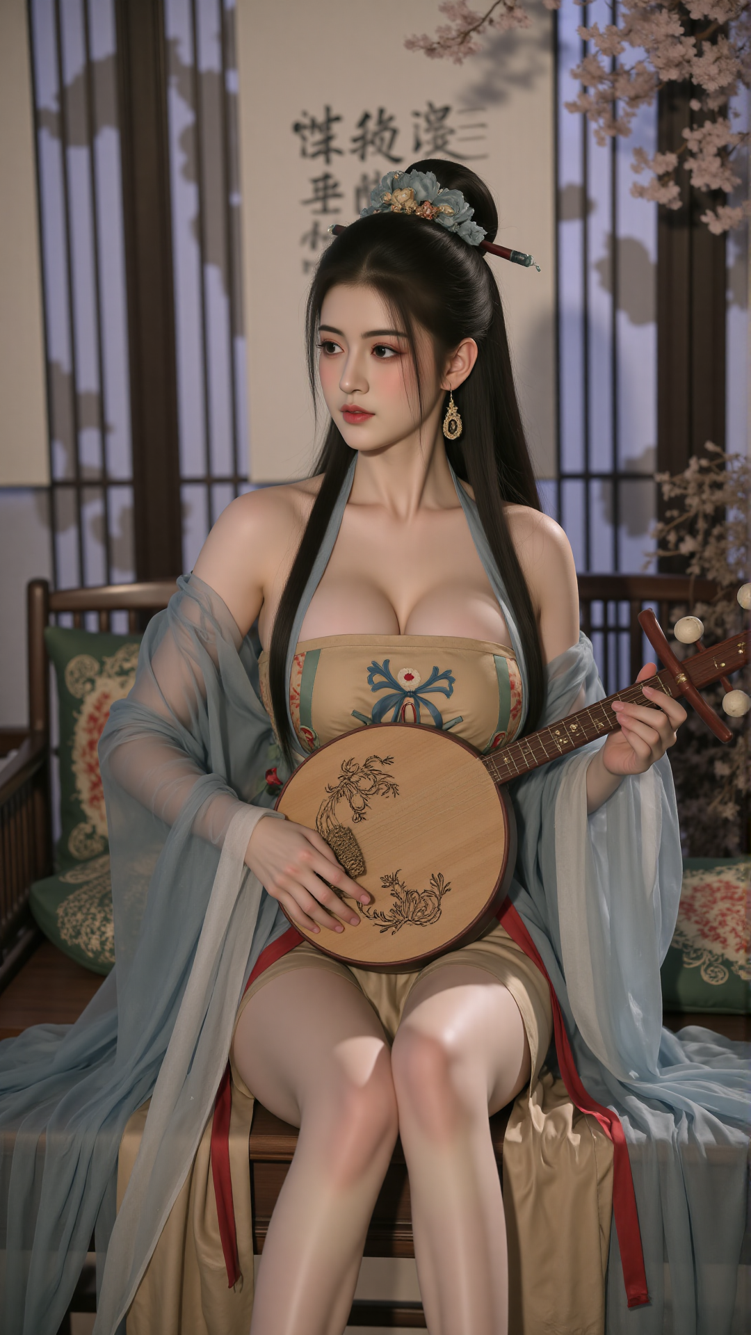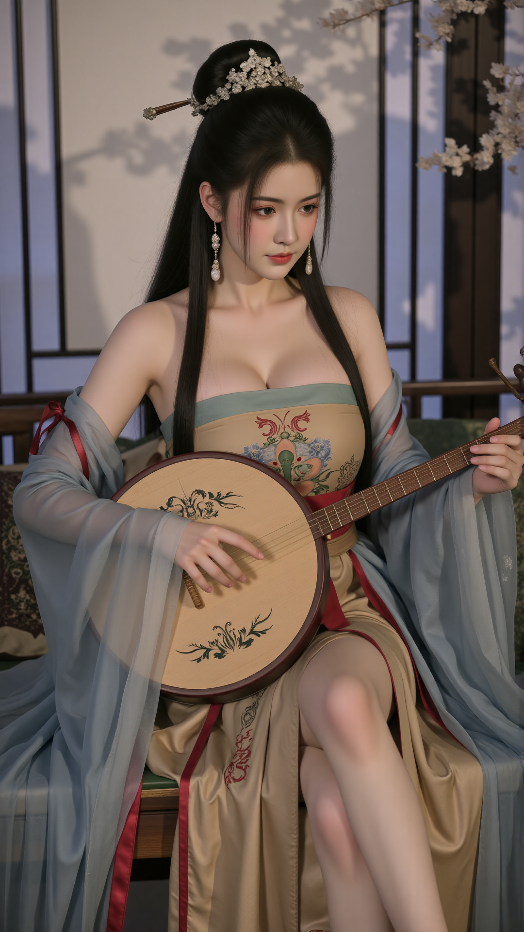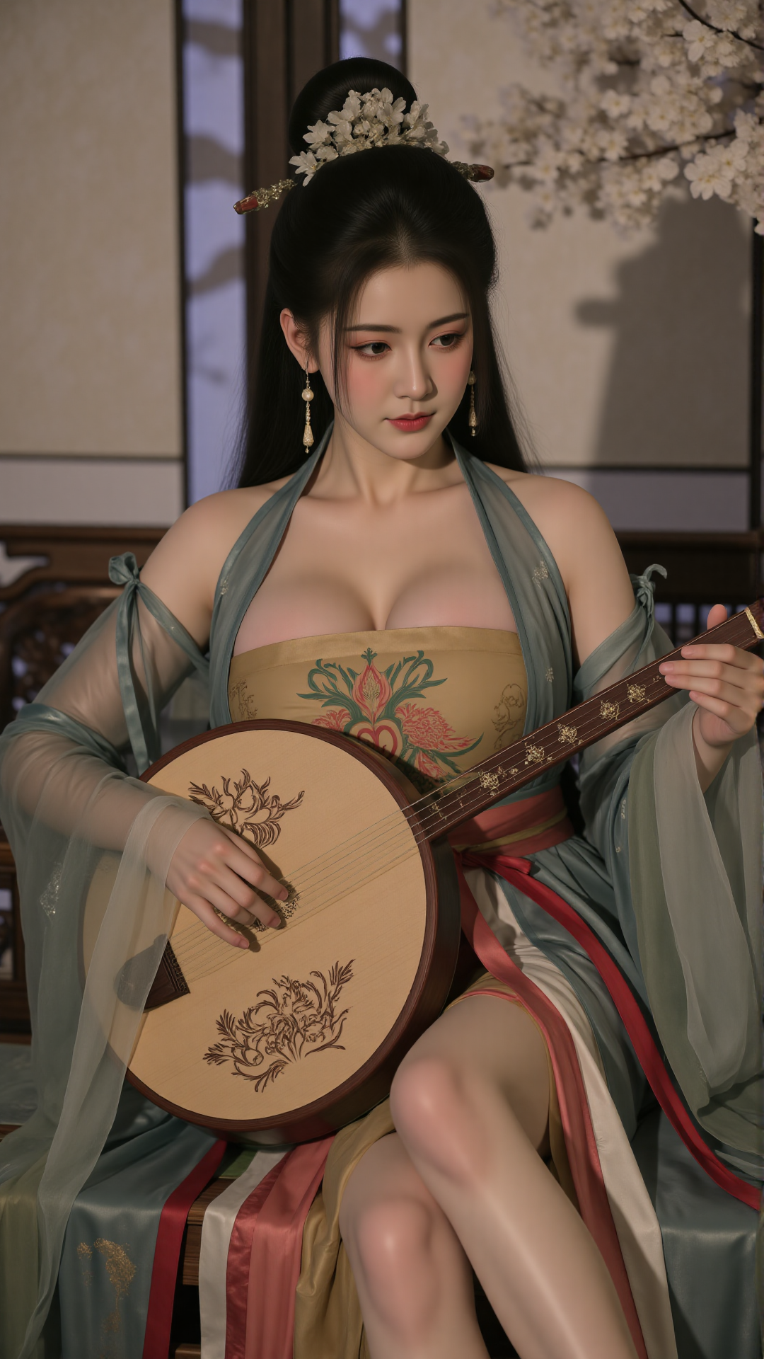 窗外,樱花依旧飘落,落在她的肩头、发梢,也落在那把古老的琵琶上。光影交错,她的身影与花影重叠,仿佛不是凡尘之人,而是从《霓裳羽衣曲》中走出的乐伎,是长安月下最动人的那一道风景。