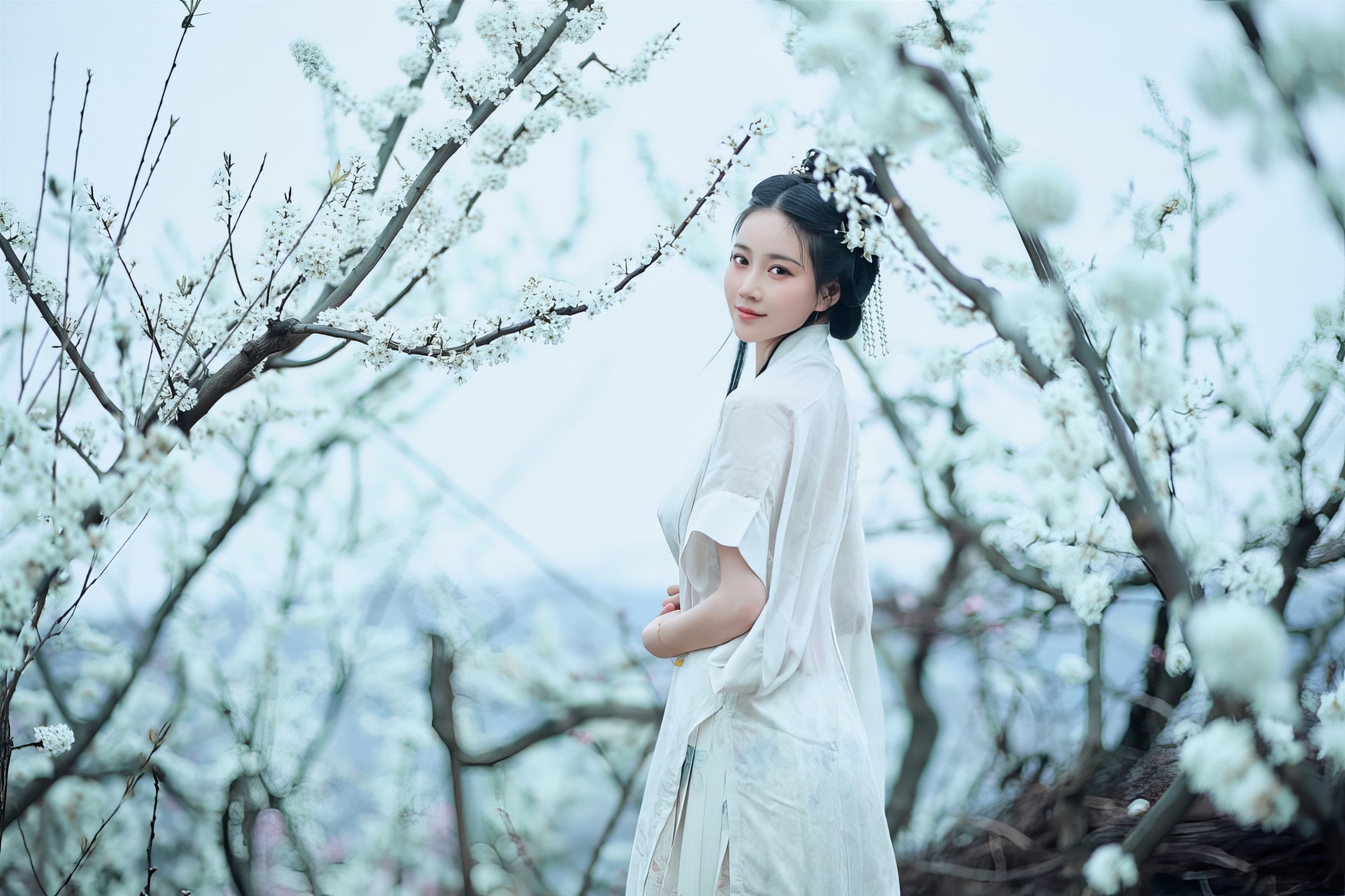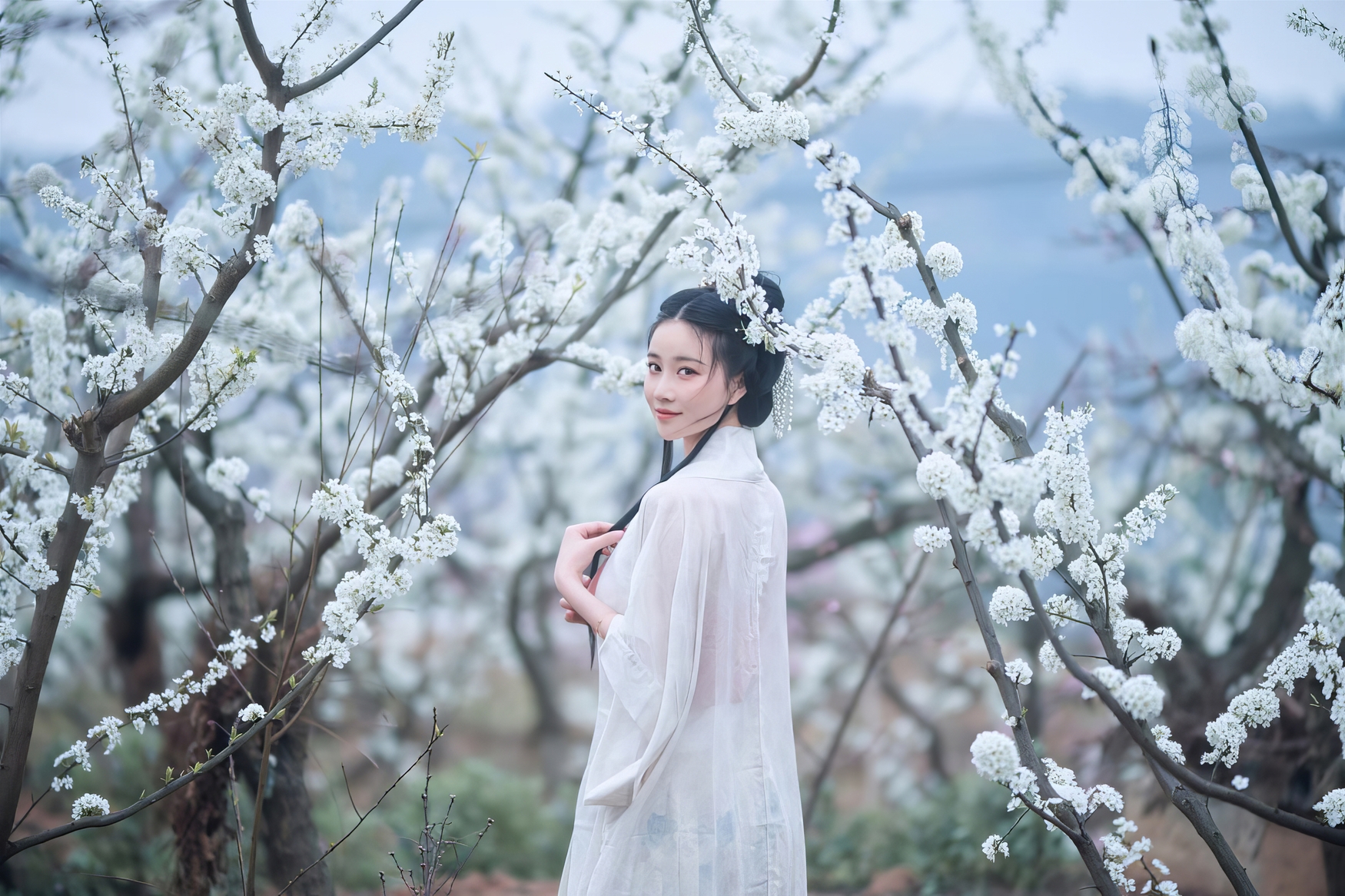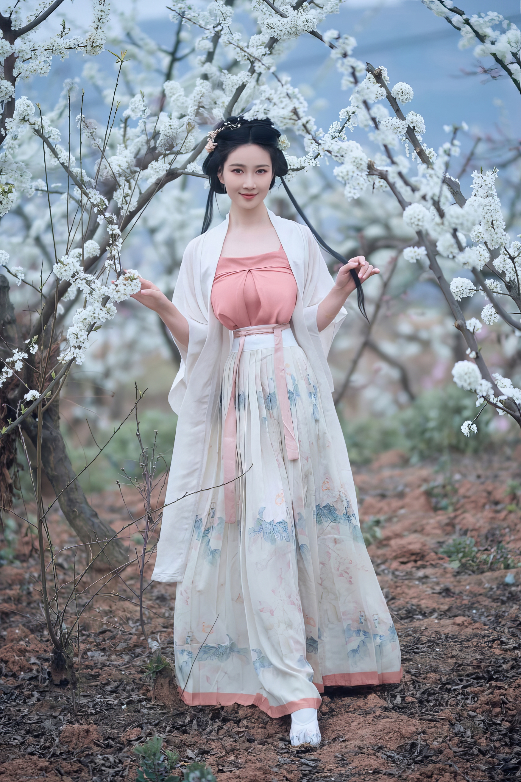春风悄然拂过山野,携着泥土的芬芳与花蕊的甜香,轻轻掀开了一幅流动的画卷。在这片被白色与粉色温柔浸染的桃林深处,一位身着汉服的女子,如从唐诗宋词中走来的仙子,静立于花影之间。