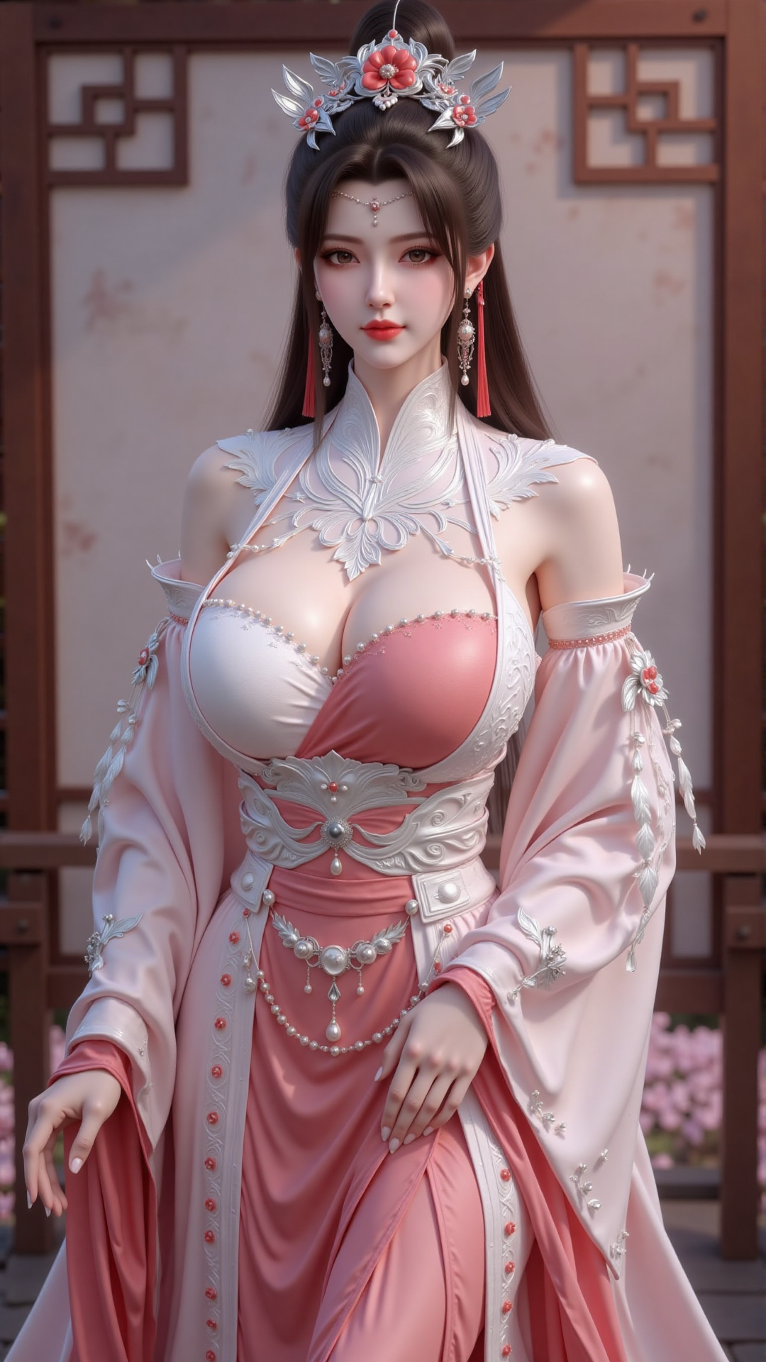 她身着一袭唐风霓裳,外罩轻透薄纱,内衬锦缎罗裙,金线绣出的牡丹在月光下泛着幽微光泽,宛如活物绽放。腰间束以深红织锦腰封,缀着细密流苏,每一步轻移,皆有玉佩低吟、珠翠轻颤。云鬓高挽,簪一支白玉花钿,步摇垂珠,在鬓边微微晃动,映着烛火,熠熠如星。
