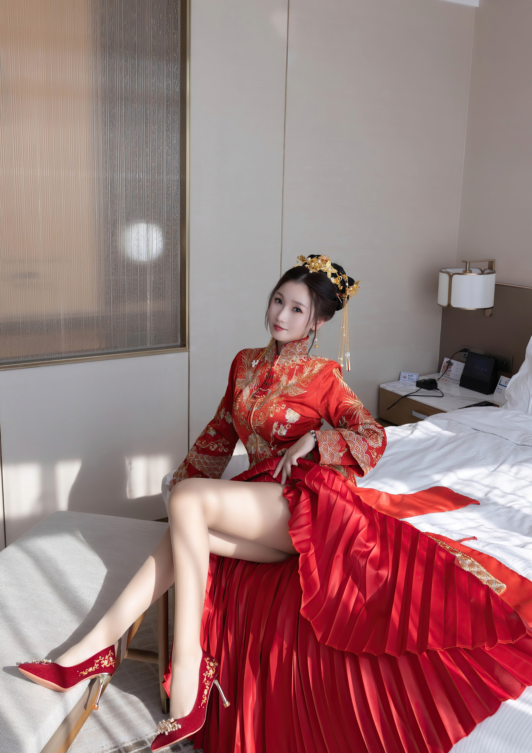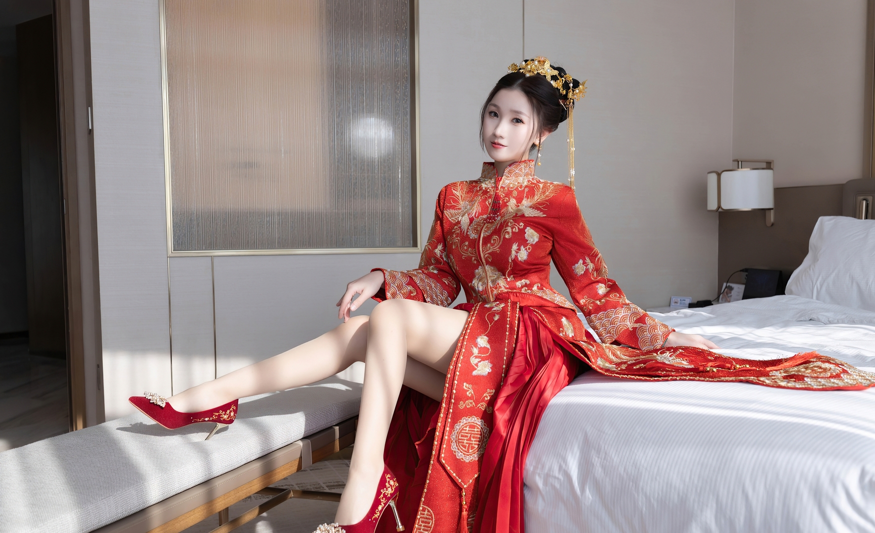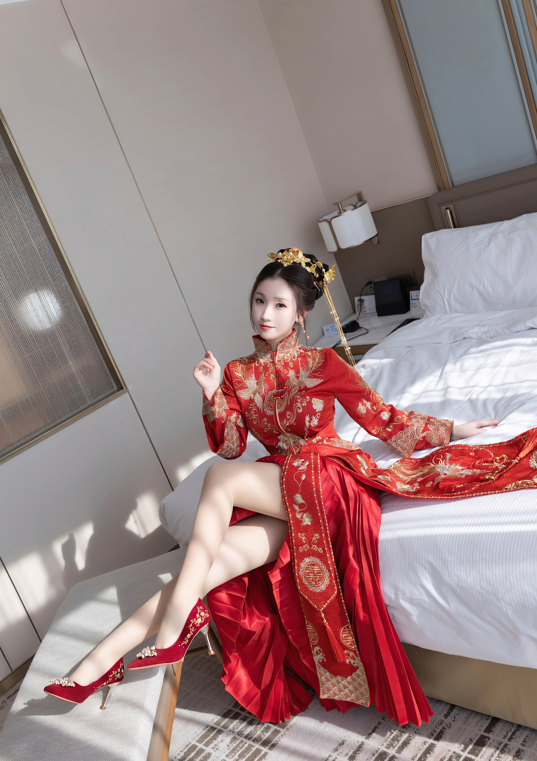 她坐在床沿,双腿微曲,脚尖轻点,一双红缎高跟婚鞋上绣着细密的金线牡丹,宛如踏着喜气而来。阳光穿过白纱窗帘,在她身上投下斑驳光影,红与金交织,像一幅流动的工笔画——是传统与现代的完美融合,是古典与时尚的温柔对话。