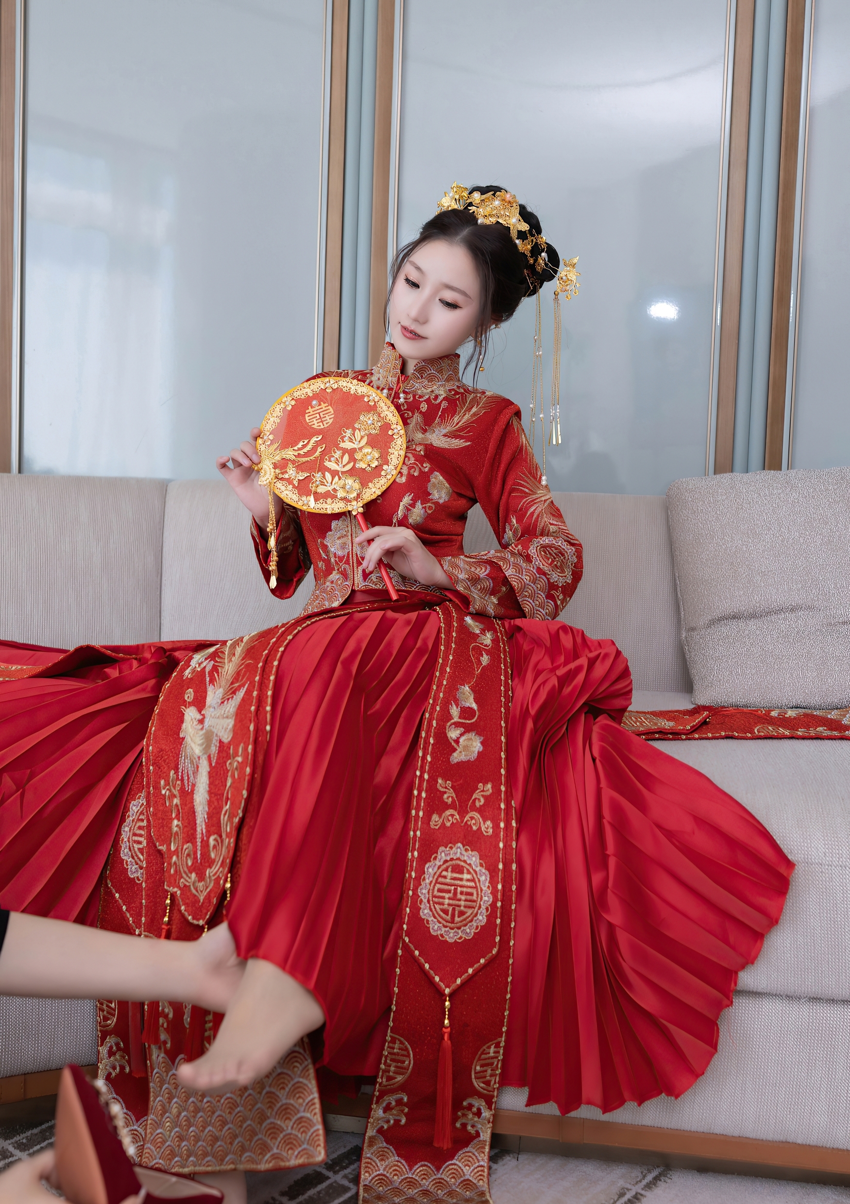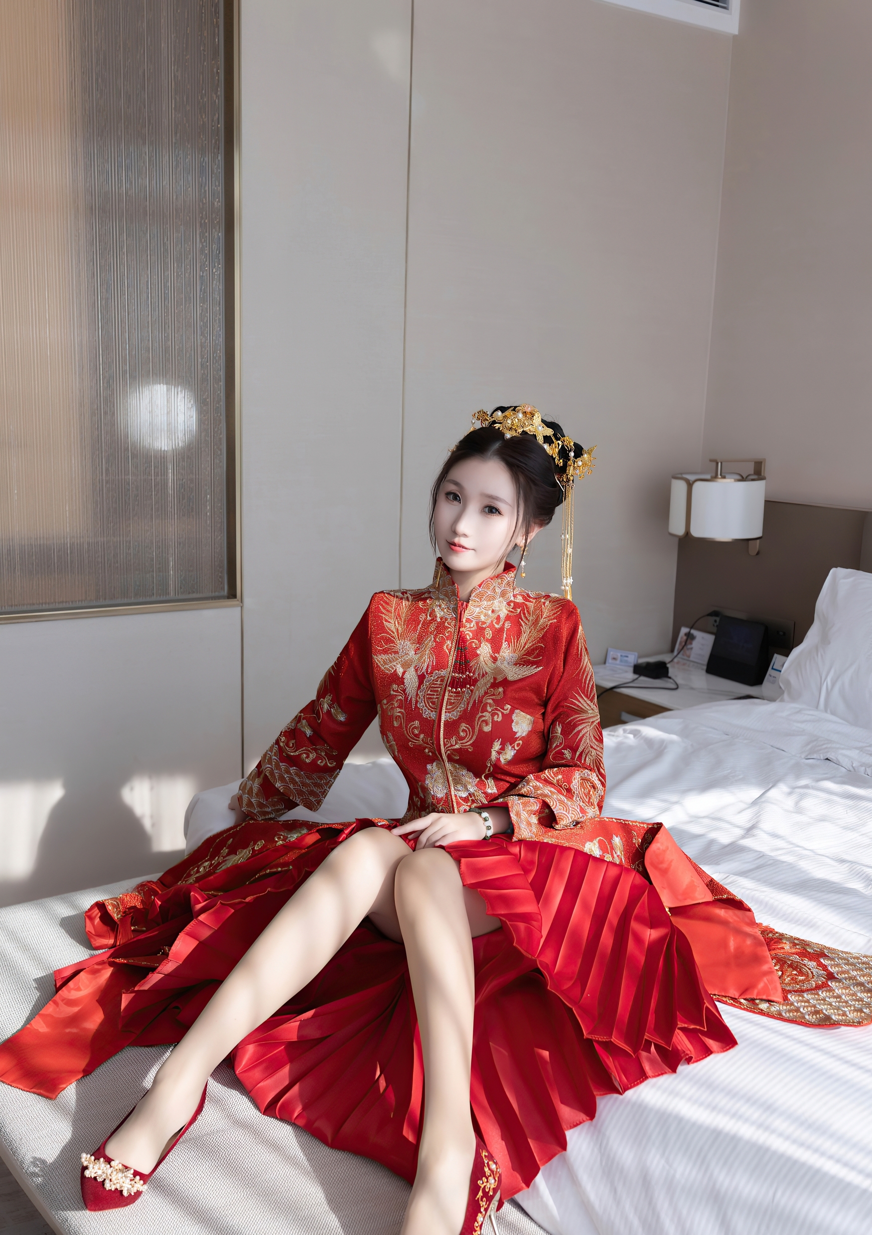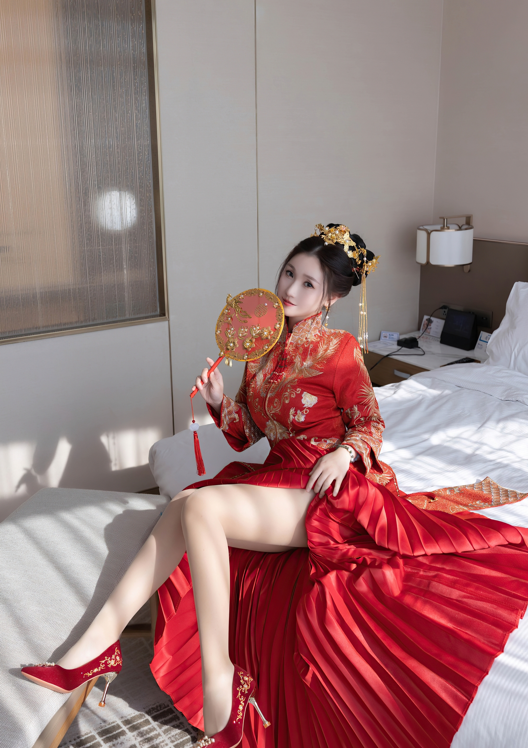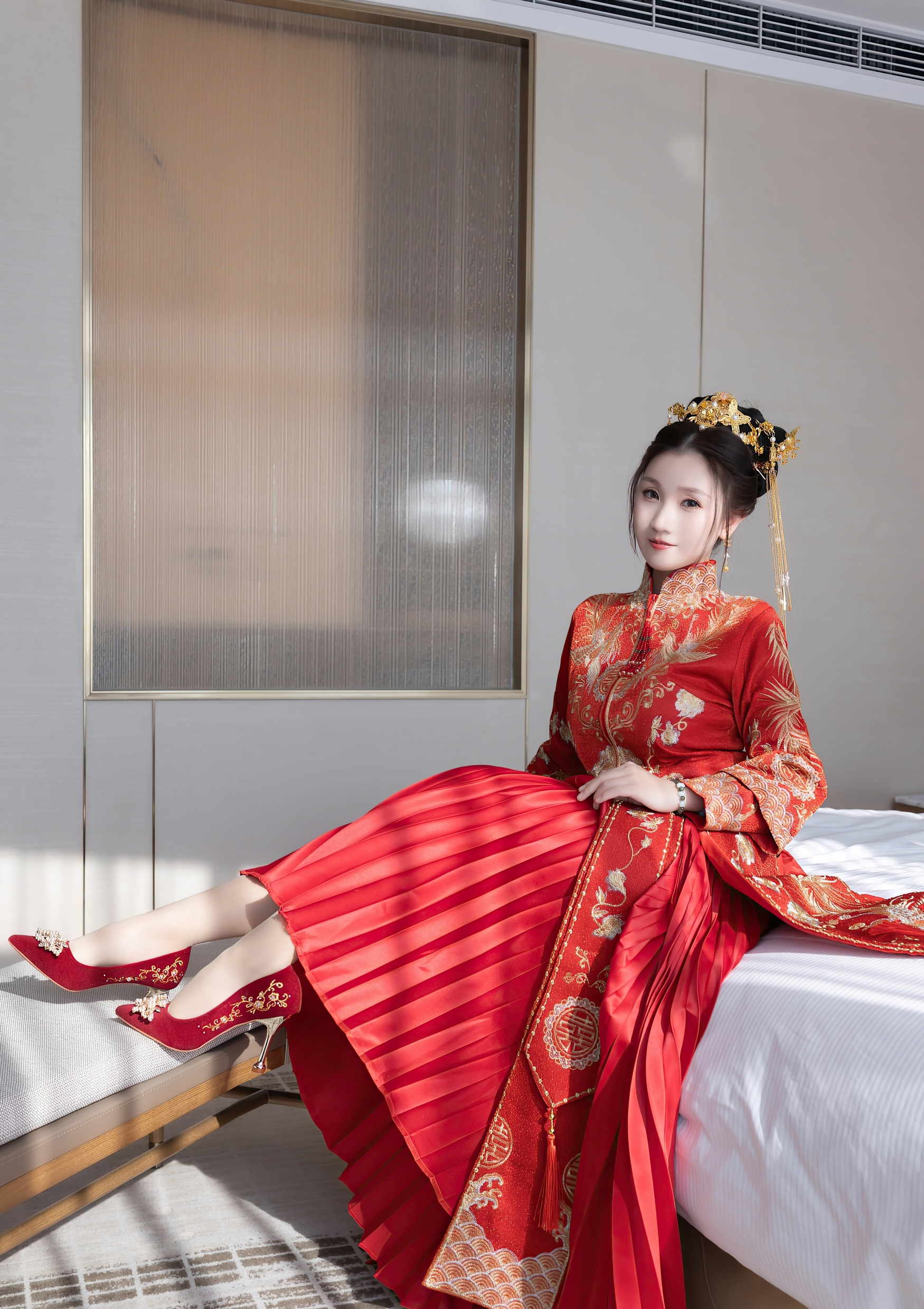 她坐在床沿,双腿微曲,脚尖轻点,一双红缎高跟婚鞋上绣着细密的金线牡丹,宛如踏着喜气而来。阳光穿过白纱窗帘,在她身上投下斑驳光影,红与金交织,像一幅流动的工笔画——是传统与现代的完美融合,是古典与时尚的温柔对话。