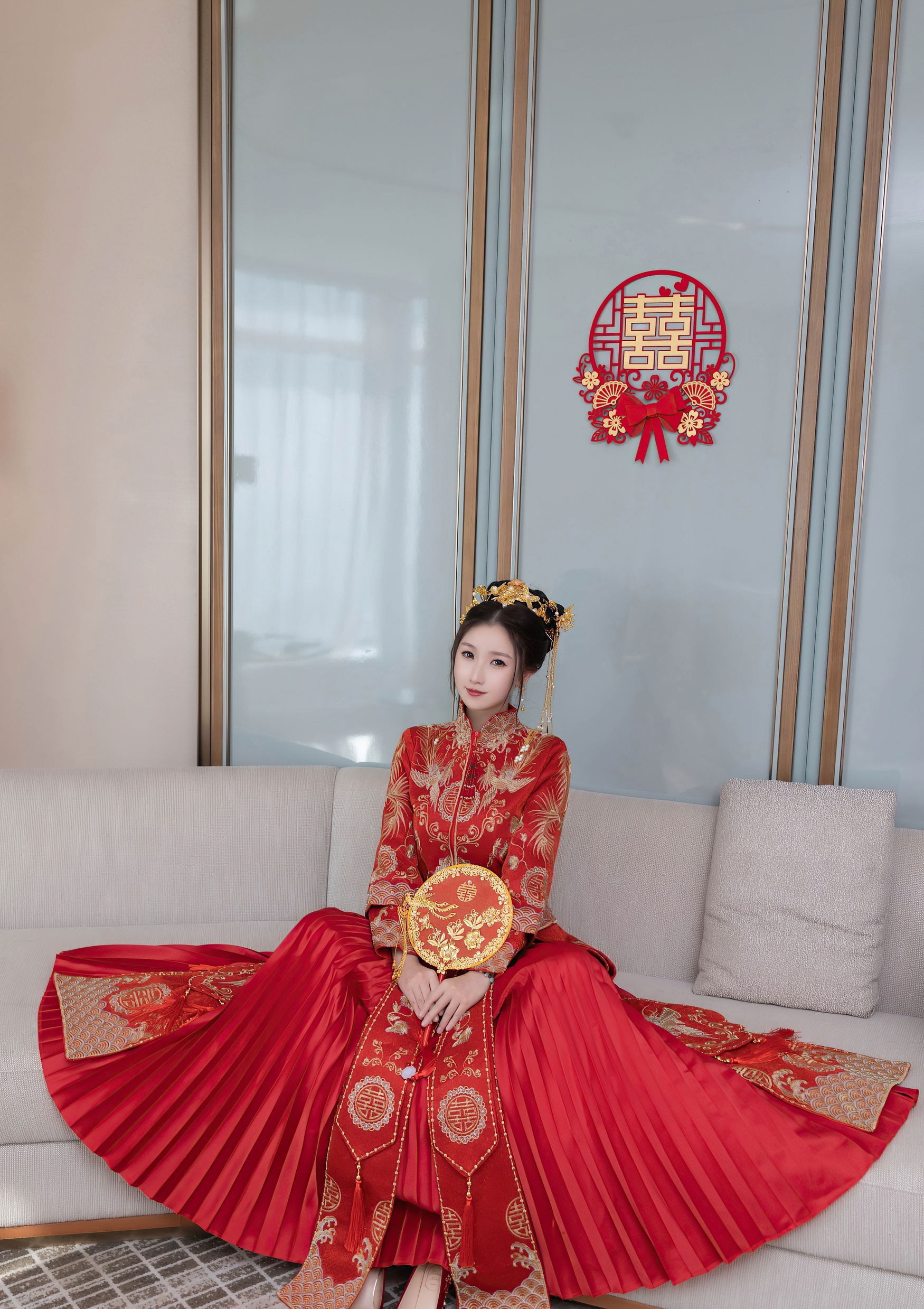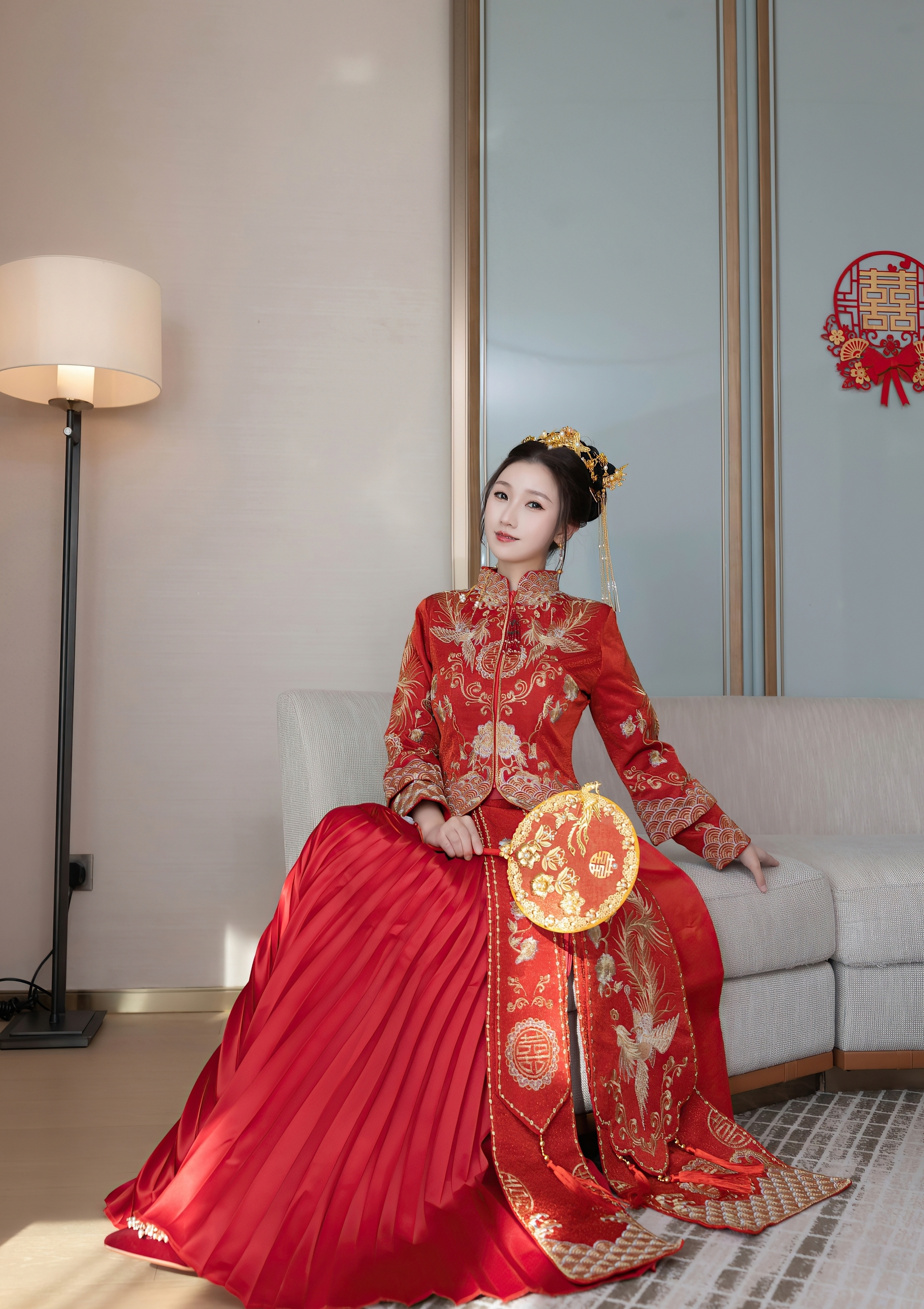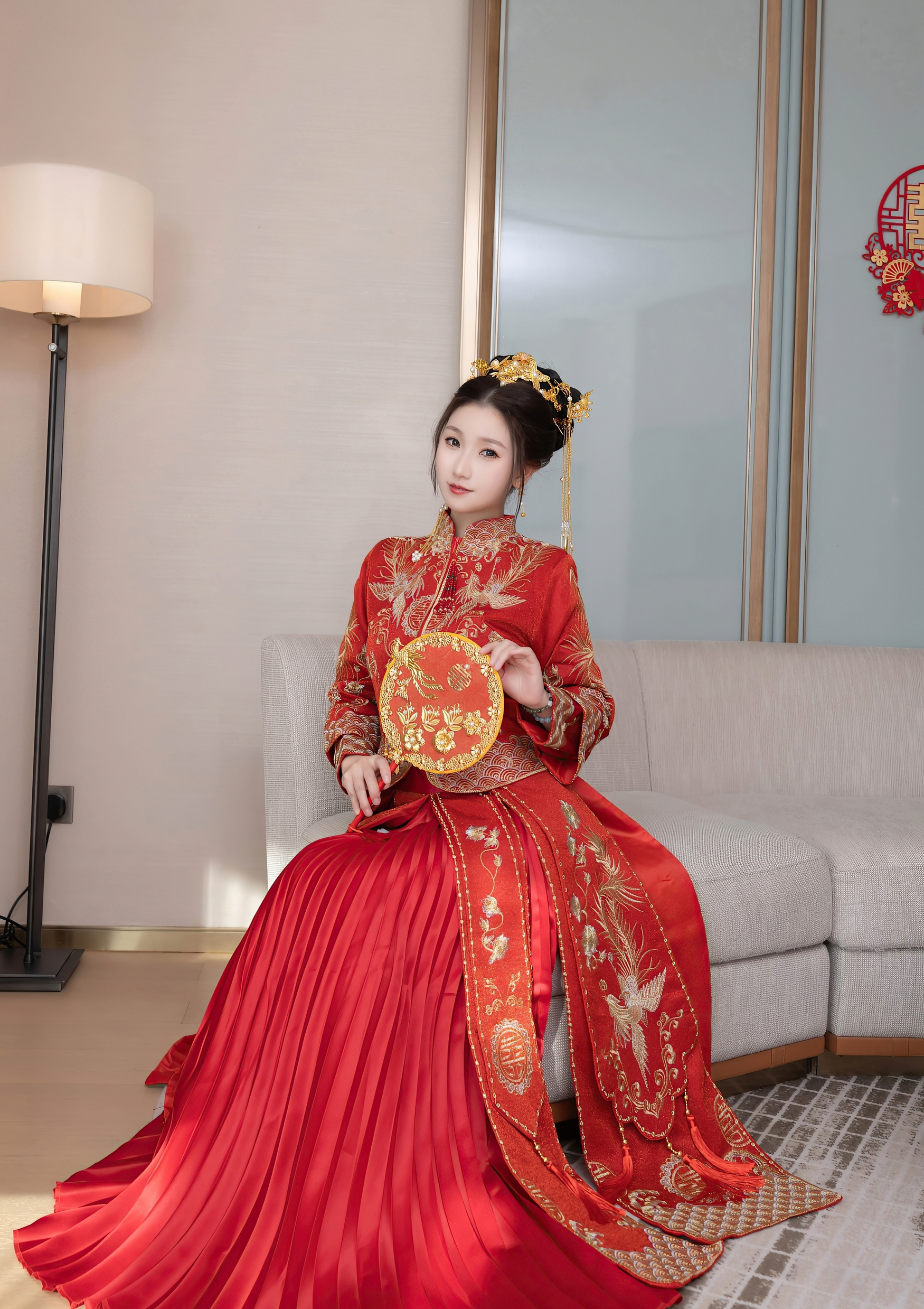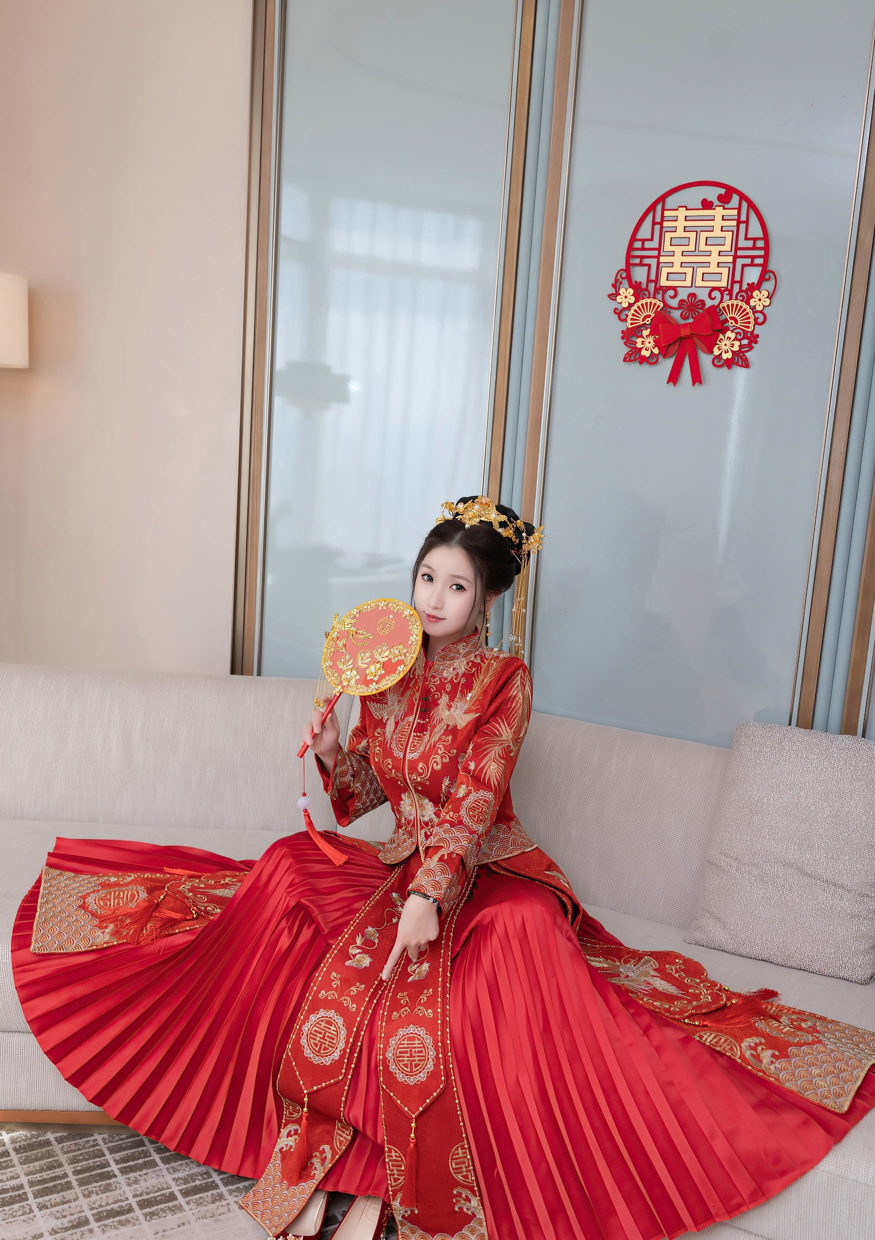 她身着一袭正红秀禾服,金线织就的凤凰在衣上翩跹起舞,祥云环绕,双喜缠枝,每一针每一线皆诉说着古老而深情的祝福。上衣立领盘扣,剪裁合体,勾勒出温婉的肩颈线条;下摆百褶如波,层层叠叠,似红霞铺展于大地,又似春水泛起涟漪。